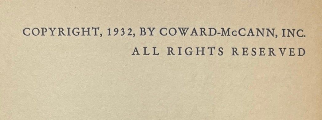 New York: Coward-McCann, Inc, 1932. First Edition. Hardcover. Fine/Near Fine. Fine in a Near Fine jacket, unclipped ($2.00 but with a "49 stamp underneath), faintly toned, bumped and with a few short tears at the top edge. Pink cloth with black ink lettering on the spine and front board. Square and firmly bound with a pink top stain, clean internally. A murdery-mystery novel from the daughter of Robert Frost, the story of a man with terminal cancer who brings together all of his criminal acquaintances for a weekend retreat before releasing his tell-all memoir.