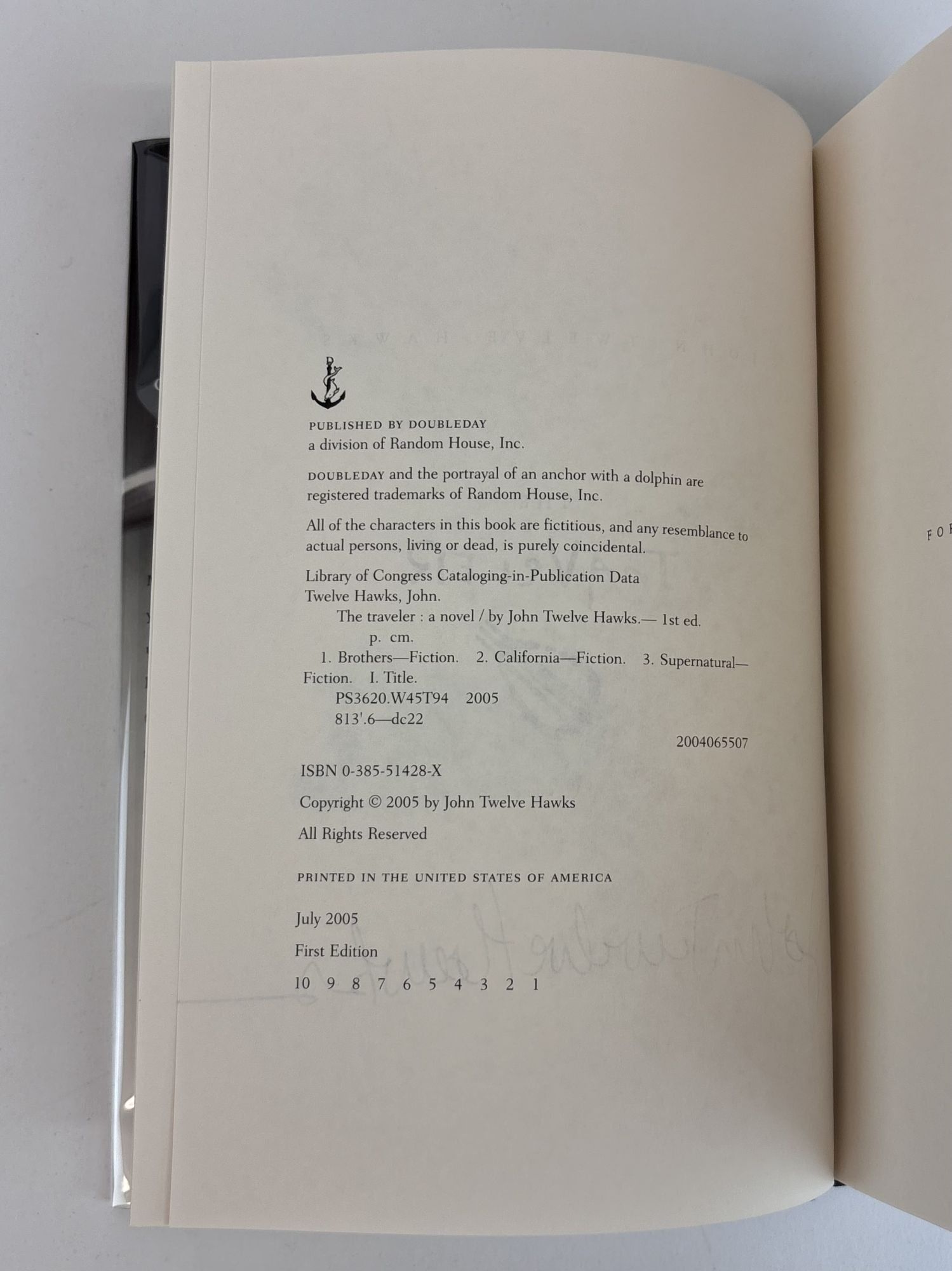 New York, New York: Doubleday, 2005. Limited Edition #338/777. Hardcover. Octavo, 456 pages. In Very Good condition with Near Fine condition dust jacket. Spine is gray and blue with white lettering. Dust jacket protected by mylar covering, price uncut "$24.95" on front flap. Boards have mild shelving wear along extremities. Signed flat on title page by John Twelve Hawks. Shelved in hallway. 1391881. Special Collections.