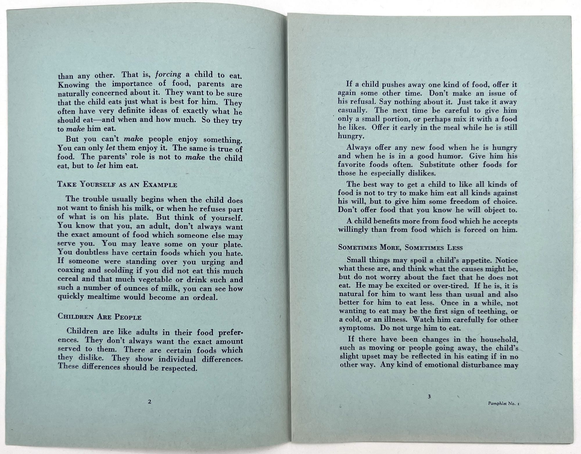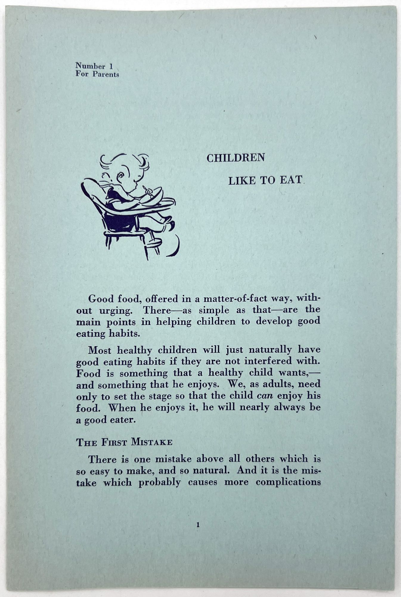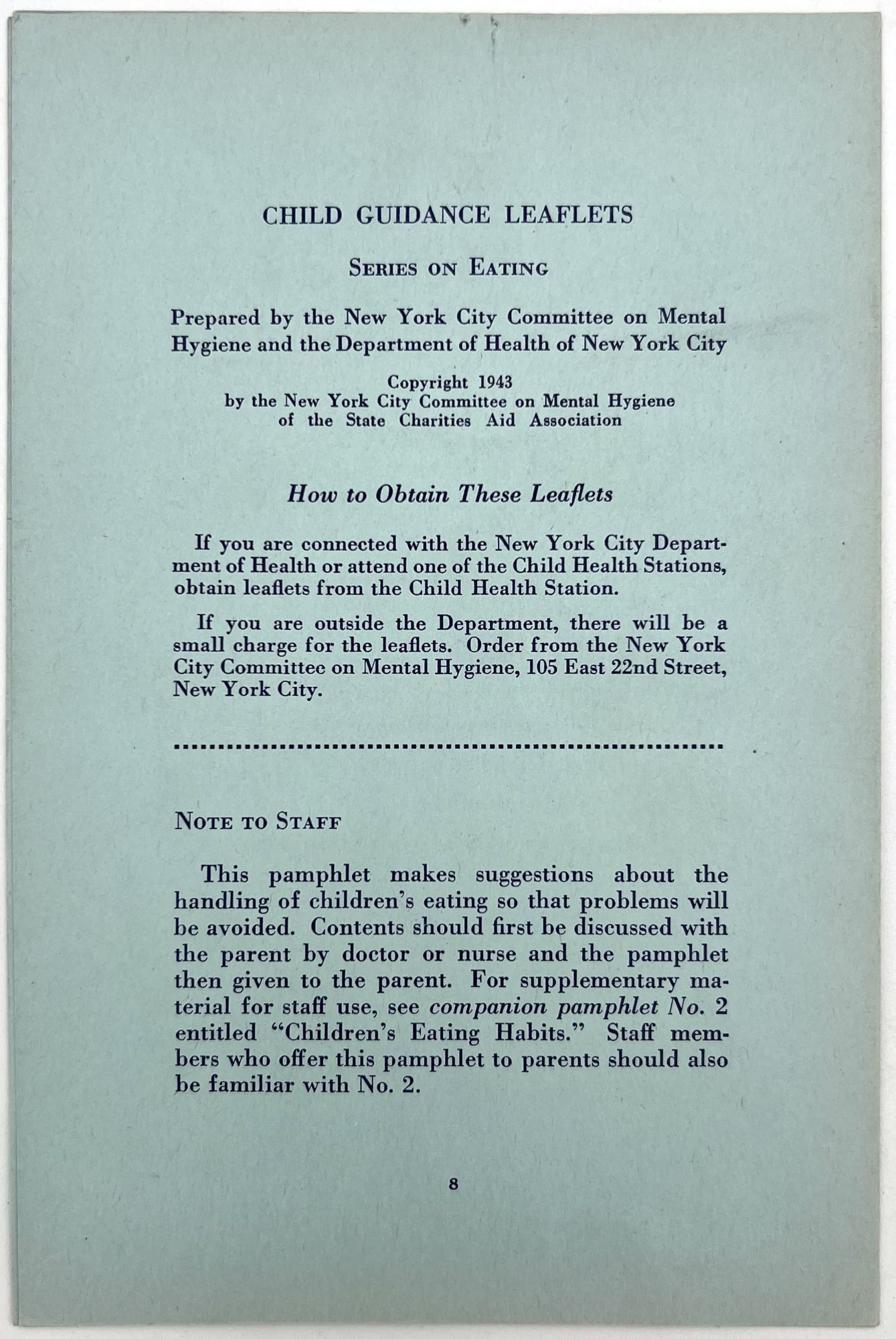 New York, New York: New York City Department of Health, 1943. Near-fine. Lacking at least one pamphlet (no. 6).. A set of nine (9) educational leaflets on early childhood nutrition distributed by the New York City Department of Health in 1943. Includes four (4) pamphlets "for parents" in plain English, and five (5) pamphlets "for staff", i.e. healthcare professionals in the community, in more nuanced language. Each is based on research from preeminent psychologists, pediatricians, and related childcare experts of the time (e.g. Benjamin Spock). The titles include: "Children Like to Eat"; "Children's Eating Habits"; "If Your Child Does Not Eat Well"; "Eating Problems of Children"; "Dr. Davis' Experiments in the Self Selection of Food"; "Where Do Parents Come In"; "Feeding Patterns in Infants"; "Now Your Baby Is On A Bottle"; and "Now Your Baby Is Ready for Solids". Each ranges in length from 4 to 8 pages, and measures approx. 8.5" by 5.5"; they are unbound as issued.