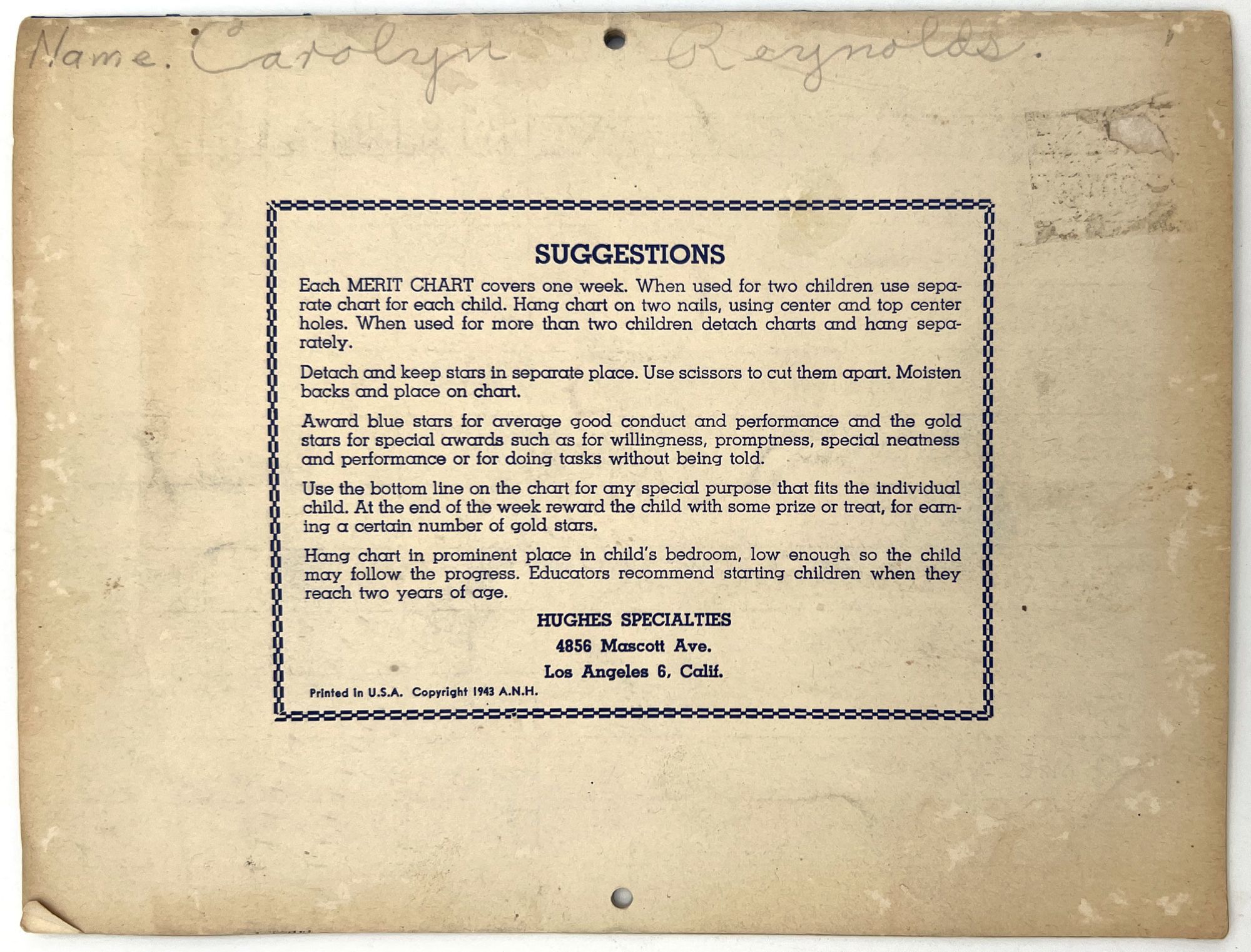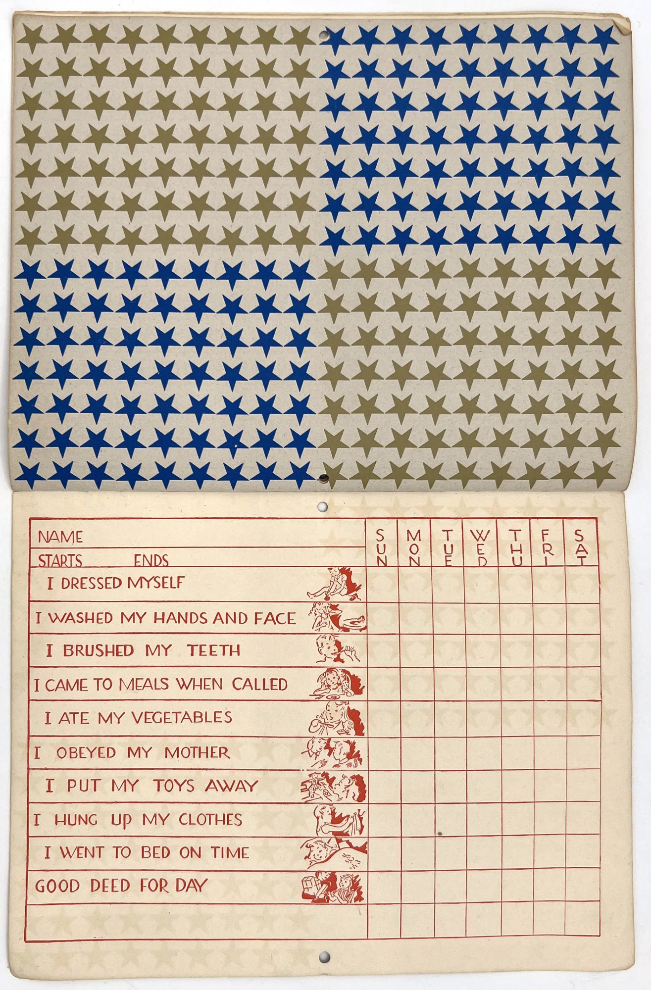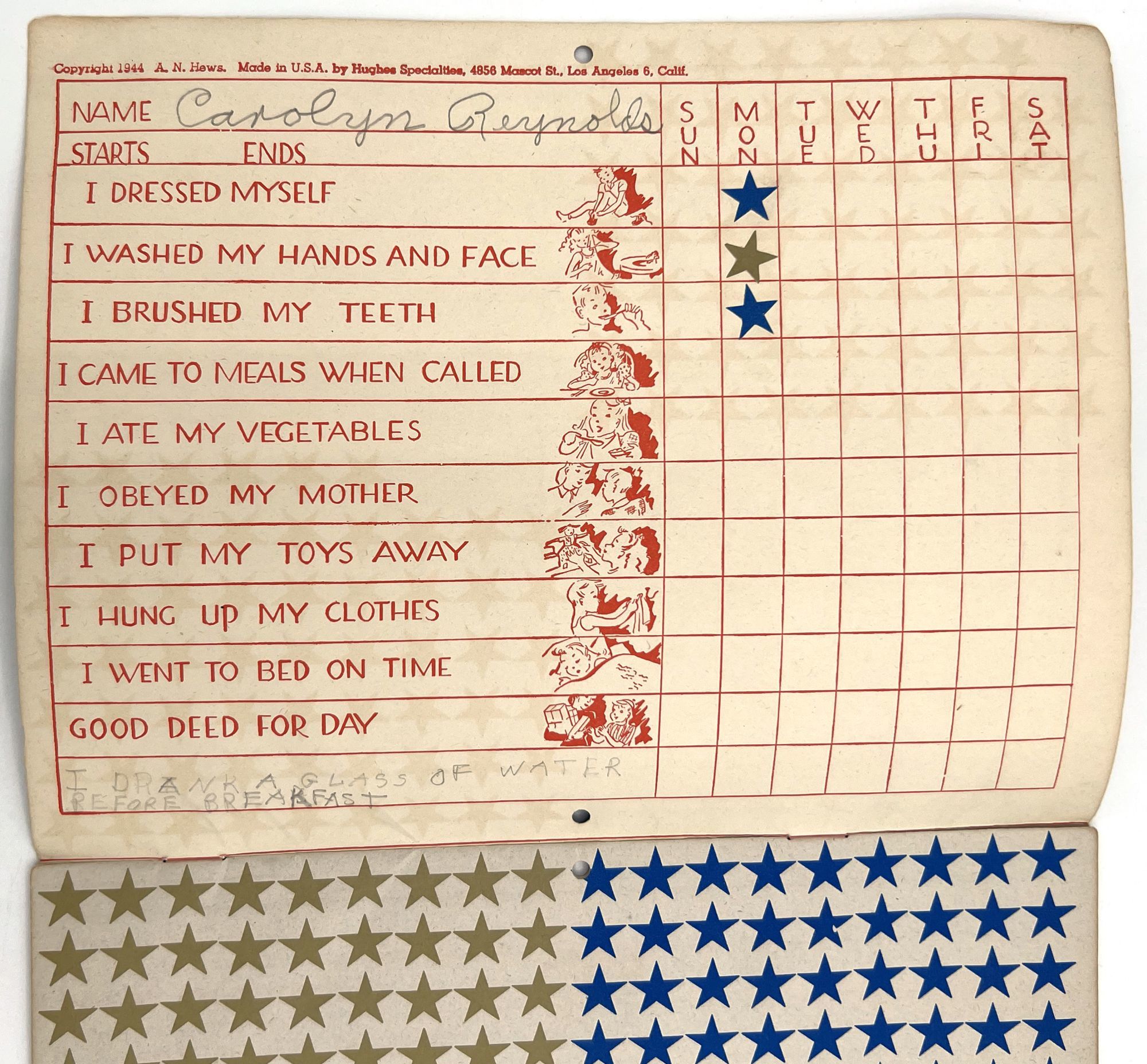 Hughes Specialties: Los Angeles, California, 1944. Very good. Light dust soiling.. A charming 10-week merit chart for kids to use to track chores and tasks, including hundreds of stars to cut out and paste next to completed tasks. This example has been partially used and has been signed in pencil by a young girl named Carolyn Reynolds. She has filled in the final blank with her own daily goal: "I DRANK A GLASS OF WATER BEFORE BREAKFAST". She has cut out three stars and used them for Monday's accomplishments: "I dressed myself"; "I washed my hands and face"; and "I brushed my teeth". Note the lack of stars for "I obeyed my mother" and "I ate my vegetables". Single vol. (7" by 9.25"), pp. [16], in original printed illus. self wrps with blue stars on the front. An example of incentive based learning. As often happens, it only lasted for a day.
