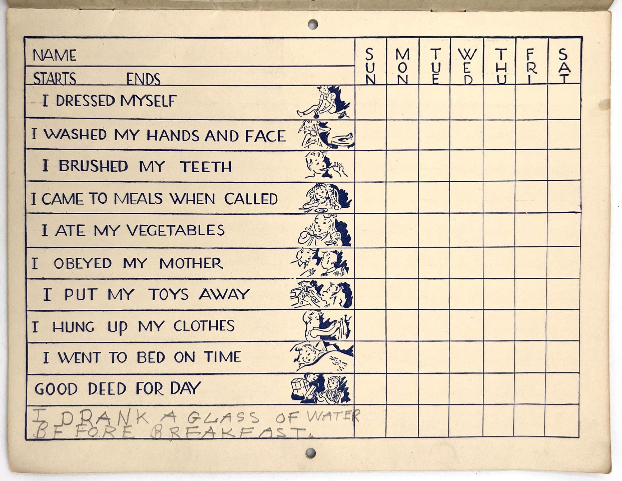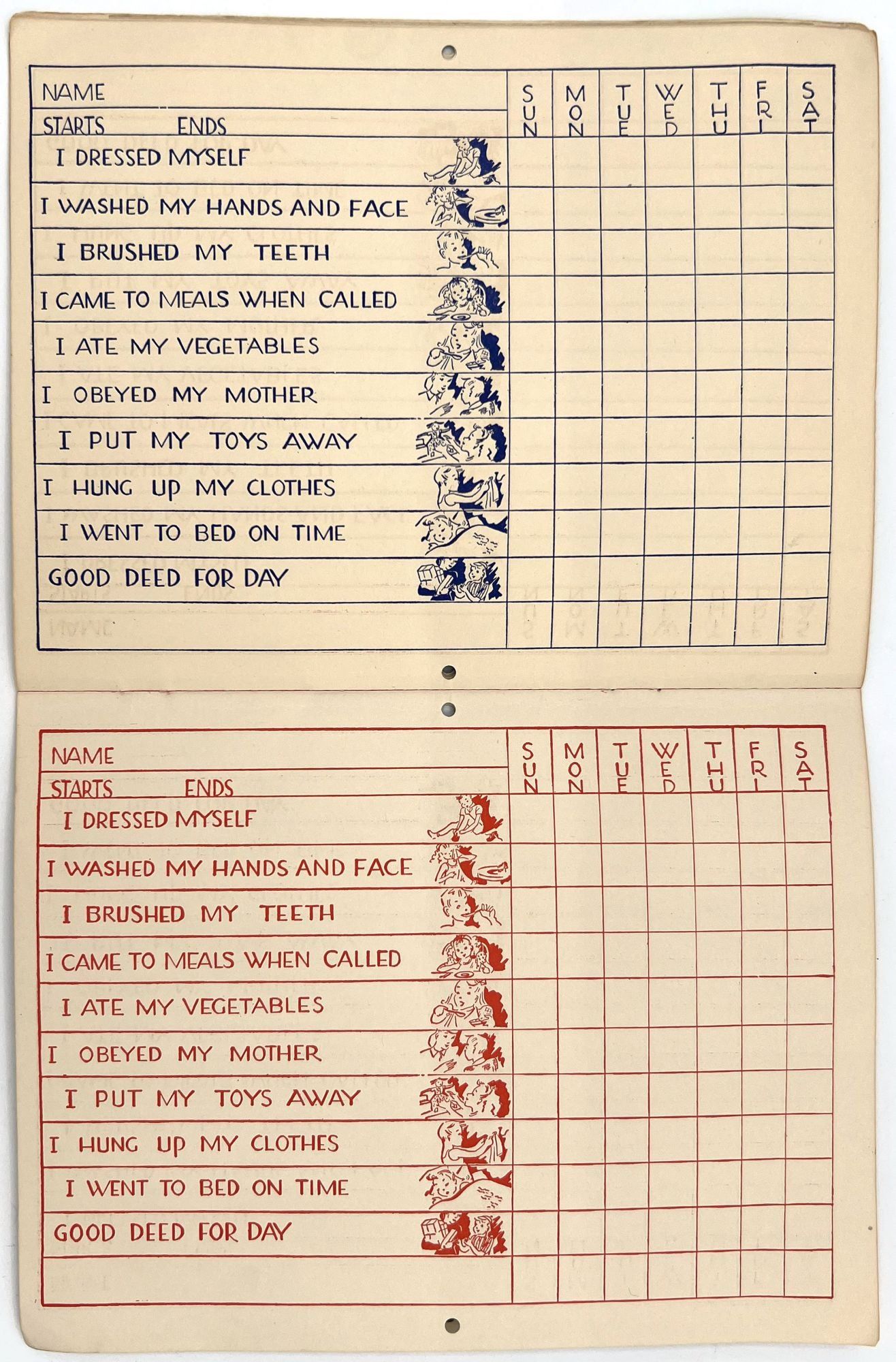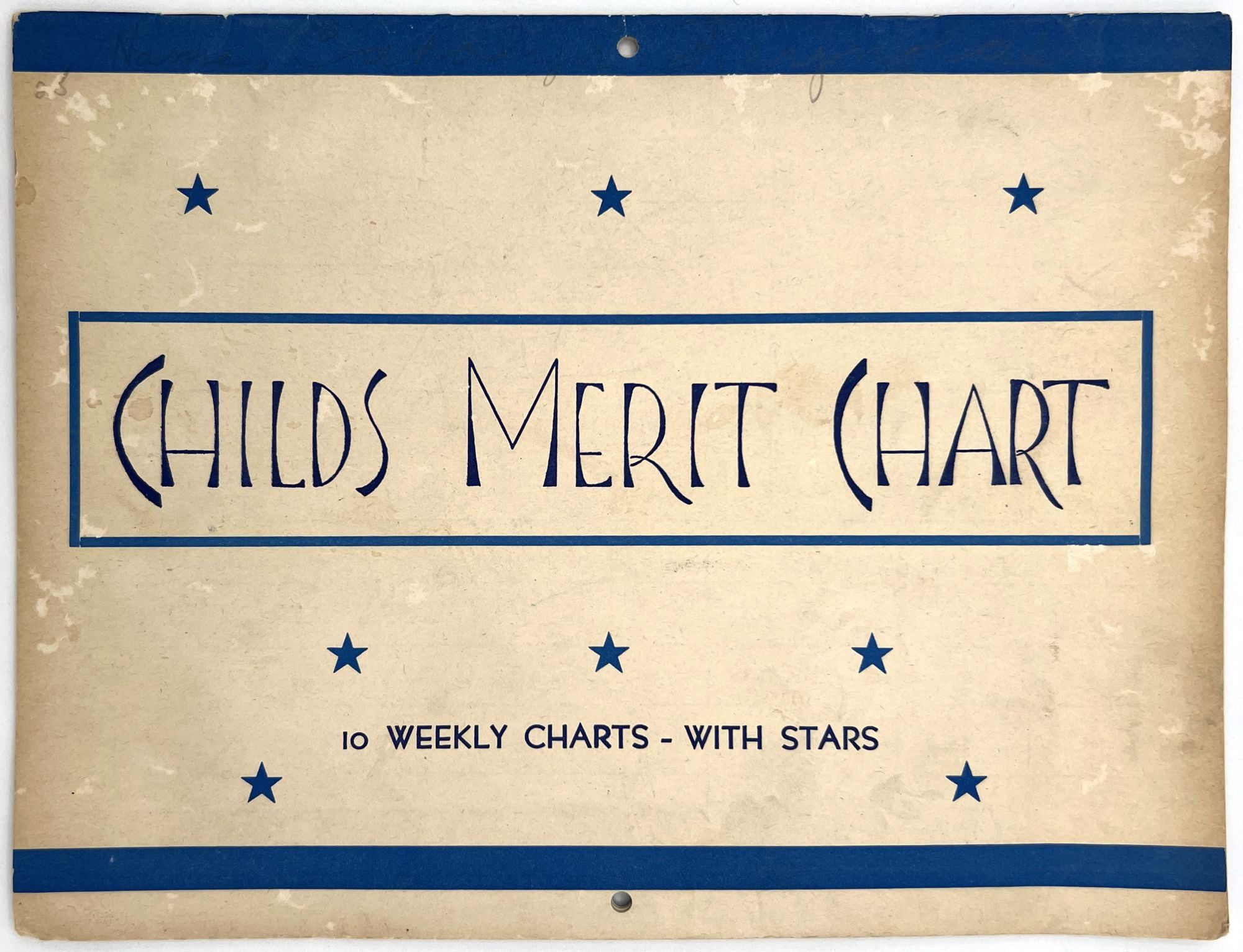 Hughes Specialties: Los Angeles, California, 1944. Very good. Light dust soiling.. A charming 10-week merit chart for kids to use to track chores and tasks, including hundreds of stars to cut out and paste next to completed tasks. This example has been partially used and has been signed in pencil by a young girl named Carolyn Reynolds. She has filled in the final blank with her own daily goal: "I DRANK A GLASS OF WATER BEFORE BREAKFAST". She has cut out three stars and used them for Monday's accomplishments: "I dressed myself"; "I washed my hands and face"; and "I brushed my teeth". Note the lack of stars for "I obeyed my mother" and "I ate my vegetables". Single vol. (7" by 9.25"), pp. [16], in original printed illus. self wrps with blue stars on the front. An example of incentive based learning. As often happens, it only lasted for a day.