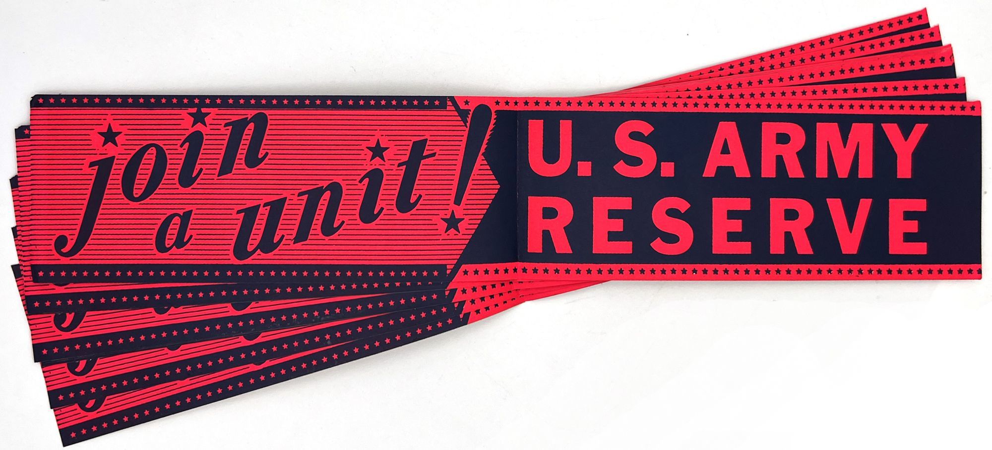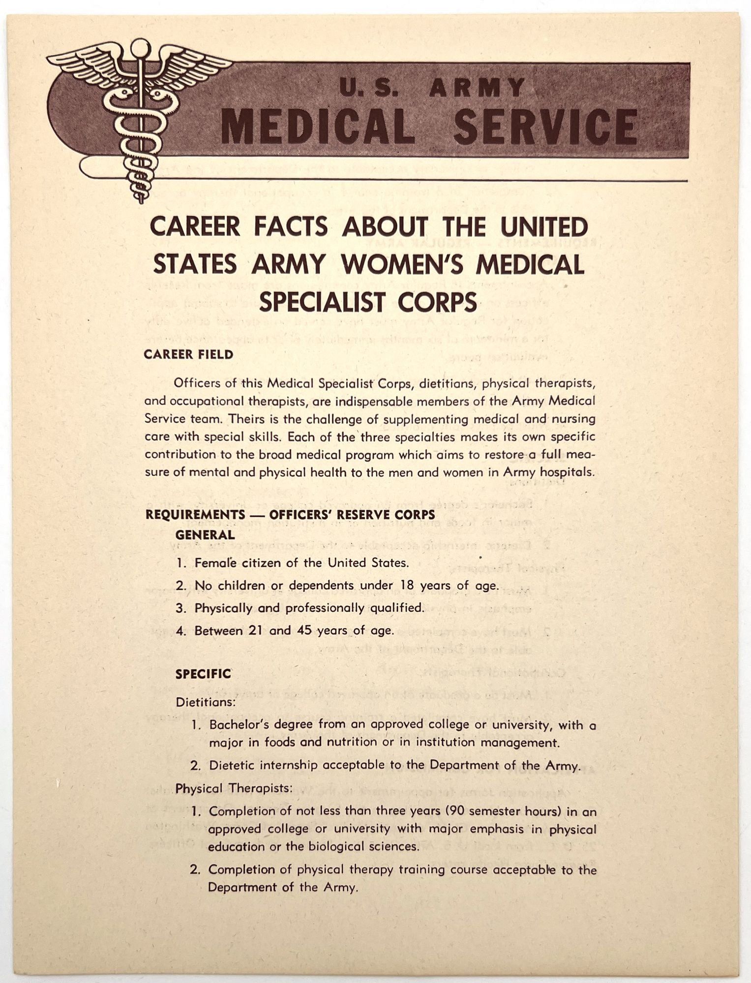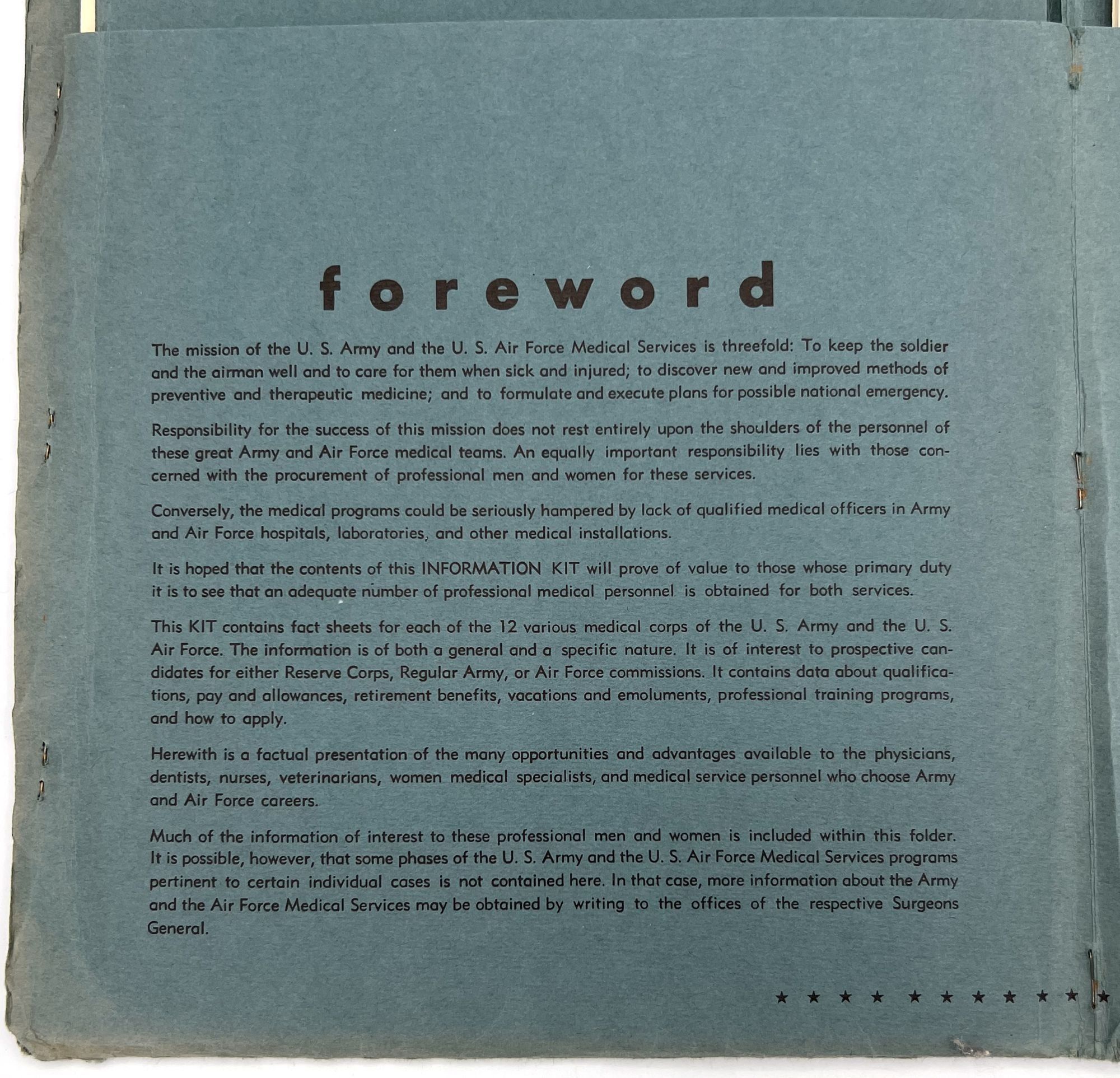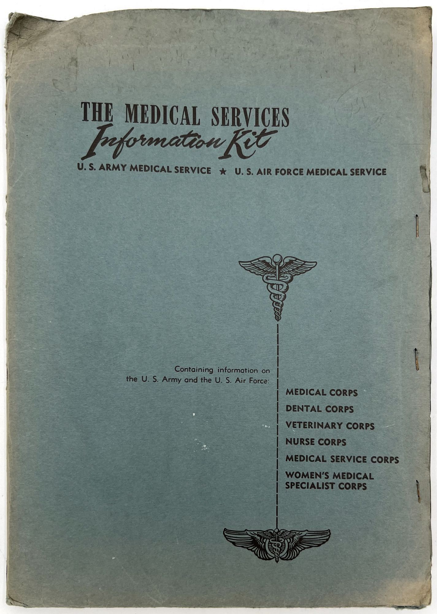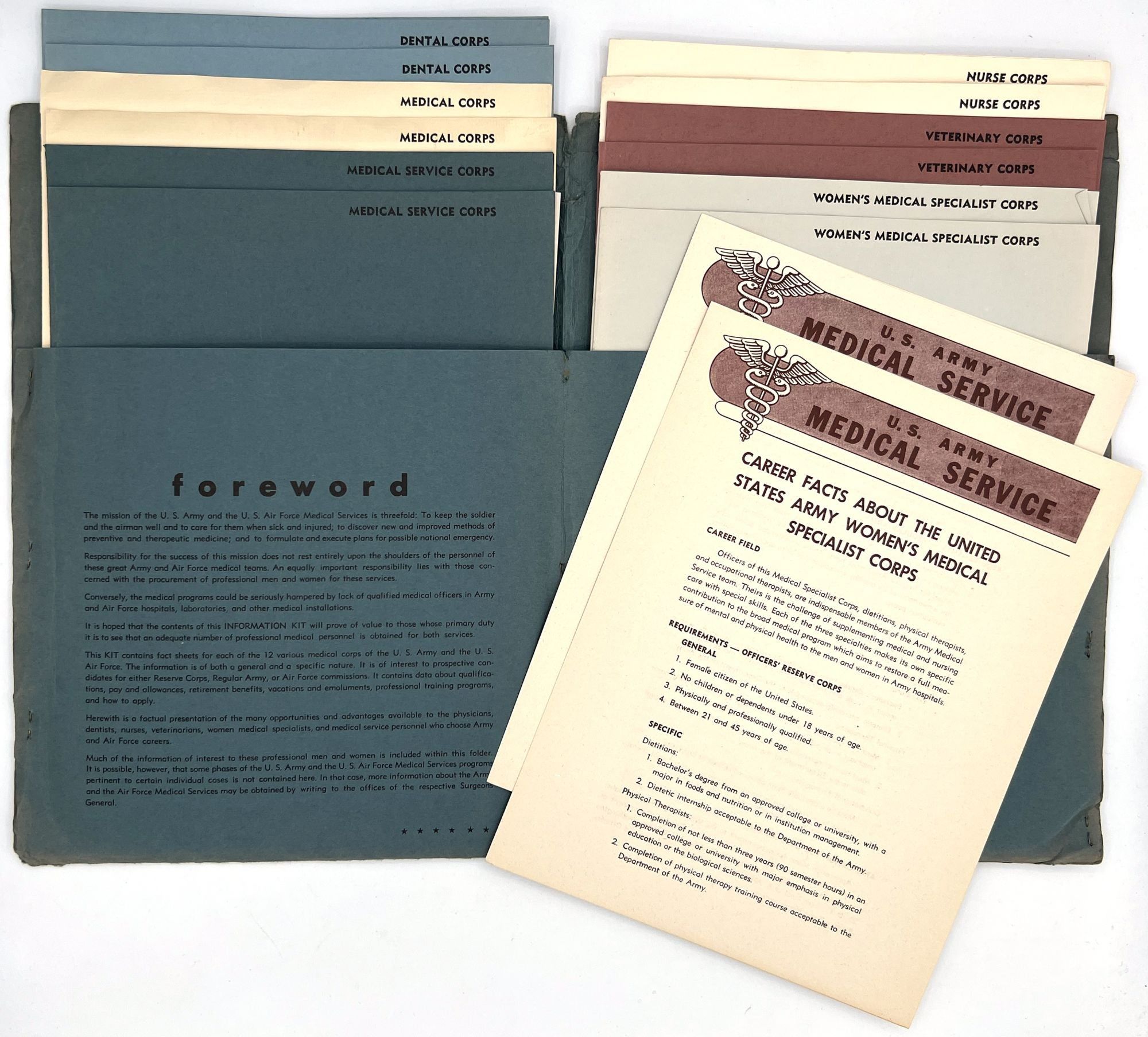 N.pl: U.S. Army and Air Force Medical Services, 1950. Very good. Sunning and wear to extremities of folder. Could be missing one or two information sheets, but appears largely complete. Pencil to upper cover of folder. An expansive information packet for recruitment officers, published by the U.S. Army and Air Force Medical Services. Offers information on the following corps: Medical Corps; Medical Service Corps; Dental Corps; Veterinary Corps; Nurse Corps; and Women's Medical Specialist Corps. The packet would have been distributed to recruiters, and contains printed 8.5" by 11" folders for each of the corps, each containing printed bifolia with information for interested recruits, each measuring approx. 10.5" by 8". The information provided includes: a brief overview of the corps; requirements for entry; basic and professional training offered; assignment information; pay and allowances. All contained in 13" by 9.5" printed folder with forward inside: "Responsibility for the success of [the military's] mission does not rest entirely upon the shoulders of the personnel of these great Army and Air Force medical teams. An Equally important responsibility lies with those concerned with the procurement of professional men and women for these services ... It is hoped that the contents of this INFORMATION KIT will prove of value to those whose primary duty it is to see that an adequate number of professional medical personnel is obtained by both services." In total, there are twelve (12) folders for each of the six (6) corps, and seventeen (17) information sheets, all housed in the original folder. Also included are nine (9) brightly colored red and blue sticker signs, all unused, for recruitment events reading "Join a unit! U.S. Army Reserve