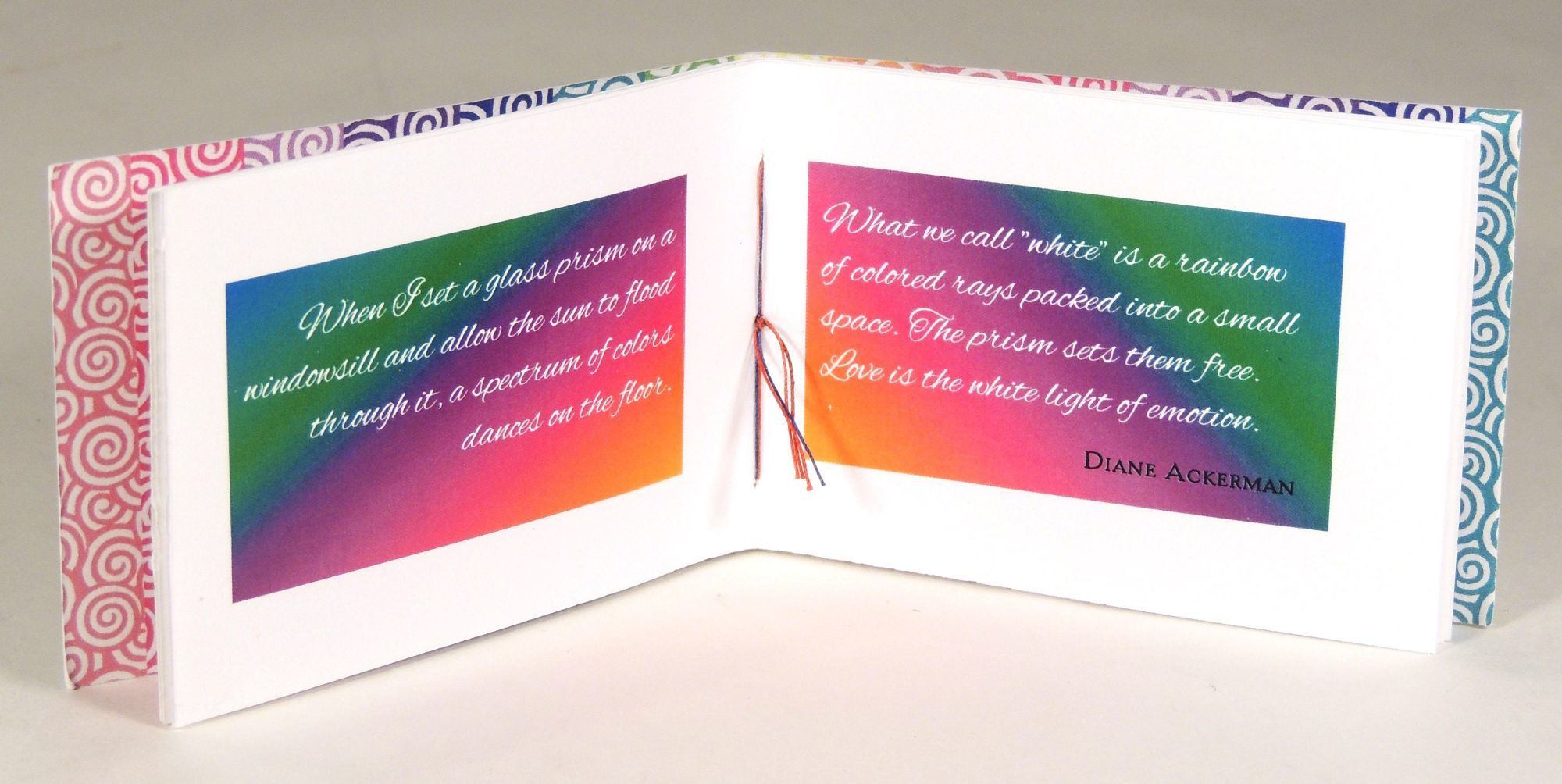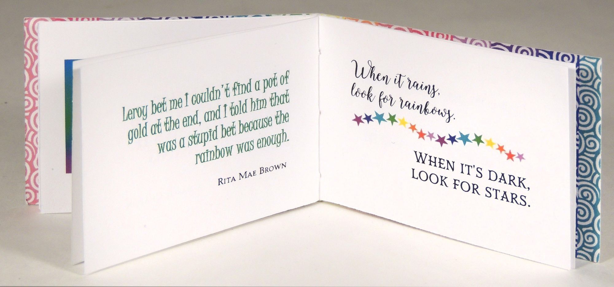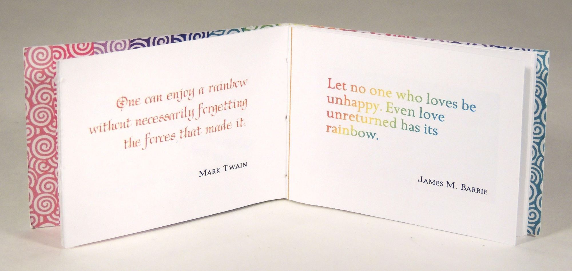 Hyattsville, MD: Rebecca Press, 2018. Paperback. Fine. Paperback. 1 of 100 copies. Established in 1980 by Rebecca Bingham, the Rebecca Press publishes primarily miniature books. This miniature features quotes about rainbows from various famous people including Cezanne, Twain, Maya Angelou, Charlie Chaplin, and more. It is bound in stiff paper wrappers with a rainbow design and black title to front cover. The interior is printed in full color. Likely created as a keepsake for the 2018 Minature Book Conclave. She also made a more substantial miniature book in 2018 titled "Defining the Rainbow." [16 pages.] Size: 2 x 3 inches. MINI/011425.