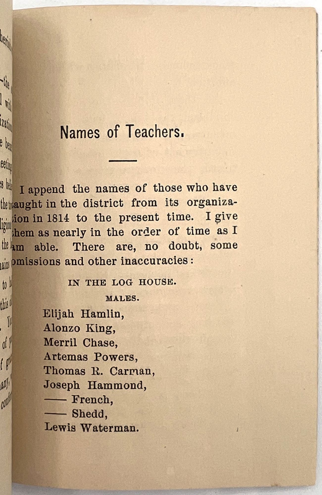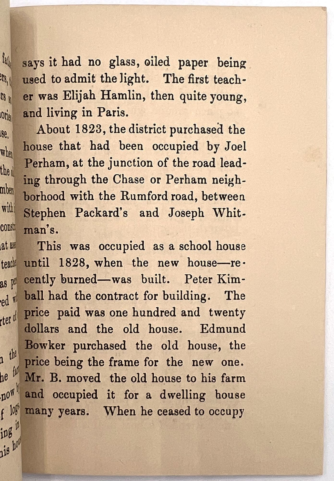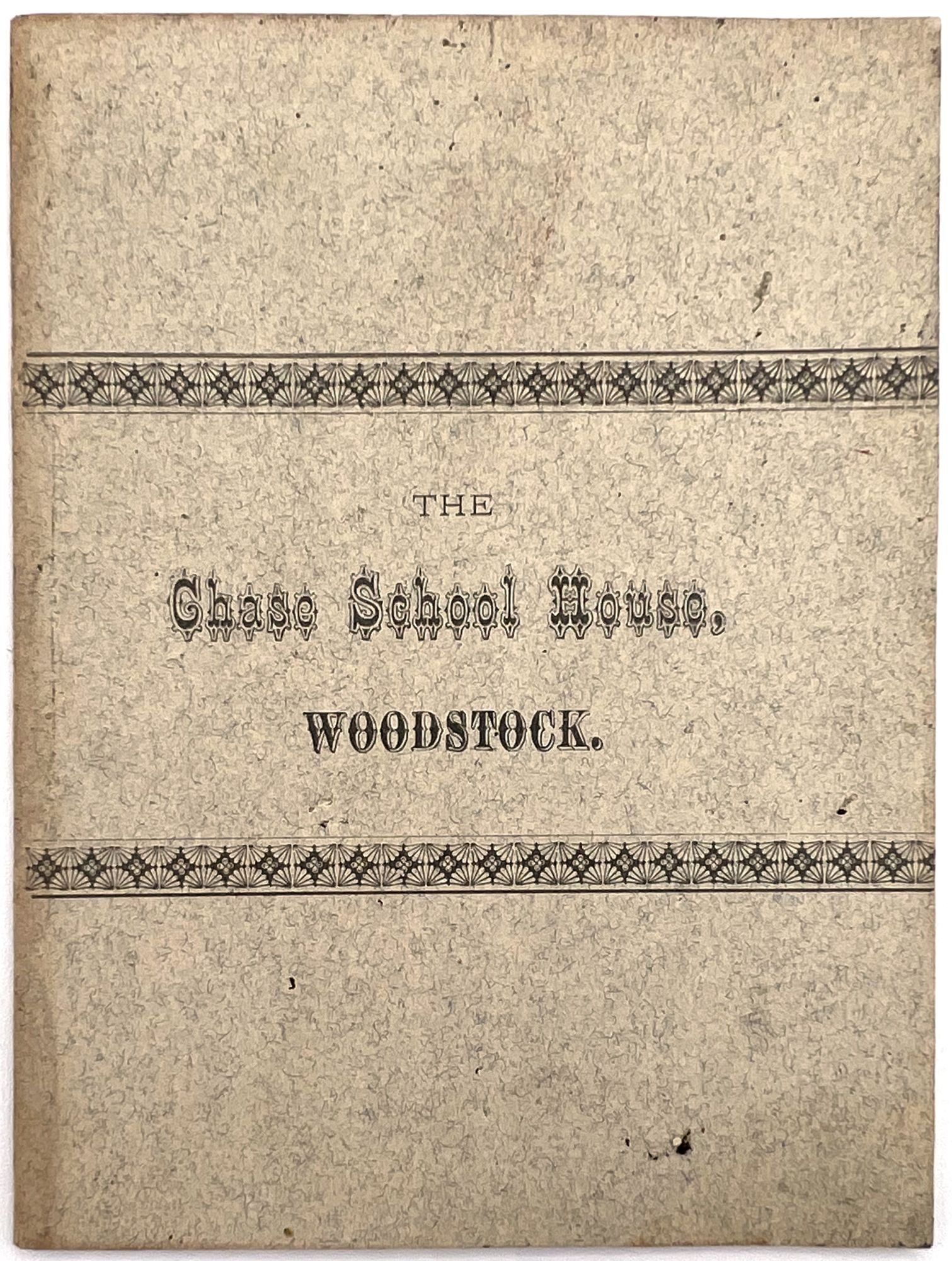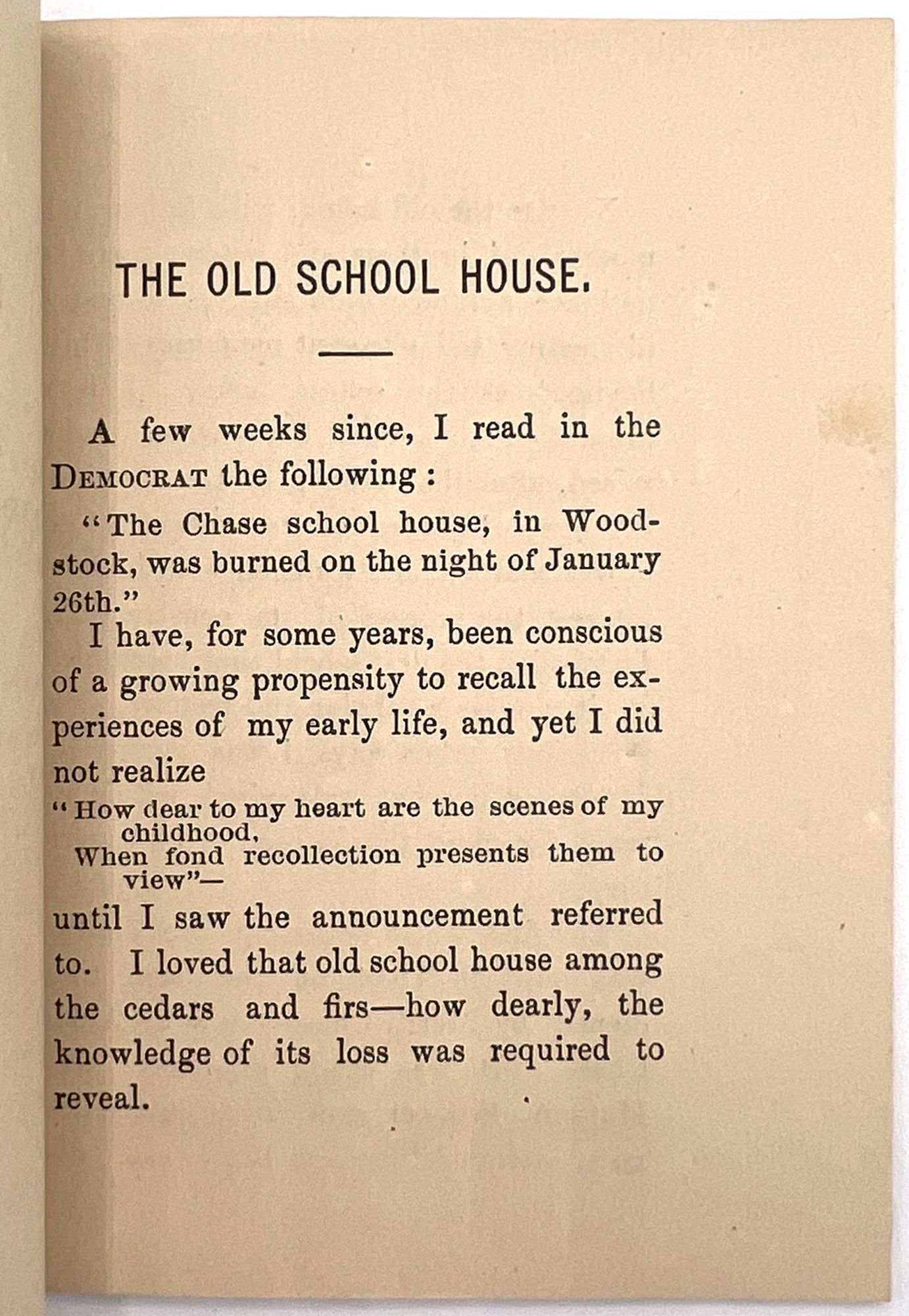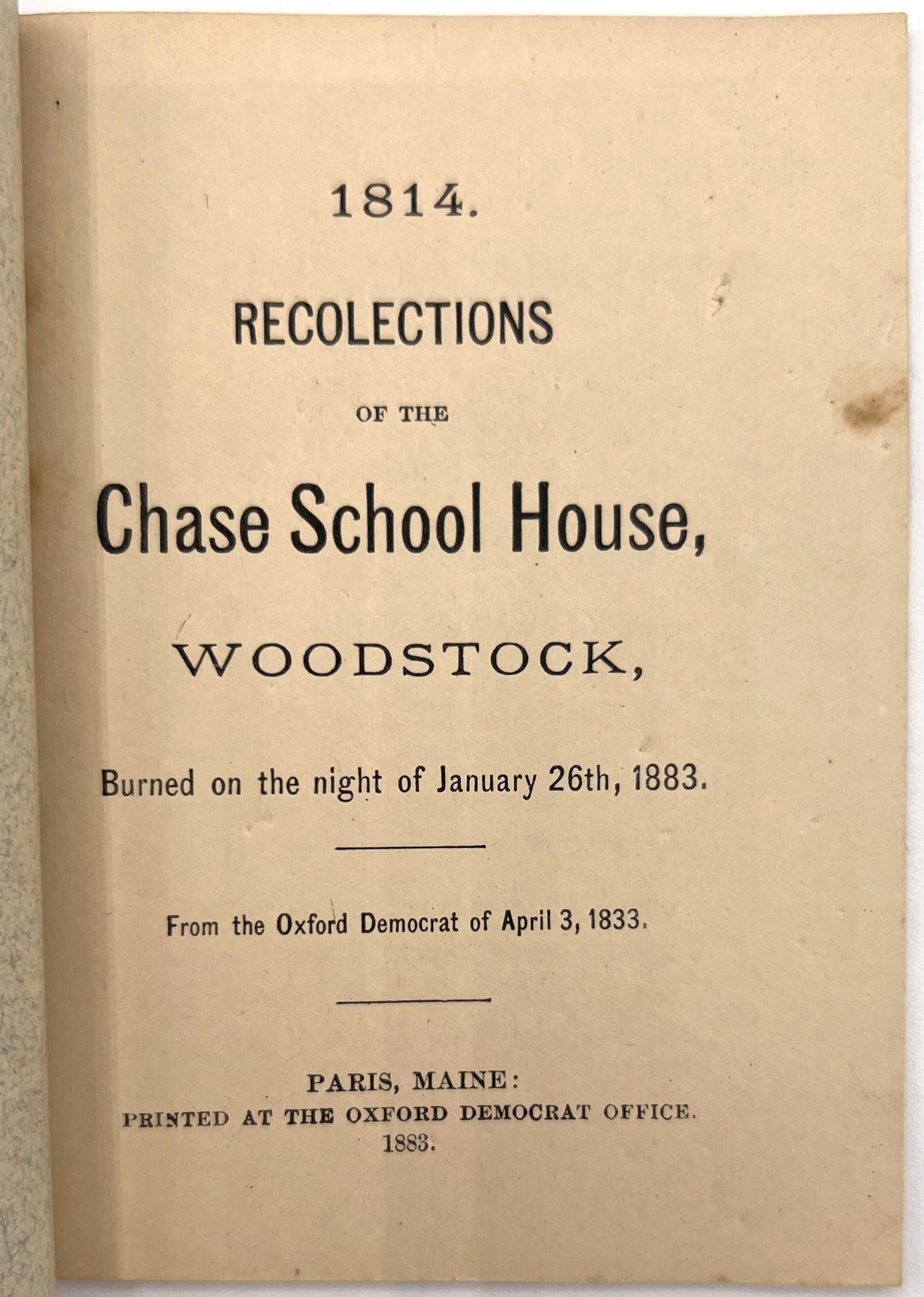 Paris, Maine: The Oxford Democrat, 1883. Very good. Minor staining, toning.. An offprint, originally published in the April 3rd, 1883 issue of the Oxford Democrat, of "Recolections [sic] of the Chase School House, Woodstock [Maine]" which burned to the ground on January 26th, 1883. Includes a listing of all of the teachers employed by the school in all of its locations over the years "from its organization in 1814 to the present time" divided by gender. The recollections relay important historical and anecdotal information about the school, as well as its curriculum. Mentions a local conflict over the issue of temperance. Single vol. (4.5" by 3.5"), pp. [28], original printed wrps.