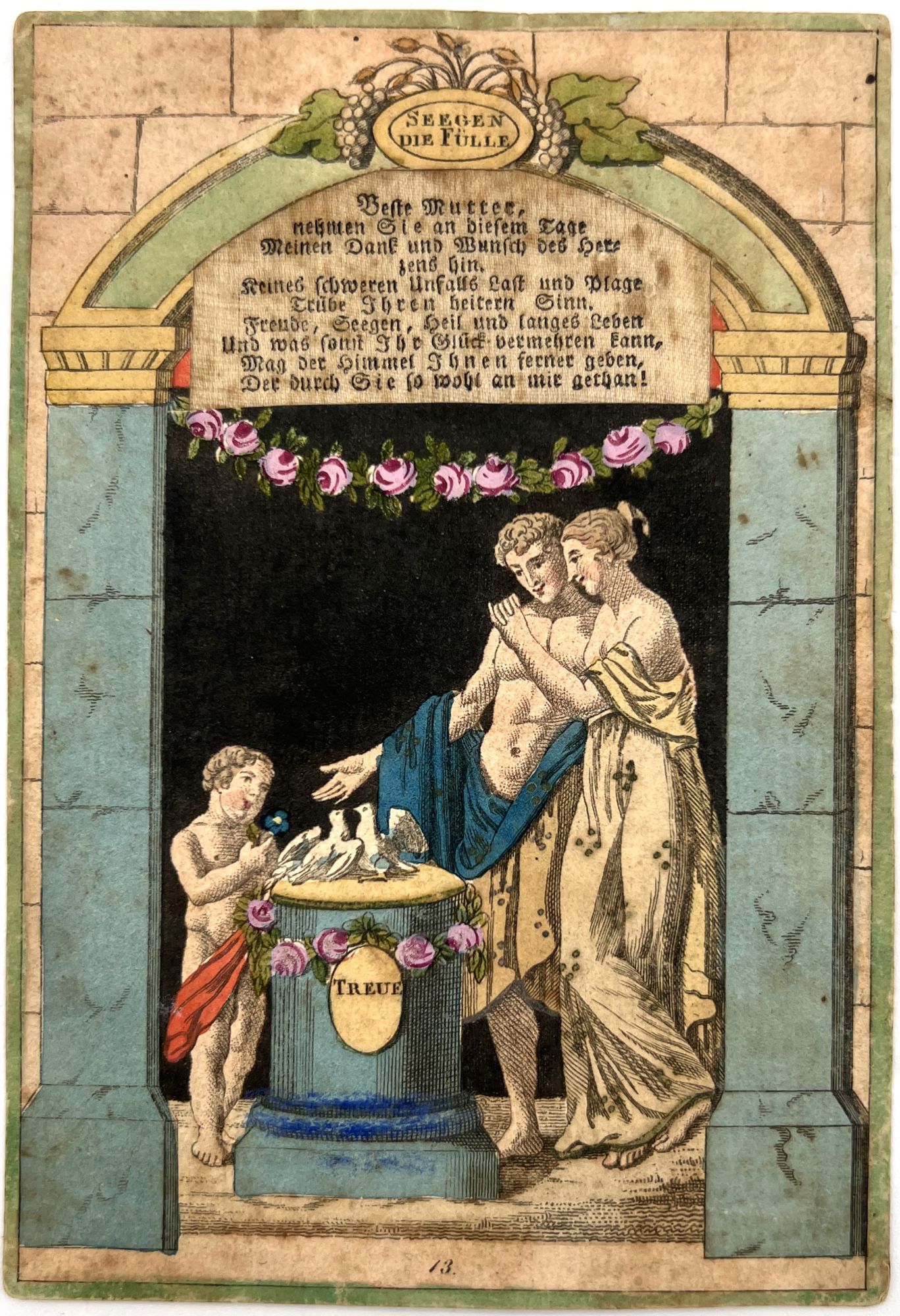 Germany: N.p., Late 8th cent. Good. Light dust soiling, spotting. Damage from old adhesive to verso.. A handsome early example of a hand-colored lithographed greeting card from Germany, with a message printed on silk inset at the top. The message begins, "Dear Mother, accept my thanks and wish of peace on this day" and goes on to wish her joy, happiness, and blessings. A medal at the top of the arch reads "Seegen die Fulle" ("see the abundance"). The image below the arch depicts a couple in classical garb with a putti, gesturing towards two doves resting on a plinth that reads "Treue" ("Loyalty"). Measures approx. 5.5" by 3.75
