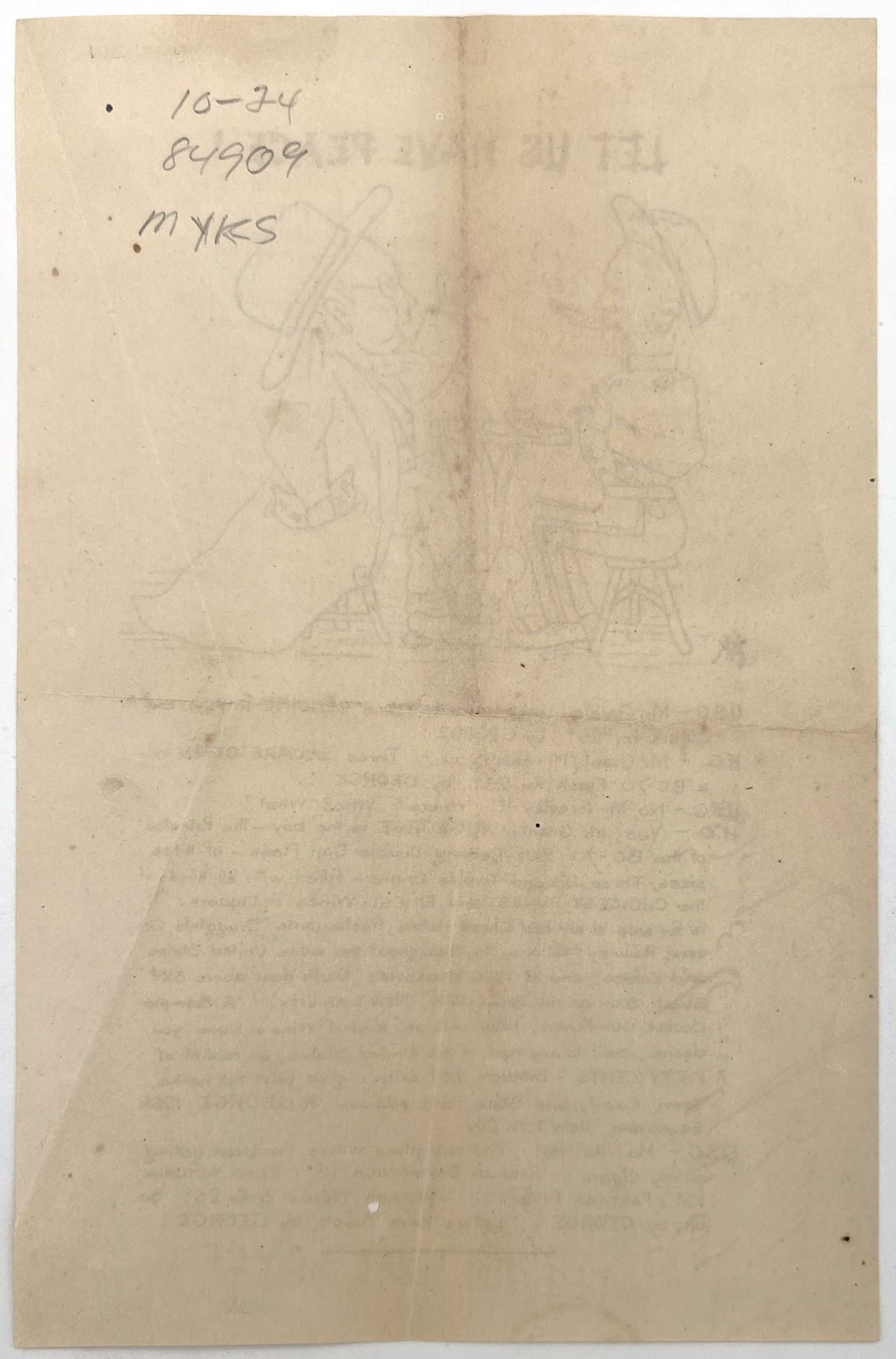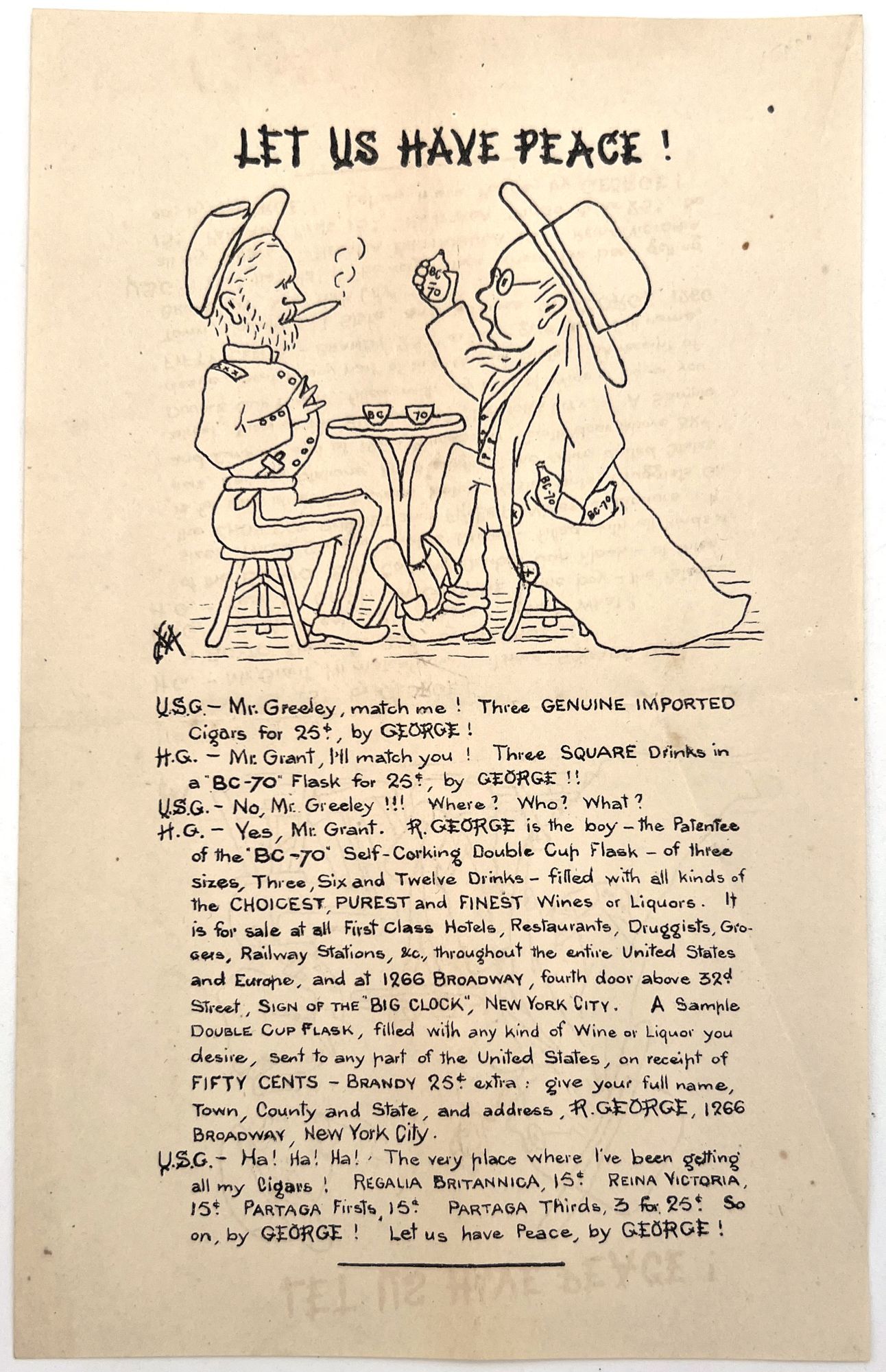 New York, New York: R. Grant, 1872. Very good. Toned with letter folds/creasing, a couple spots.. A small lithographed leaflet (9" by 5.75") with political cartoon and caption showing the two 1872 Presidential candidates finding common ground in cigars and booze. Distributed as an advertising leaflet by R. George of New York to promote his business selling cigars and flasks at 1266 Broadway. The image shows Ulysses S. Grant on the left, smoking a cigar, and his opponent Horace Greeley on the right, with a stash of flasks in his pocket and holding one aloft. They share a drink at a table. Their exchange is written below the image. "Let Us Have Peace", emblazoned at the top, was Grant's political campaign slogan in 1868.
