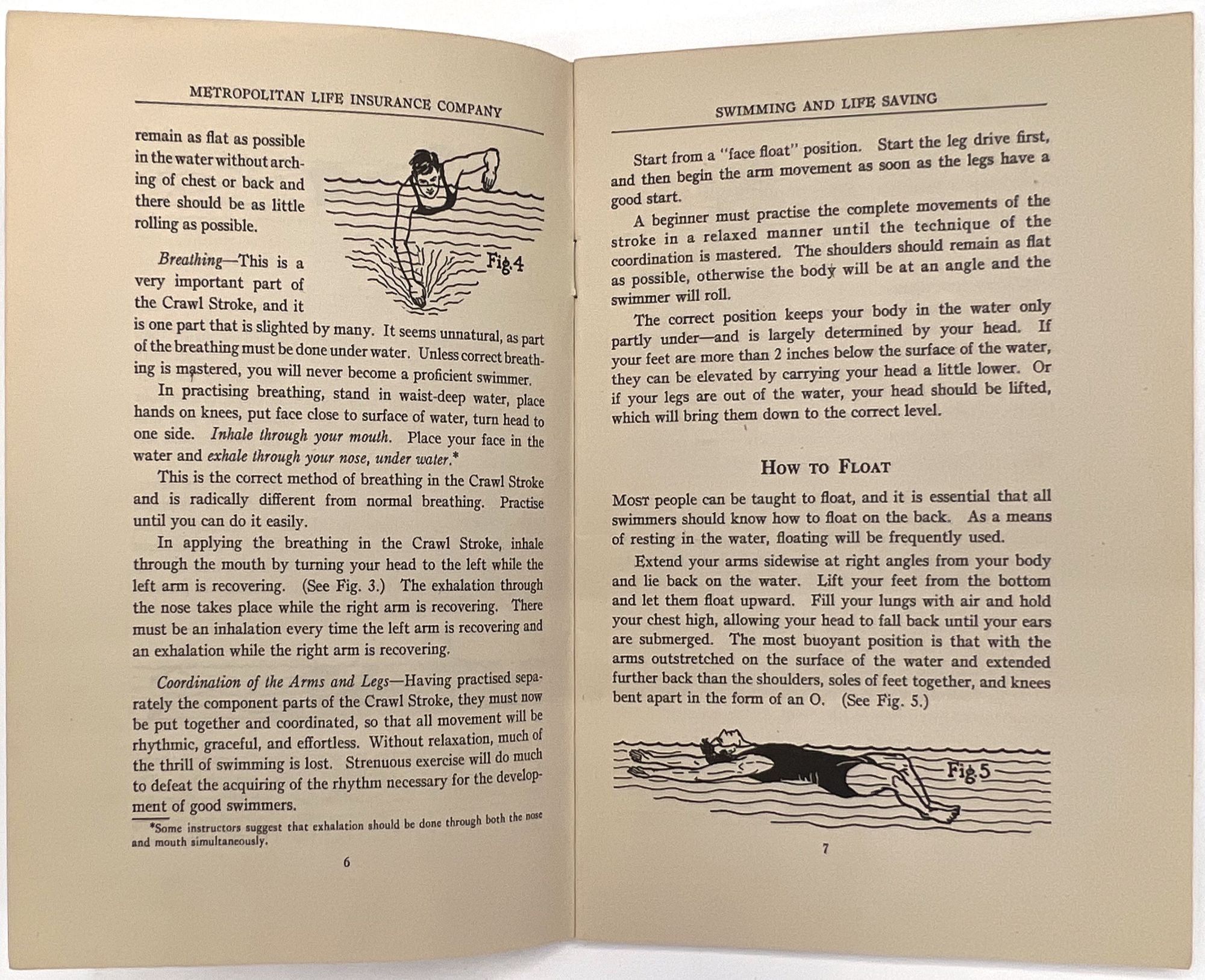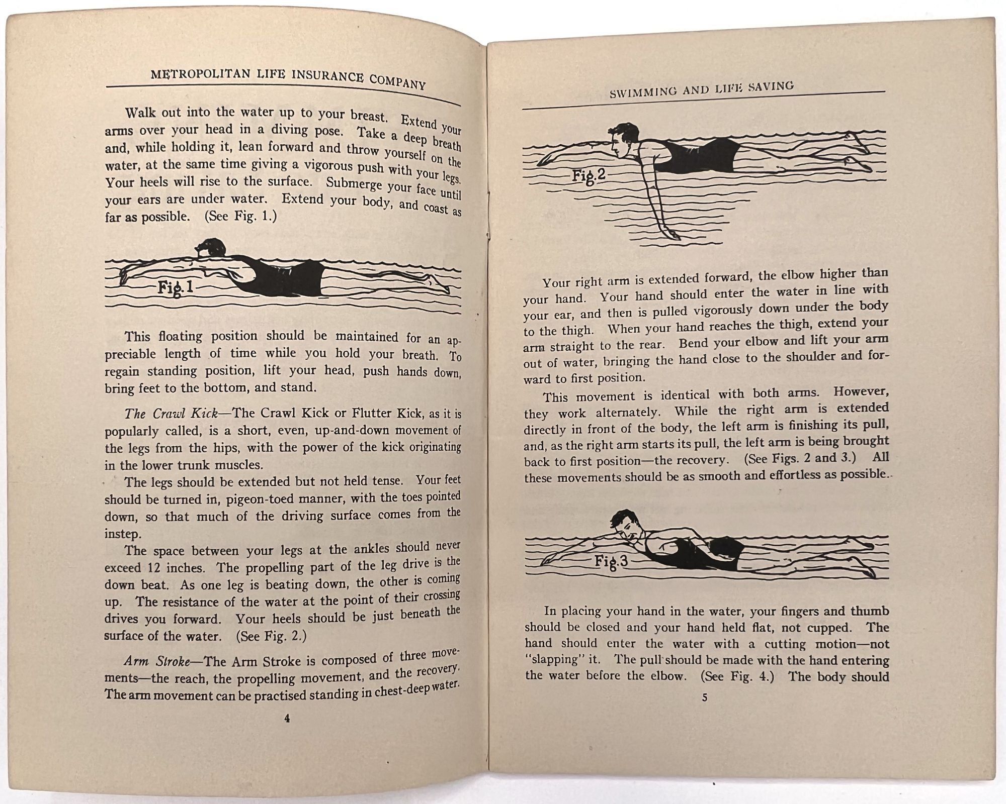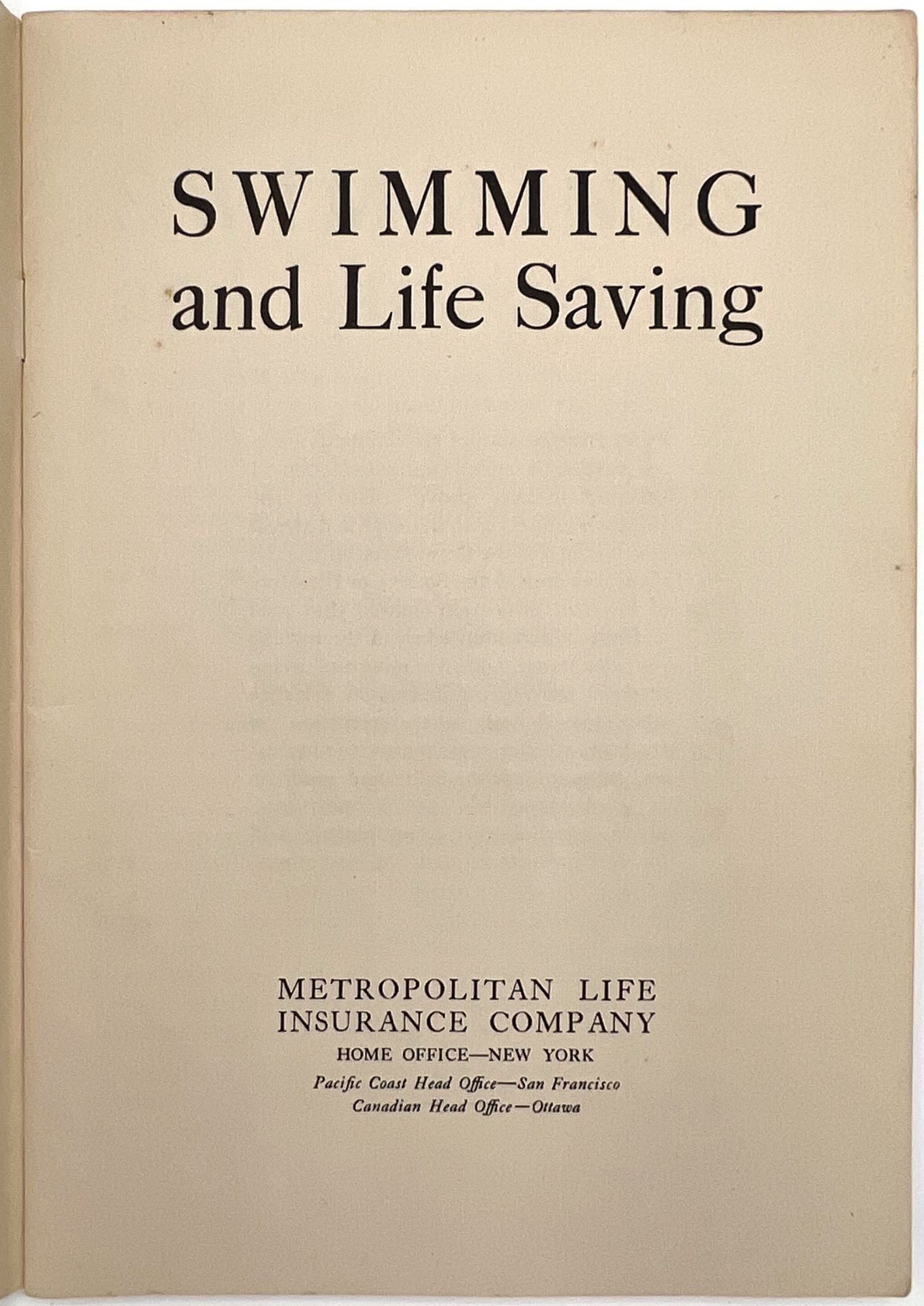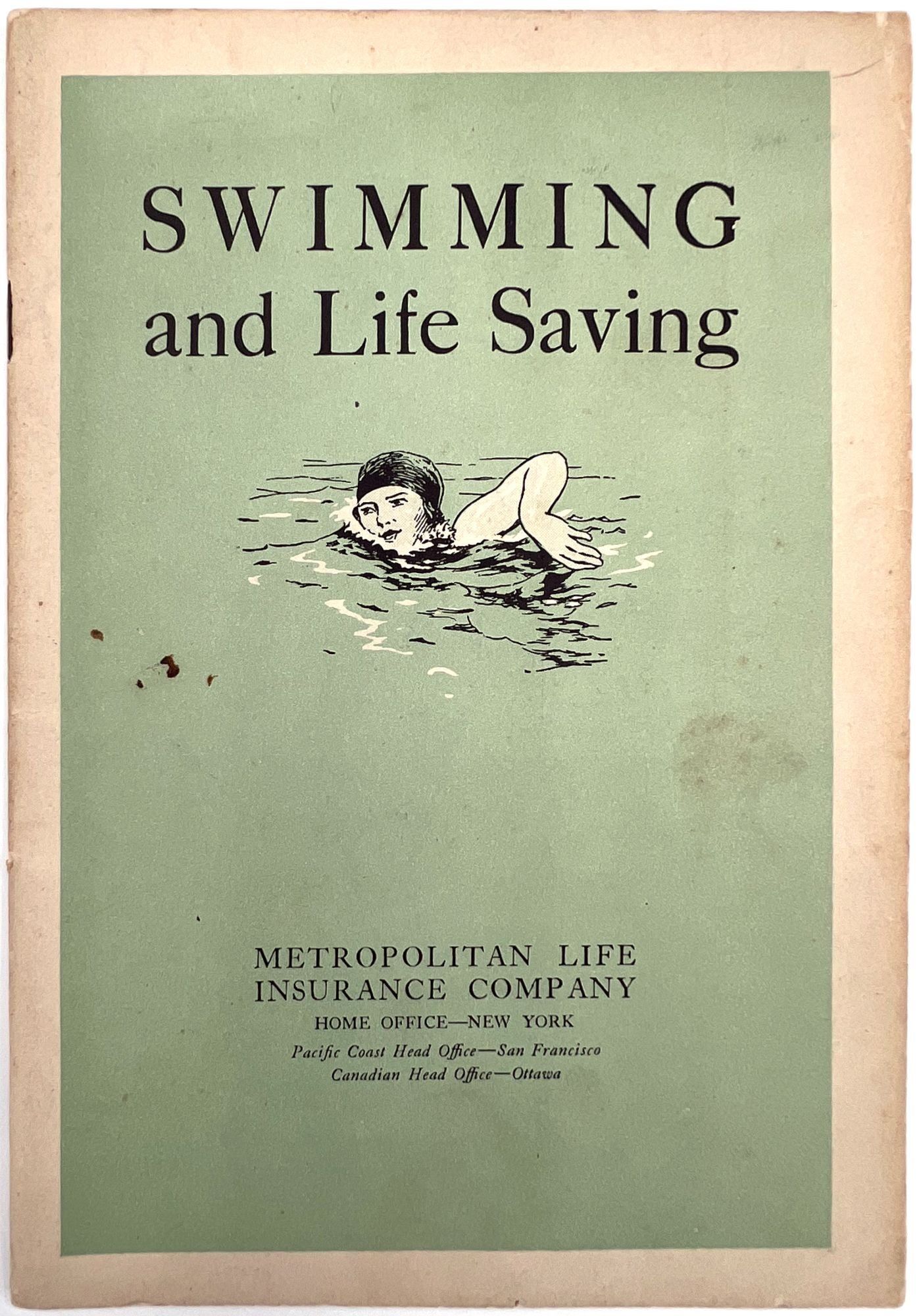 New York, New York: Metropolitan Life Insurance Company, 1920. Very good. Some toning, dust soiling, stain to upper cover.. A booklet on swimming and life saving by the Met Life Insurance Company, as means of promoting exercise and physical education to the general public. Describes different swimming strokes, how to breathe, tread water, and dive; also outlines basic life saving measures promoted by the Red Cross, resuscitation and basic water safety. Includes illustrations of swimmers throughout showing the various strokes and life saving techniques. Life saving approaches include - Approach from Behind, Underwater approach, Surface Approach, Cross-Chest Carry and Tired Swimmer's Carry. Plus, Release Methods including Front Strong Hold and Double Grip on One Wrist