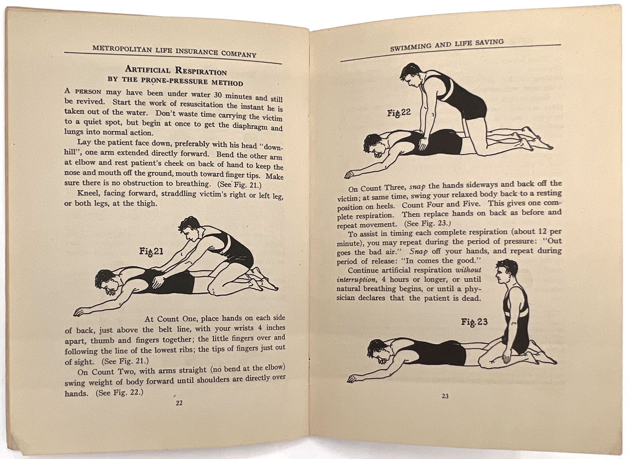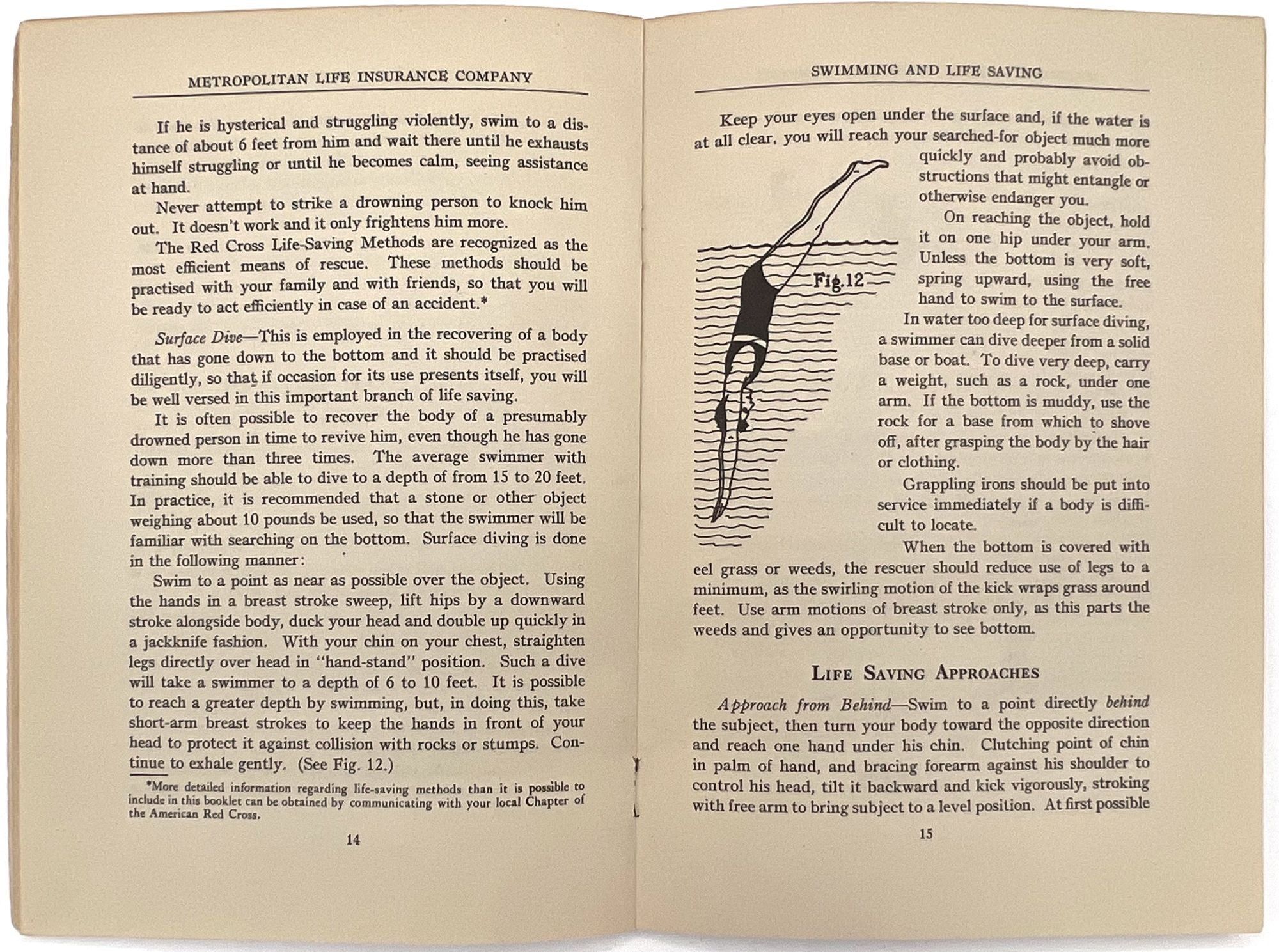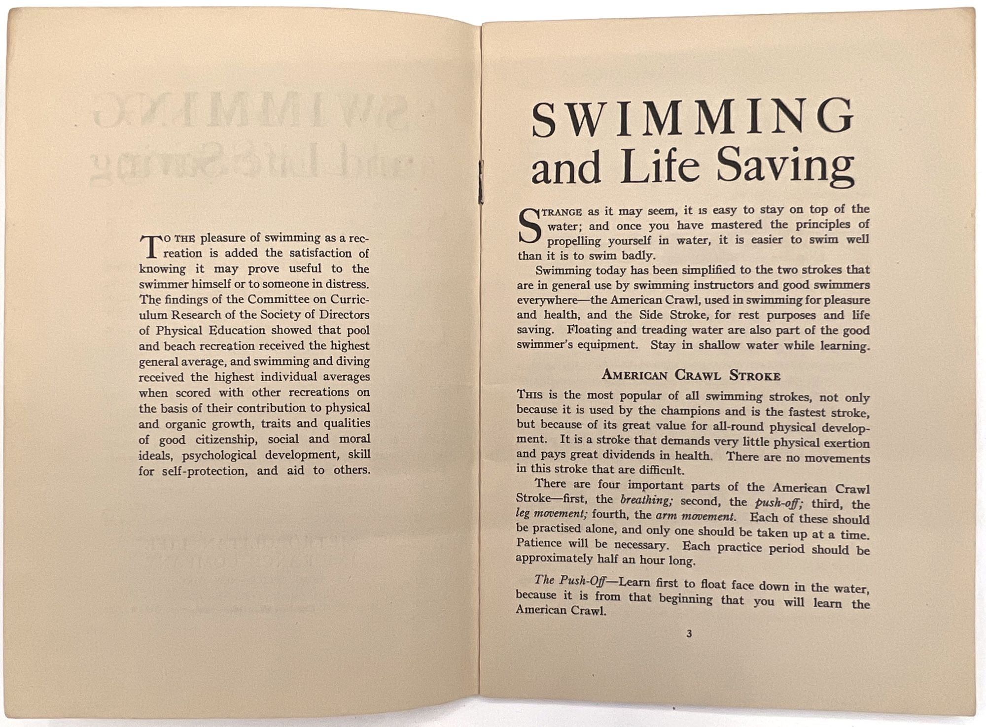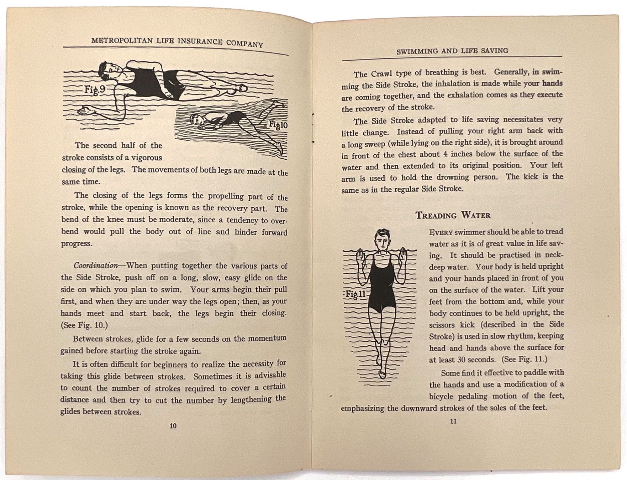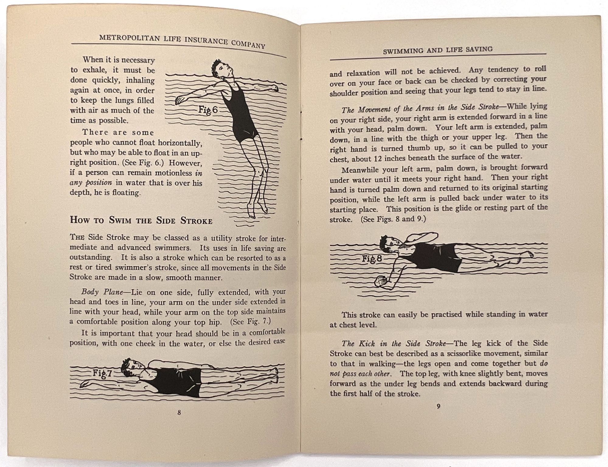 New York, New York: Metropolitan Life Insurance Company, 1920. Very good. Some toning, dust soiling, stain to upper cover.. A booklet on swimming and life saving by the Met Life Insurance Company, as means of promoting exercise and physical education to the general public. Describes different swimming strokes, how to breathe, tread water, and dive; also outlines basic life saving measures promoted by the Red Cross, resuscitation and basic water safety. Includes illustrations of swimmers throughout showing the various strokes and life saving techniques. Life saving approaches include - Approach from Behind, Underwater approach, Surface Approach, Cross-Chest Carry and Tired Swimmer's Carry. Plus, Release Methods including Front Strong Hold and Double Grip on One Wrist
