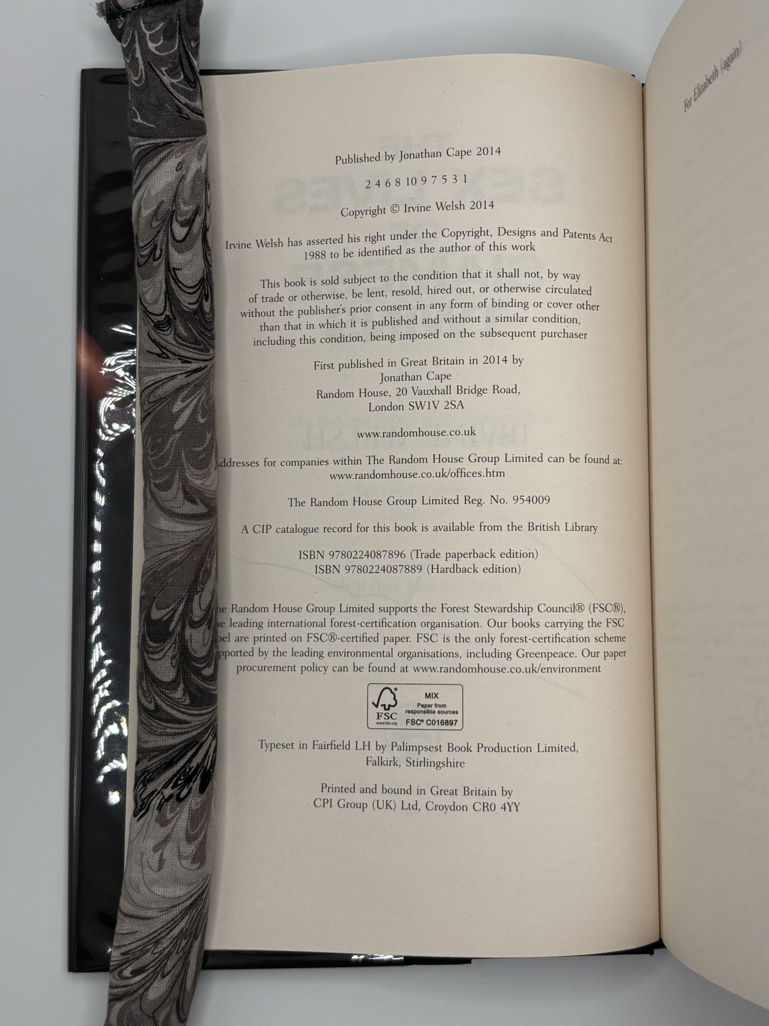 London, UK: Jonathan Cape, 2014. First UK Edition, First Price. Hardcover. Octavo, 467 pages. In Very Good condition with Very Good condition dust jacket. Spine is black with white lettering. Dust jacket protected by mylar covering, price uncut: "£12.99" on front flap, and has mild shelving wear along rear head joint. Boards have mild shelving wear along extremities and mild denting to rear head joint. Signed flat by Irvine Welsh on title page. Shelved in hallway. 1392280. Special Collections.