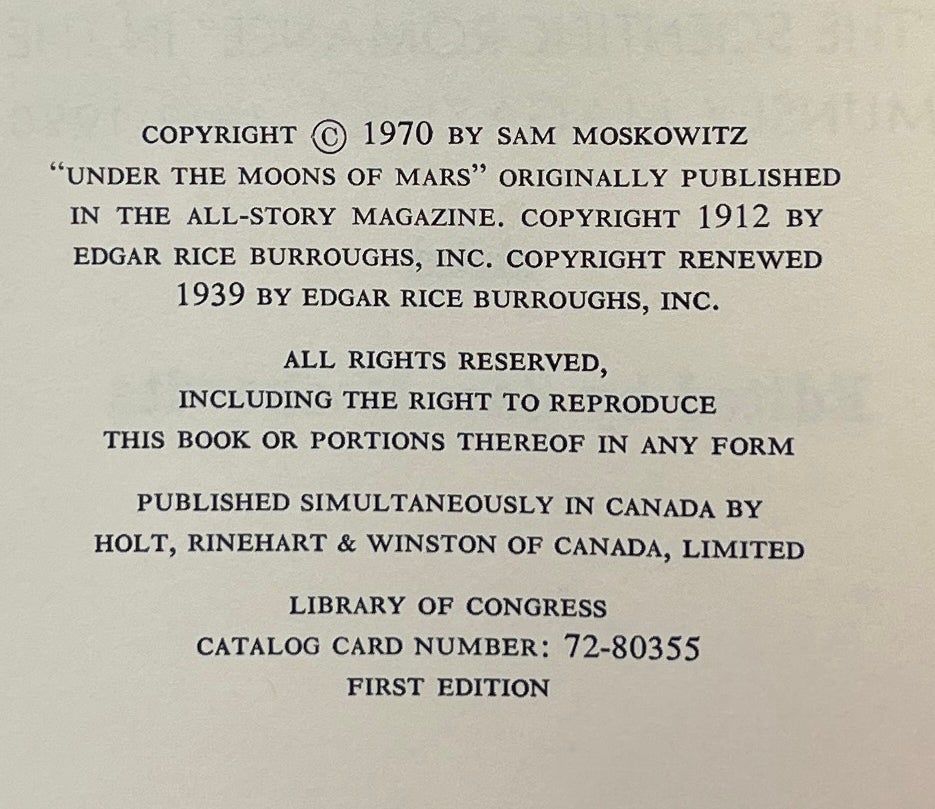 New York: Holt, Rinehart and Winston, 1970. First Edition. Hardcover. Very Good/Near Fine. Edited and with a History by Moskowitz. Very Good in a Near Fine jacket, unclipped ($7.95), lightly rubbed and soiled at the back panel. Black cloth, lightly bumped at the corners, with gilt lettering and designs on the spine. Square and firmly bound with a yellow top stain, a faint red stain to the top of the fore-edge, clean internally. A collection of nine scientific romance stories from the likes of Edgar Rice Burroughs, A. Merritt, Murray Leinster, and others. From the collection of Joan Bledig.