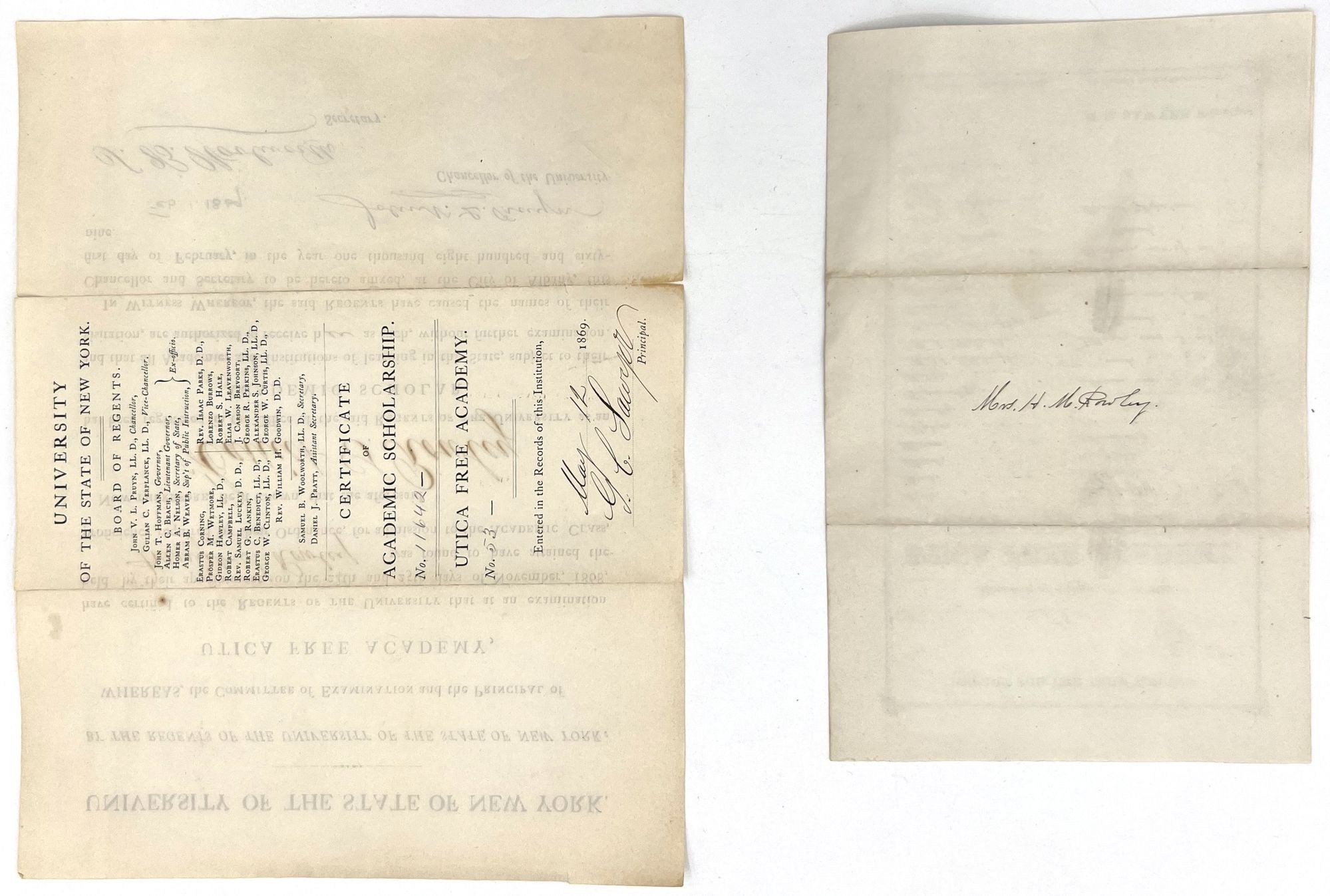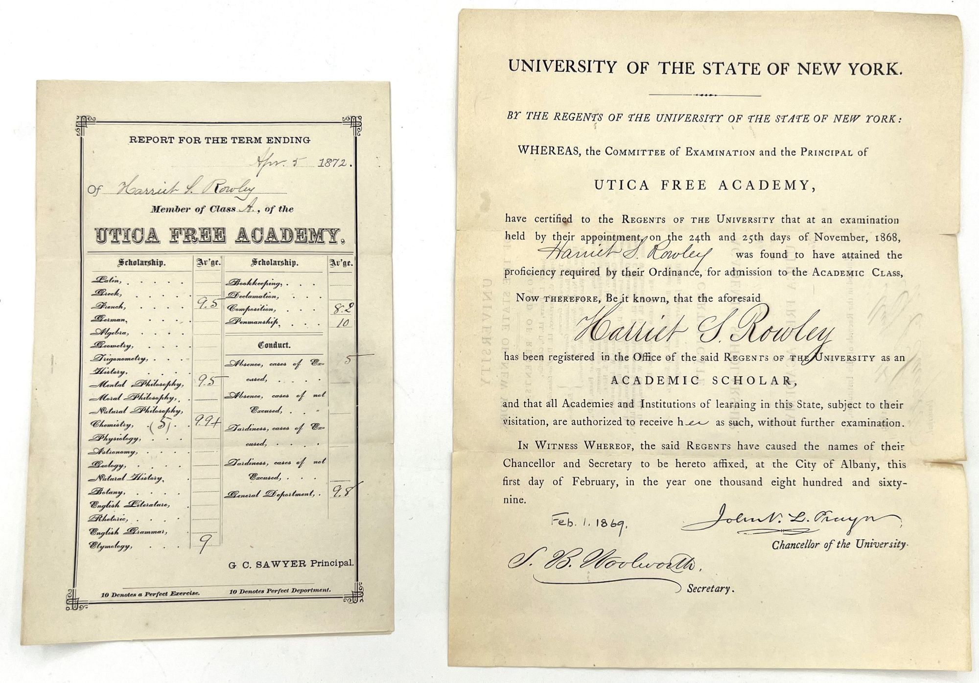Utica, New York, 1872. Very good. A little toning, letter folds, a couple minor short tears.. Ephemera charting the higher education of Harriet Sophia Parker (née Rowley, 1853-1943). The family valued higher education for both their male and female children. Harriet's brother, Hiram C. Rowley, would marry Thirza Jane Merriam (1845-1919), and join her family's printing business, Merriam-Webster. Includes two items: a lithographed grade report for the Apring 1872 term at Harriet's school, the Utica Free Academy, and also a signed certificate of academic scholarship from the same institution dated 1869. Each is finished in manuscript. Interesting to see the family's support of this teenaged girl's education, and also interesting to see what subjects she was taught: French, Mental Philosophy, Chemistry, Etymology, Composition, and Penmanship. Certificate measures approx. 10" by 8", and grade report is bifolium measuring approx. 8.5" by 5.5