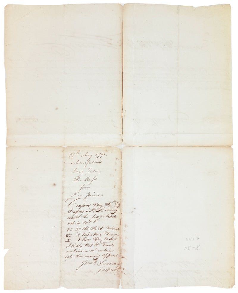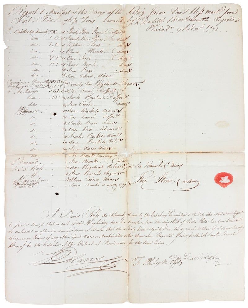 Cargo report executed in manuscript and dated November 9th, 1792 listing materials shipped from Port-de-Paix, Saint-Domingue [modern day Haiti] to Philadelphia for the firm Dutilh & Wachsmuth. The date places this report in the early days of the Haitian Revolution following the August 1791 enslaved peoples' revolt. The island was a vital source of commercial interests to Philadelphia, and the burgeoning revolution was at the forefront of everyone's mind, making this voyage and the survival of associated documents all the more significant. Dun cites one contemporary account, "'No business is going on here,' one letter told, 'as every one is taken up with meetings, committees, and arming themselves.'" (Dun, p. 484).