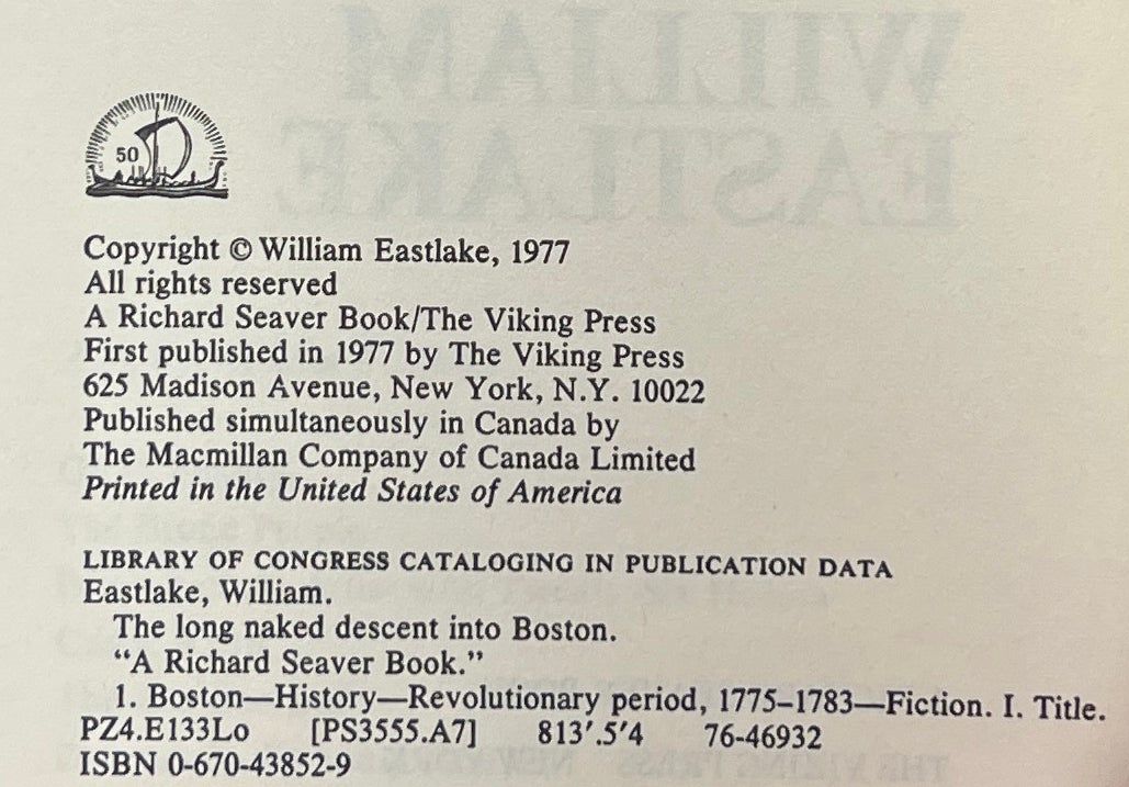 New York: Viking Press, 1977. First Edition. Hardcover. Near Fine/Near Fine. Signed by Eastlake on the front endpaper. Very Good in a Near Fine jacket, unclipped ($10.00), bumped and with a short tear at the top edge. Quarter blue cloth with pink paper on the boards. Square and firmly bound, foxed at the top edge, a few instances of pencil marginalia, clean otherwise. Eastlake's fictional account of pre-Revolution United States as seen from a British perspective.