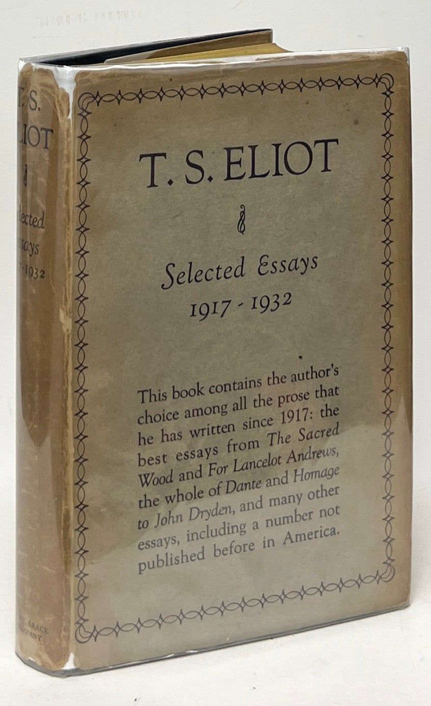 New York: Harcourt, Brace and Company, 1946. New Edition. Hardcover. Very Good/Very Good. Later Printing. [h*5*46] on the copyright page. Very Good in an about Very Good jacket, unclipped (no price), generally toned and soiled, shallow chips at the corners. Black cloth, lightly rubbed and with a ring on the front board, with gilt lettering on the spine. Square and firmly bound, former owner's name on the front endpaper, some pencil marginalia throughout. Eliot's own selection of what he deems his best prose since 1917.