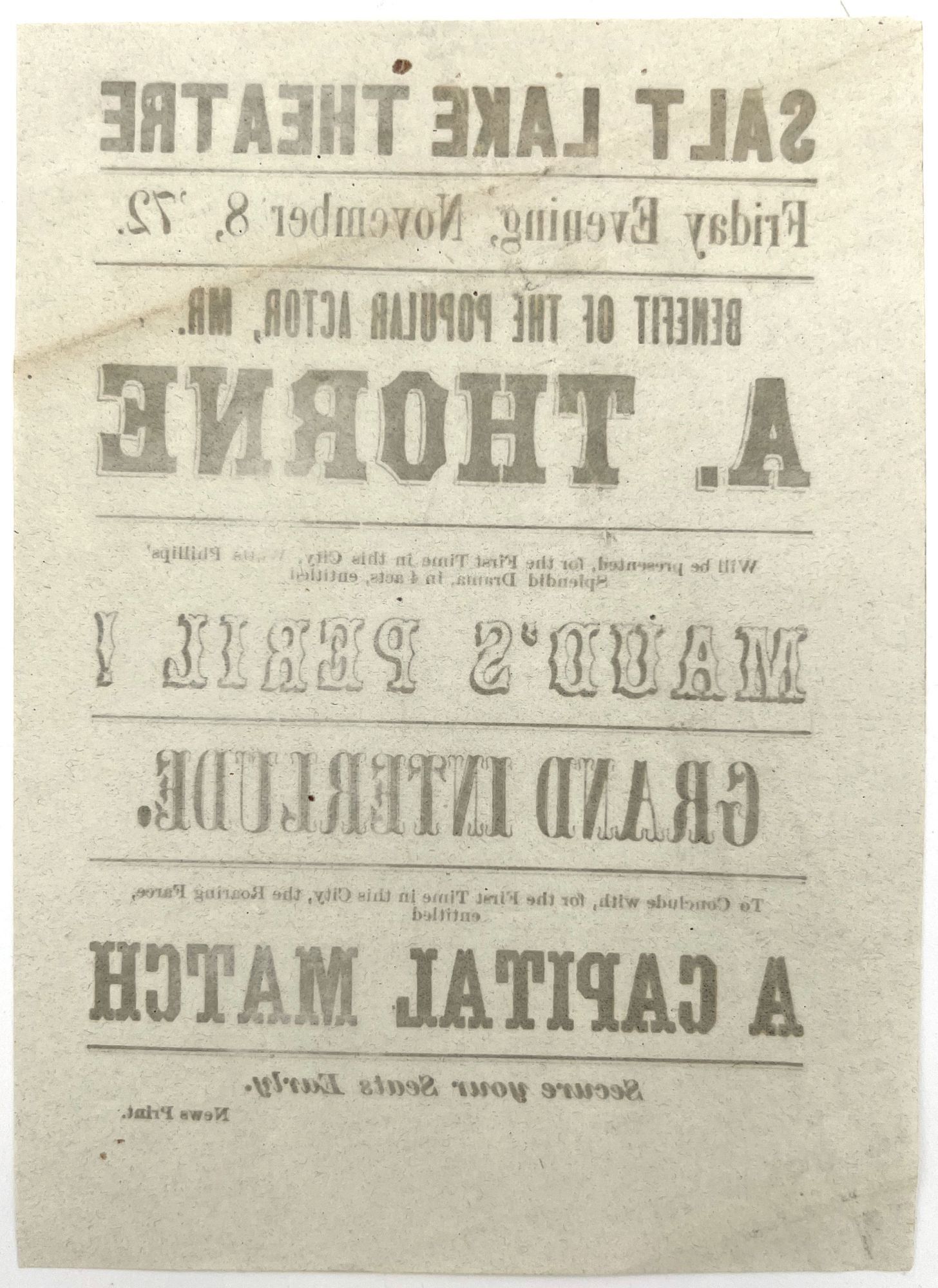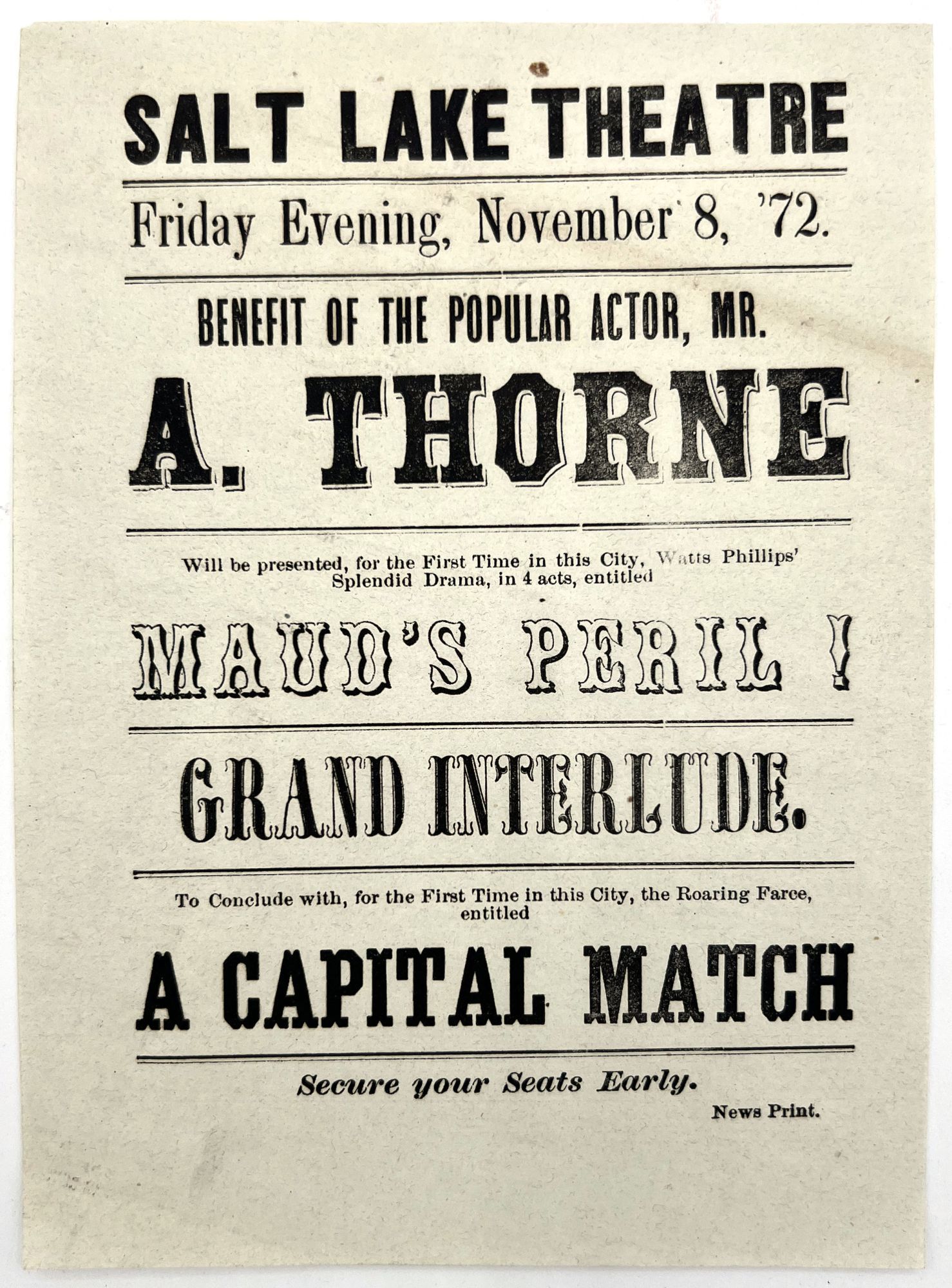 Salt Lake City: Salt Lake Theatre, 1872. Near-fine. Minor toning, one or two small spots.. Handbill advertising performances for the "Benefit of the Popular Actor, Mr. A. Thorne" at the Salt Lake Theatre. Watts Phillips' play "Maud's Peril" premiered in 1867 to mixed reviews; it is followed here by a performance of the farce "A Capital Match". Both were premiering in Salt Lake City for the first time. Measures 5.5" by 8"; verso blank. The Salt Lake Theatre was built in 1862, and persisted as a popular source of local entertainment until the advent of the motion picture. It was sold after WWI, and ultimately razed. The Pioneer Memorial Museum used the Theatre as inspiration for its facade.