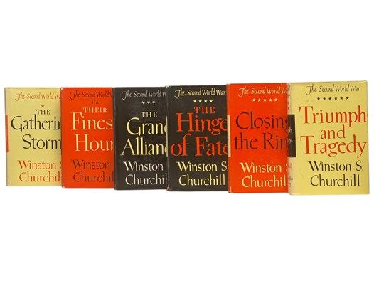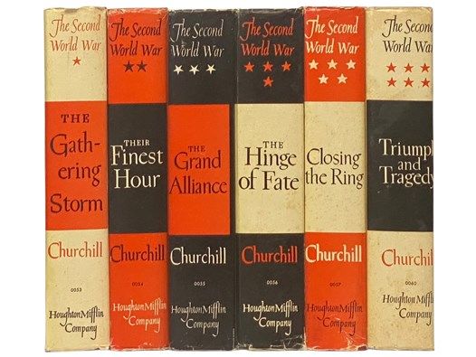Boston: Houghton Mifflin Company, 1948. Book Club (BCE/BOMC). Hard Cover. Very Good/Good. 10x5x8. Book club editions. Jackets lightly rubbed, jacket spines faintly foxed. Bindings tight, pages clean, bright, and unmarked. 1948 Hard Cover. Complete in six hardcover volumes. "Churchill's six-volume history of World War II -- the definitive work, remarkable both for its sweep and for its sense of personal involvement, universally acknowledged as a magnificent historical reconstruction and an enduring work of literature. From Britain's darkest and finest hour to the great alliance and ultimate victory, the Second World War remains the pivotal event in our century. Churchill was not only its greatest leader, but the free world's most eloquent voice of defiance in the face of Nazi tyranny. His epic account of those times, published in six volumes, won the Nobel Prize in 1953." ABOUT THE AUTHOR: "Sir Winston Leonard Spencer-Churchill, KG, OM, CH, TD, FRS, PC (Can) (30 November 1874 - 24 January 1965) was a British politician known chiefly for his leadership of the United Kingdom during World War II. He served as Prime Minister of the United Kingdom from 1940 to 1945 and again from 1951 to 1955. A noted statesman and orator, Churchill was also an officer in the British Army, a historian, a Nobel Prize-winning writer, and an artist. During his army career, Churchill saw combat in India, in the Sudan and the Second Boer War. He gained fame and notoriety as a war correspondent and through contemporary books he wrote describing the campaigns. He also served briefly in the British Army on the Western Front in World War I, commanding the 6th Battalion of the Royal Scots Fusiliers. At the forefront of the political scene for almost sixty years, he held many political and cabinet positions. Before the First World War, he served as President of the Board of Trade, Home Secretary and First Lord of the Admiralty as part of the Asquith Liberal government. During the war he continued as First Lord of the Admiralty until the disastrous Battle of Gallipoli caused his departure from government. He returned as Minister of Munitions, Secretary of State for War and Secretary of State for Air. In the interwar years, he served as Chancellor of the Exchequer in the Conservative government. After the outbreak of the Second World War, Churchill was again appointed First Lord of the Admiralty. Following the resignation of Neville Chamberlain on 10 May 1940, he became Prime Minister of the United Kingdom and led Britain to victory against the Axis powers.[1] Churchill was always noted for his speeches, which became a great inspiration to the British people and embattled Allied forces. After losing the 1945 election, he became Leader of the Opposition. In 1951, he again became Prime Minister before finally retiring in 1955. Upon his death the Queen granted him the honour of a state funeral, which saw one of the largest assemblies of statesmen in the world.