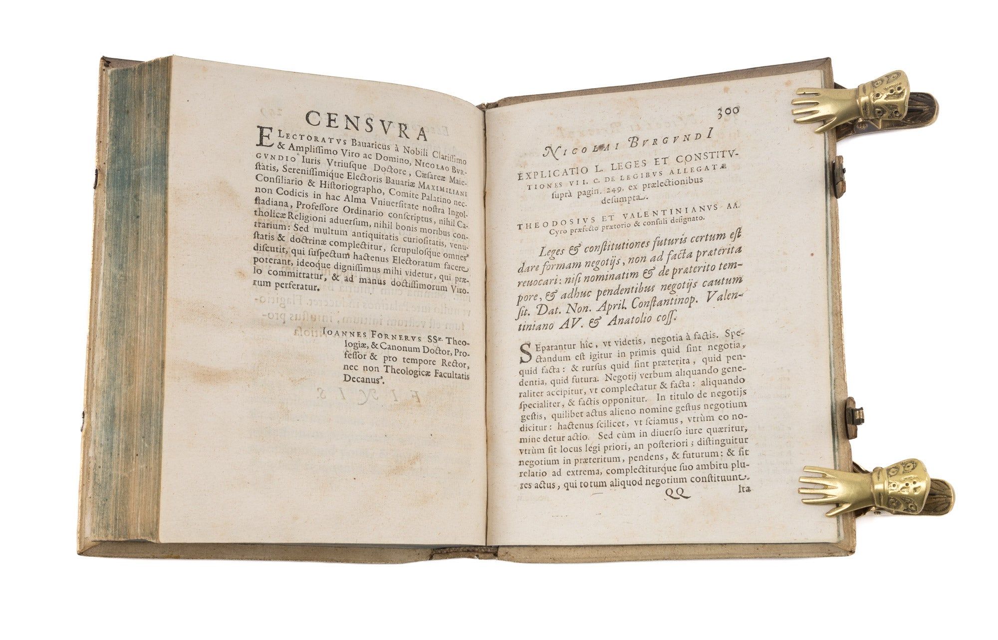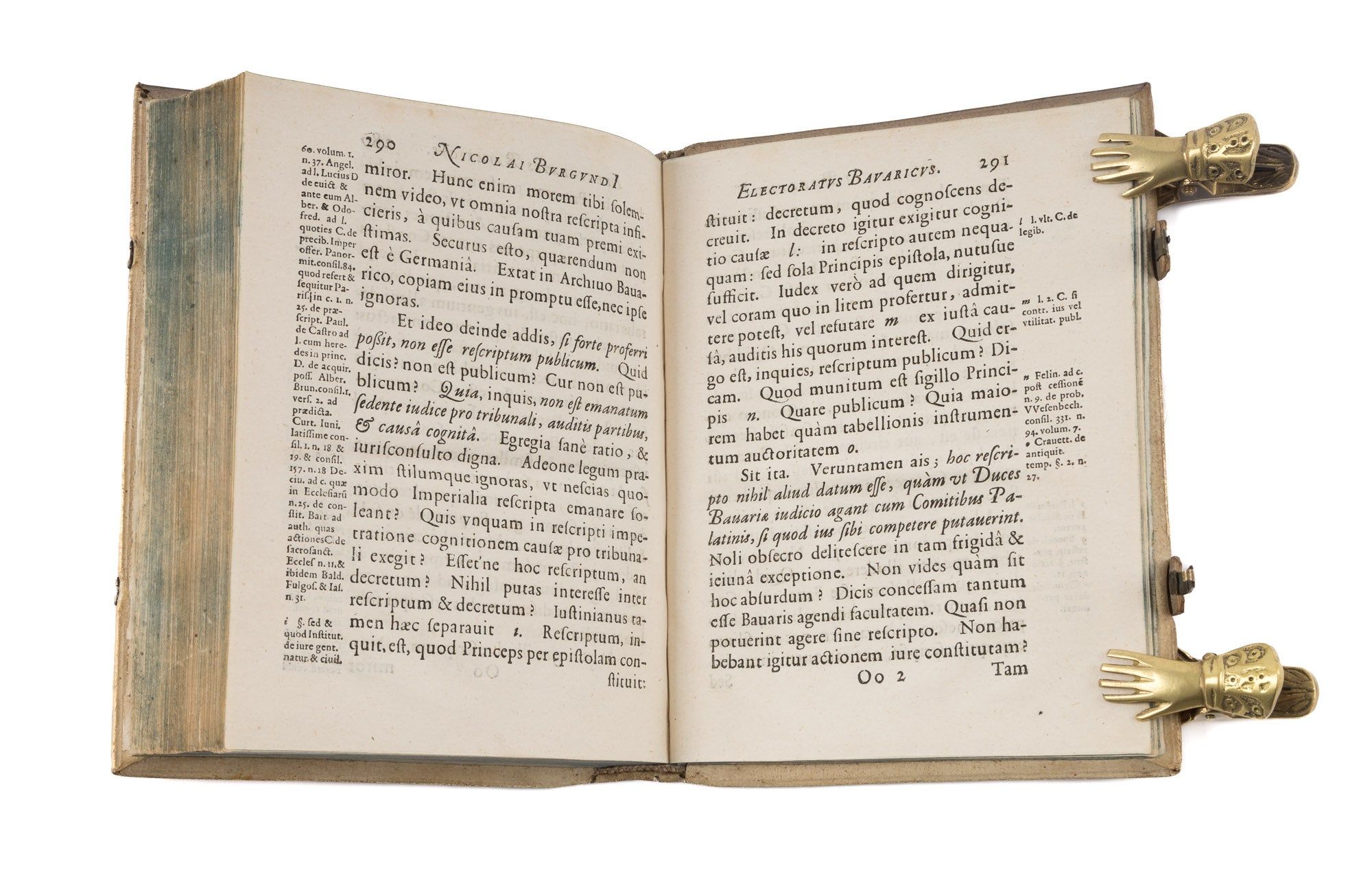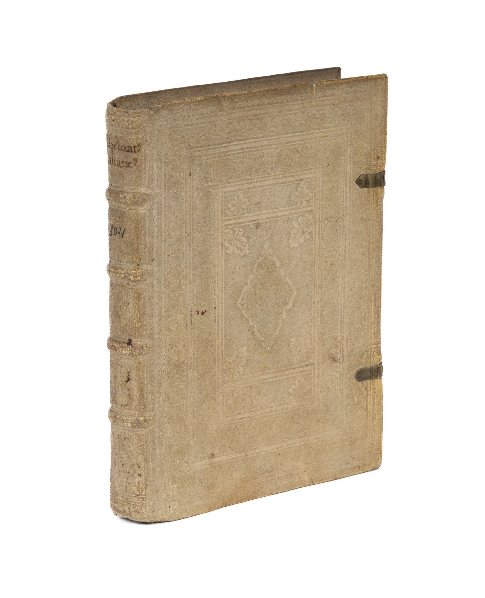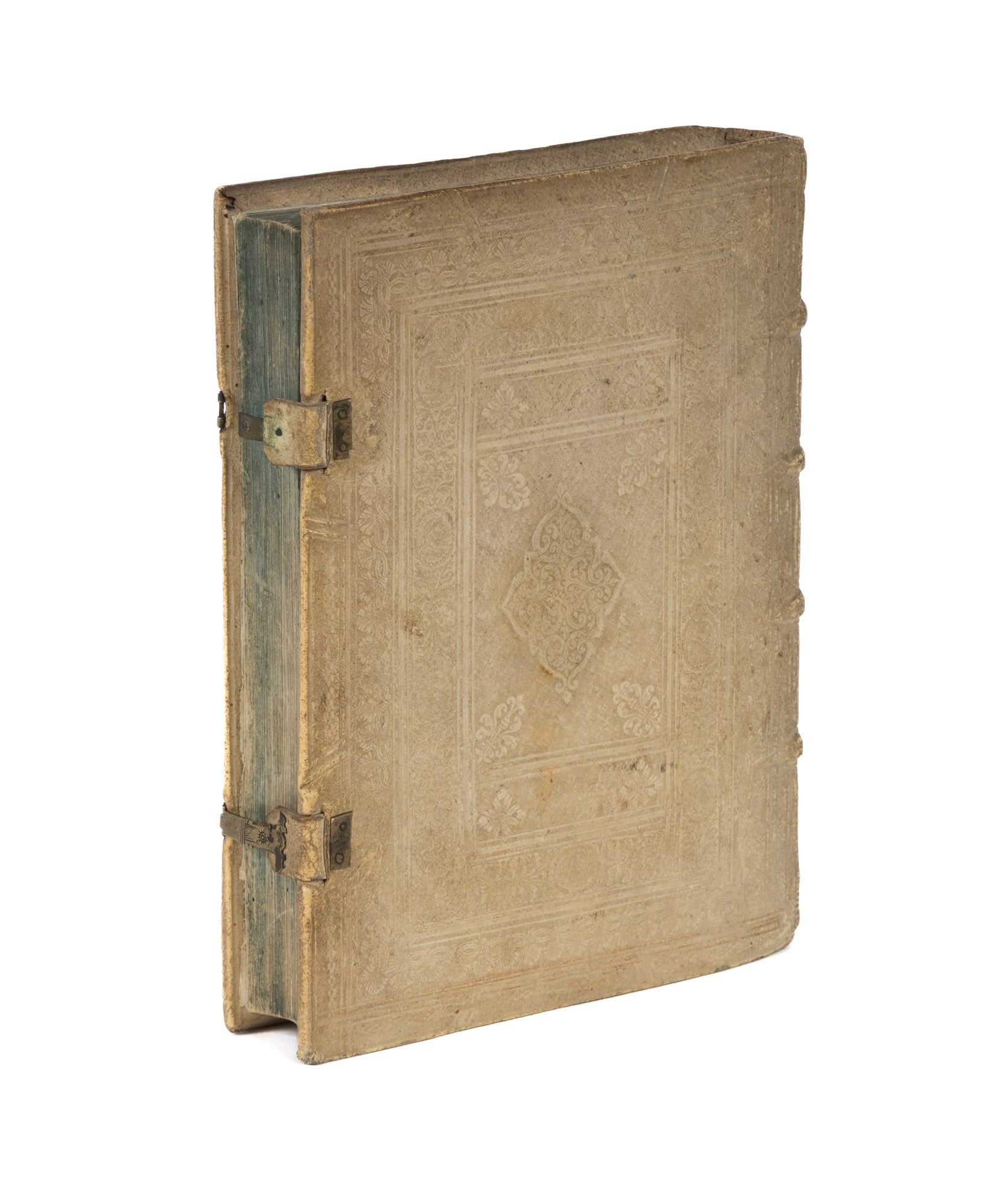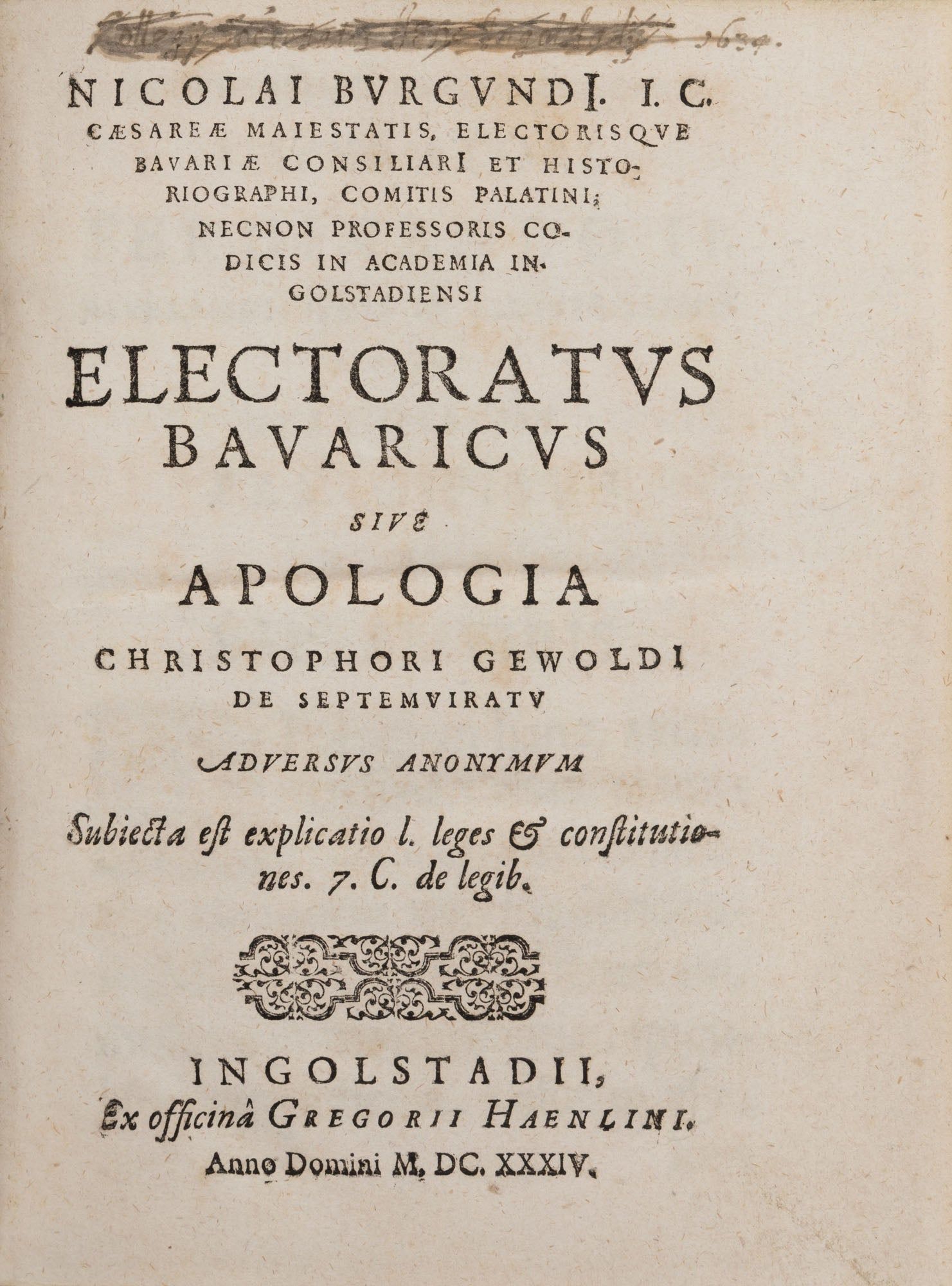 1634. Ingolstadt: Ex Officinƒ Gregorii Haenlini, 1634. Ingolstadt: Ex Officinƒ Gregorii Haenlini, 1634. The Duke of Bavaria and the Election of the Holy Roman Emperor Bourgogne, Nicolas de [1586-1649]. Electoratus Bavaricus Sive Apologia Christophori Gewoldi De Septemuiratu Adversus Anonymum. Subiecta est Explicatio L. Leges & Constitutiones 7 C. de Legib. Ingolstadt: Ex Officina Gregorii Haenlini, 1634. [iv], 309 [i.e. 310] pp. Quarto (7-3/4" x 6"; 20 x 15 cm). Contemporary paneled pigskin over wooden boards, raised bands, blind fillets and early hand-lettered title to spine, beveled board edges, bronze clasps, one clasp lacking, its hasp and strap intact, edges of text block colored blue. Negligible light soiling, rubbing and a few tiny spots, spine ends bumped, light wear to corners, minor worming to pastedowns and hinges, bookplate of Karl Sebastian Heller von Hellersberg to front pastedown. Light toning to interior, light foxing and tiny stains to preliminaries and a few other places, early struck-through owner inscription of the Jesuit College of Ingolstadt, dated 1634, to head of title page. A handsome copy. $2,500. * Only edition. Written by a law professor at the University of Ingolstadt and legal counselor to Maximilian I [1573-1651], Duke of Bavaria, this book defends the Duke's status as a prince-elector of the Holy Roman Empire, one of the small number of rulers empowered to elect the Holy Roman Emperor. Because Maximilian was granted this status in 1623 at the Diet of Regensburg, a convention of states on the Imperial side of the Thirty Years' War, there were some who questioned the Duke's legitimacy or dismissed it outright as an act of political expediency. The book's argument is based on De Sacri Romani Imperii Septemviratu Commentarius (1616, second edition 1621) by Christoph Gewald [1556-1621], a detailed discussion of laws and agreements concerning the election of Holy Roman Emperors. As stated in the title, it also defends Gewald's book against an anonymous critic. A lawyer by training, Heller von Hellersberg [1772-1818] was a professor of jurisprudence and political science at the University of Landshut, later at the University of Ingolstadt. He also played an important role in the reformation of Bavaria's political structures during the rule of Duke Maximilian I [1756-1825]. Established in 1556, the Jesuit College of Ingolstadt was a highly distinguished and influential institution. I.