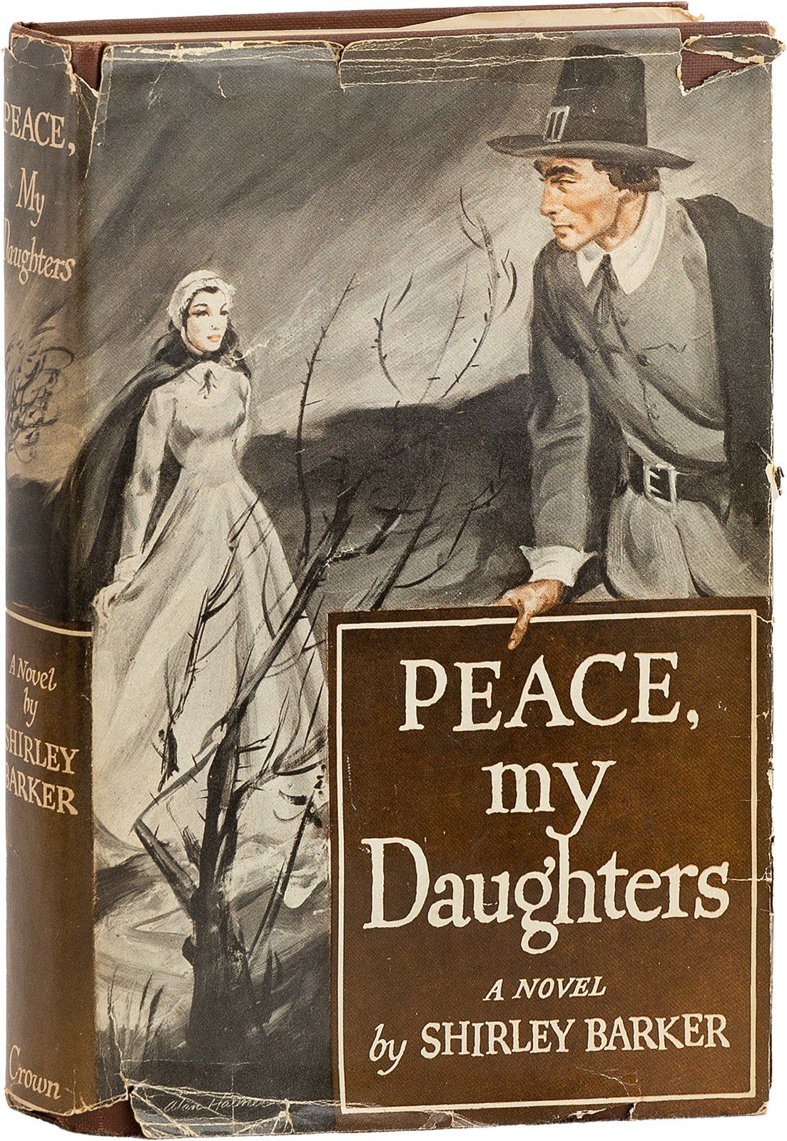 New York: Crown Publishers, 1949. First Edition. First Printing. Octavo (21.5cm); brown cloth-covered boards, with titling and decorative elements stamped in silver on spine; fore-edge untrimmed; 248pp. Trivial surface wear, with light finger-soil to covers, previous owner's name pencilled to front endpaper, and previous bookplate remnants on rear pastedown; Good. Dustwrapper unclipped (priced $3.00) with modest shelfwear, chips to spine ends, 2" closed tear to front flap, nick to rear flap, with tiny creases and tears to extremities; Good. Barker's first novel, focusing on the Salem witch trials. [83801].