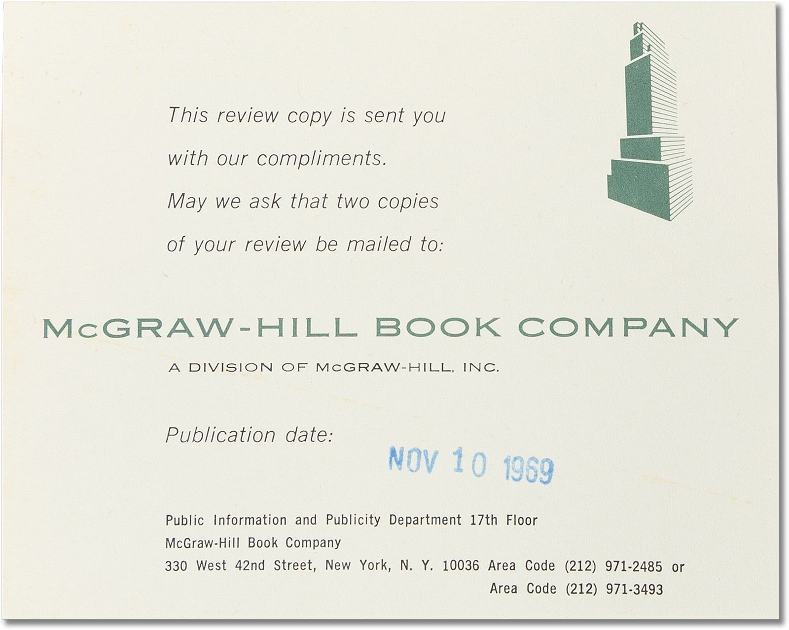 New York: McGraw-Hill Book Company, 1969. First Edition. First Printing, a Review Copy with publisher's typed review slip laid in. Octavo (21cm); magenta cloth over black paper-covered boards, with titling stamped in black on spine; yellow topstain; dustjacket; 183pp. Light foxing to edges of textblock; Near Fine. Dustwrapper, designed by Seymour Chwast, unclipped (priced $5.95) with light trivial surface wear and faint residue to spine panel and rear panel; Very Good. The California author's second novel focuses on two women with attention to romance and humor as they reflect on life. [83810].