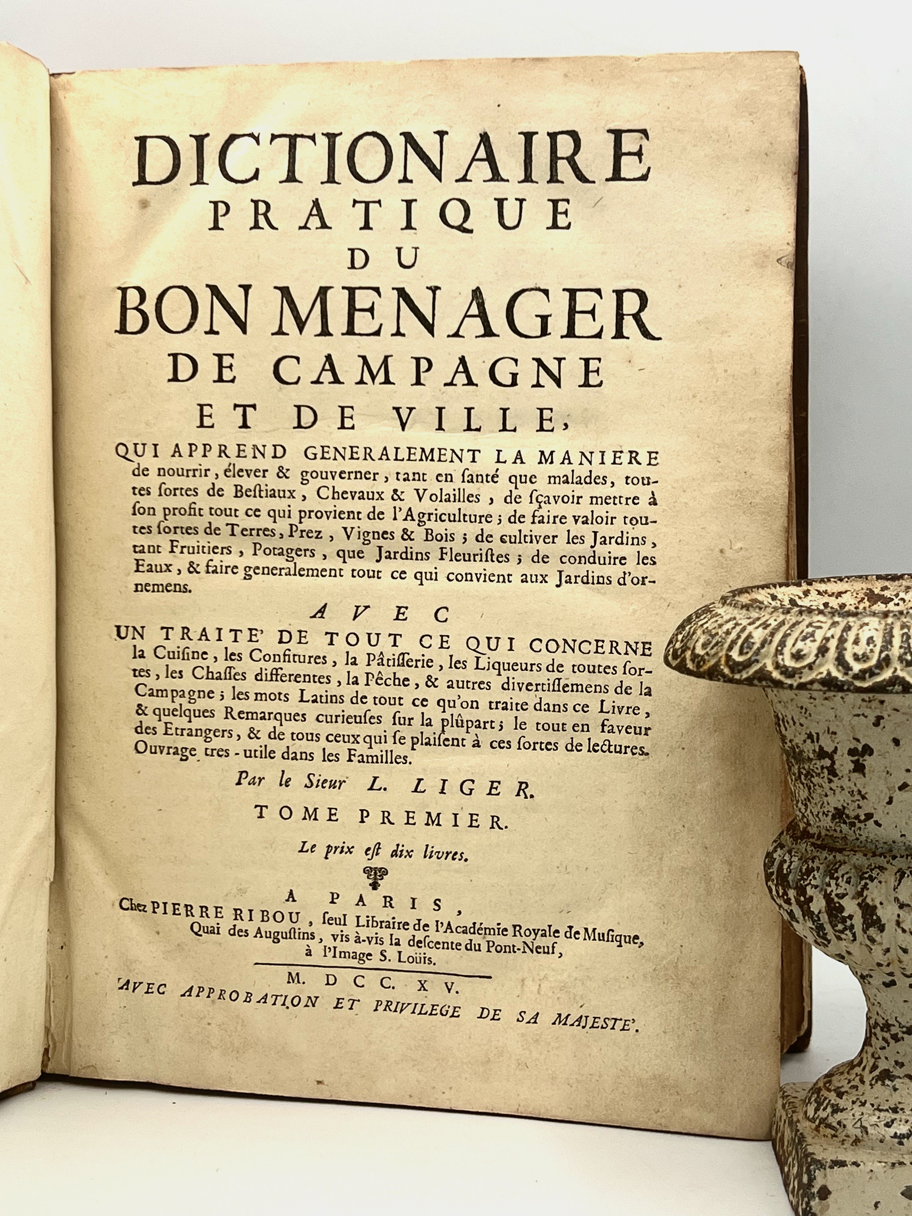 Paris: Chez Pierre Ribou, 1715. First Edition. Hardcover. Brown calf, raised bands, spine gilt decorated with red morocco label. Very good. Two Volumes bound in one. Vol. I 436 pages. Vol. II 400 pages. 26 x 20 cm. Liger's "Dictionaire" was an influential French agricultural and household management dictionary covering various aspects of rural and urban household management principles, including viticulture and wine production. The dictionary gained prominence for its practical advice and detailed information. The dictionary's influence extended beyond France, and was referenced in culinary works in other countries, such as England, where recipes and techniques were adapted and incorporated into local cookbooks. This cross-country influence demonstrates the dictionary's importance in the development of European culinary traditions int he 18th century. Liger's work provided one of the earliest definitions of "terrior" in relation to wine.