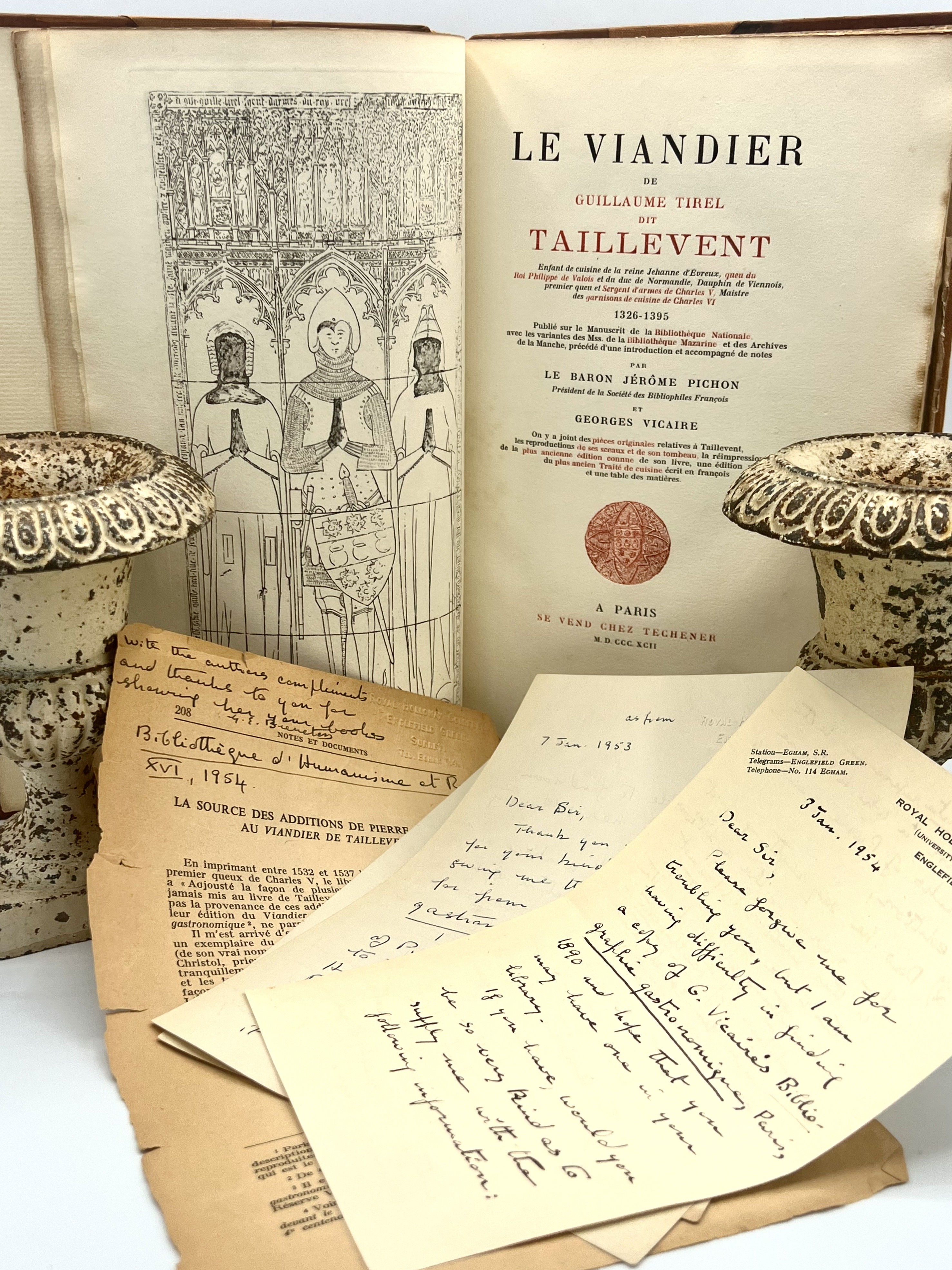 Handwritten letters from Georgina E. Brereton, medieval French scholar, to André Simon, bibliophile, wine connoisseur, historian and writer, seek details from a specific copy of G. Vicaire's Bibliographic Gastronomique, 1890, Simon held in his library. As Brereton was then teaching at the Royal Holloway College, we can assume that it was a well known fact that Simon had one of the best gastronomy libraries in London, and felt comfortable reaching out to a fellow scholar. Because the original Le Viander is believed to have been compiled in the late 14th century with additional manuscript copies and printed editions produced throughout the 15th and 16th centuries, there is speculation that some phrases and recipes have been both added and left out over the years. In Brereton's first letter she asks about the source of some of these additions, stating she had found additional sources herself. In the second letter, dated two days later, she thanks him for the information she requested and goes on to explain how she had found, by accident, some additional information while researching other material. Also laid in is an annotated leaf of a bibliography featuring two of the books Georgine E. Brereton had edited. Letters and leaf are all embossed with the Royal Holloway College's address.