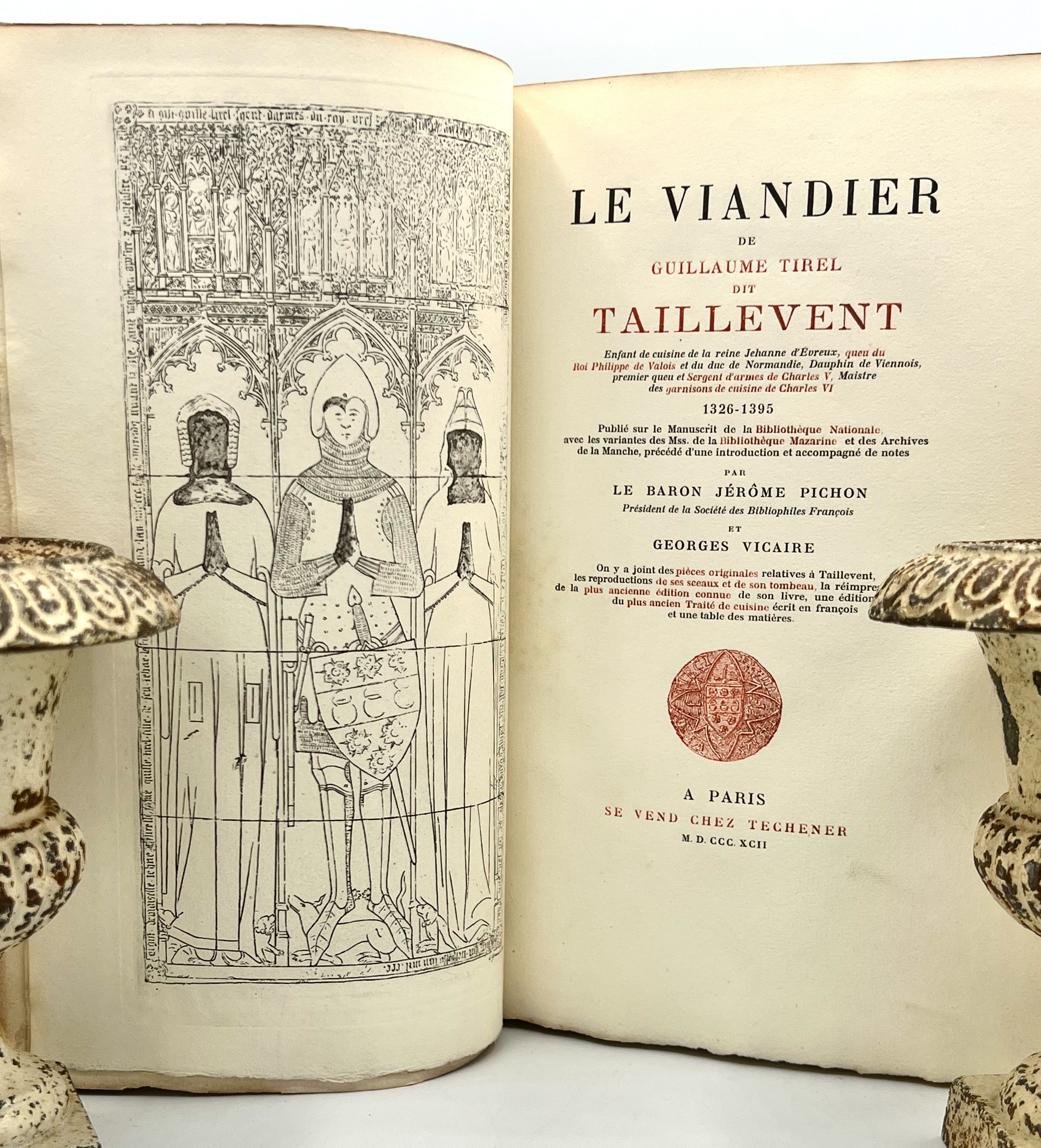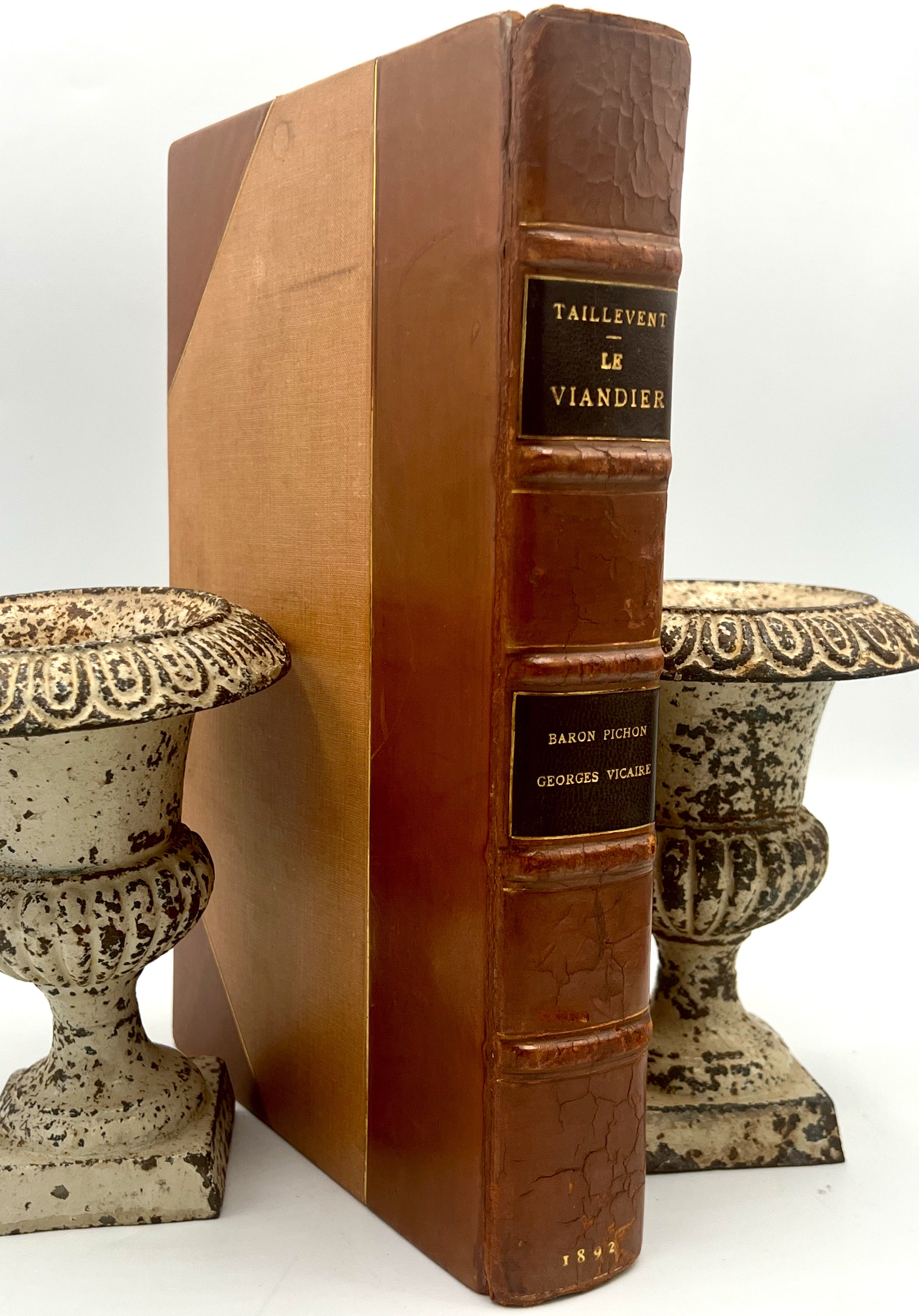 Paris: SE VEND CHEZ TECHENER, 1892. Hardcover. Half brown calf, tan cloth covered boards, raised bands, with black morocco titles. Very good. 297 pages. 24 x 16.5 cm. Limited edition #67 or 350. Le Viandier is one of the earliest and most influential cookbooks from medieval France. A recipe collection, generally credited to Guillaume Tirel, also known as Taillevent, is considered one of the first "haute cuisine" cookbooks, offering a framework for the preparation and presentation of dishes brought to the table. This 1892 copy of Le Viandier represents a significant scholarly edition that differs from earlier versions in several ways. This edition was based on a manuscript from the French Bibliotèque Nationale, one of only three manuscripts known at the time. Also, this edition includes a lengthy introduction, descriptions of the manuscripts, a detailed bibliography, copious scholarly notes, and an index. In addition, the editors published a supplemental copy of a manuscript that was found in the Vatican Library, which is bound together as one in this copy.