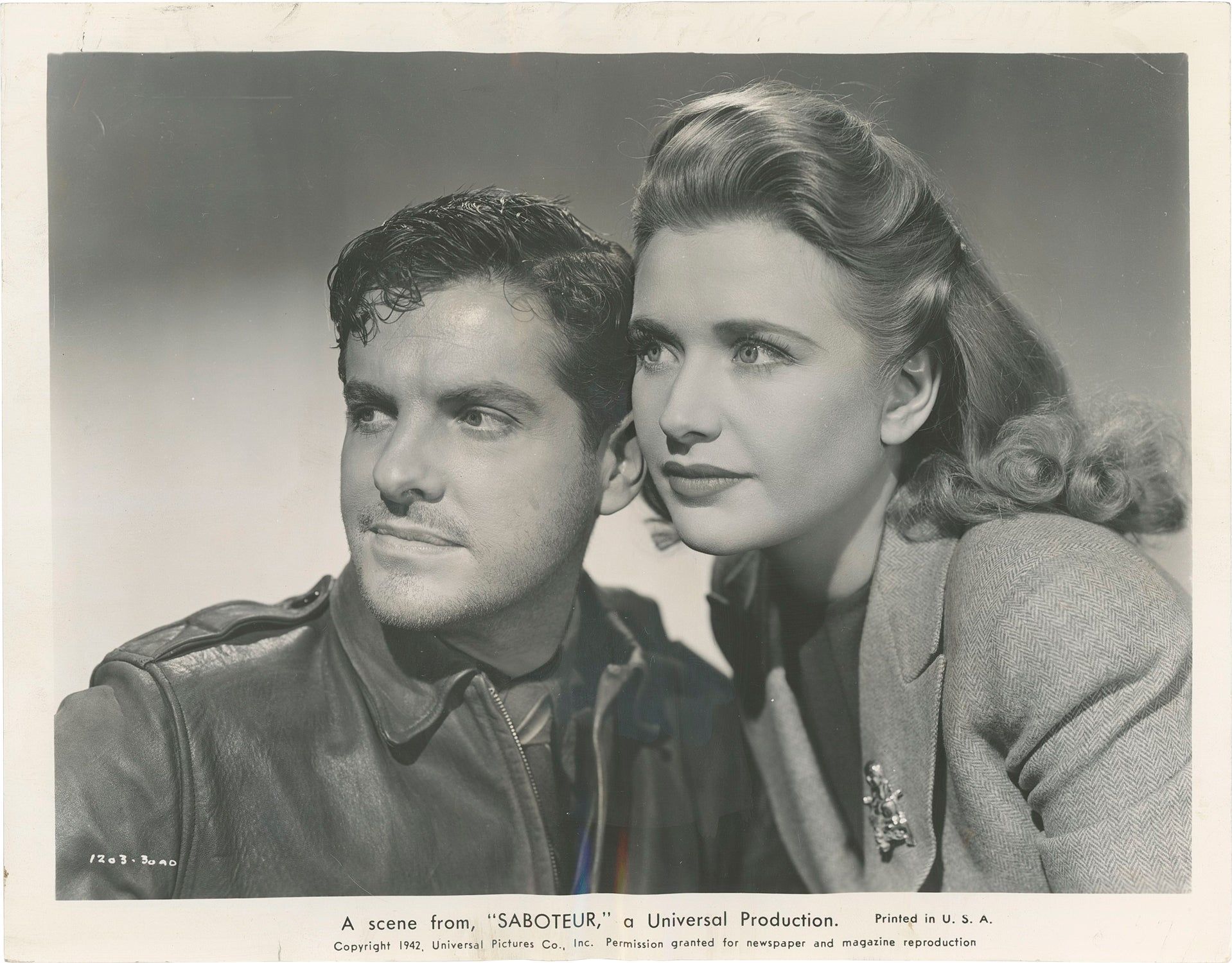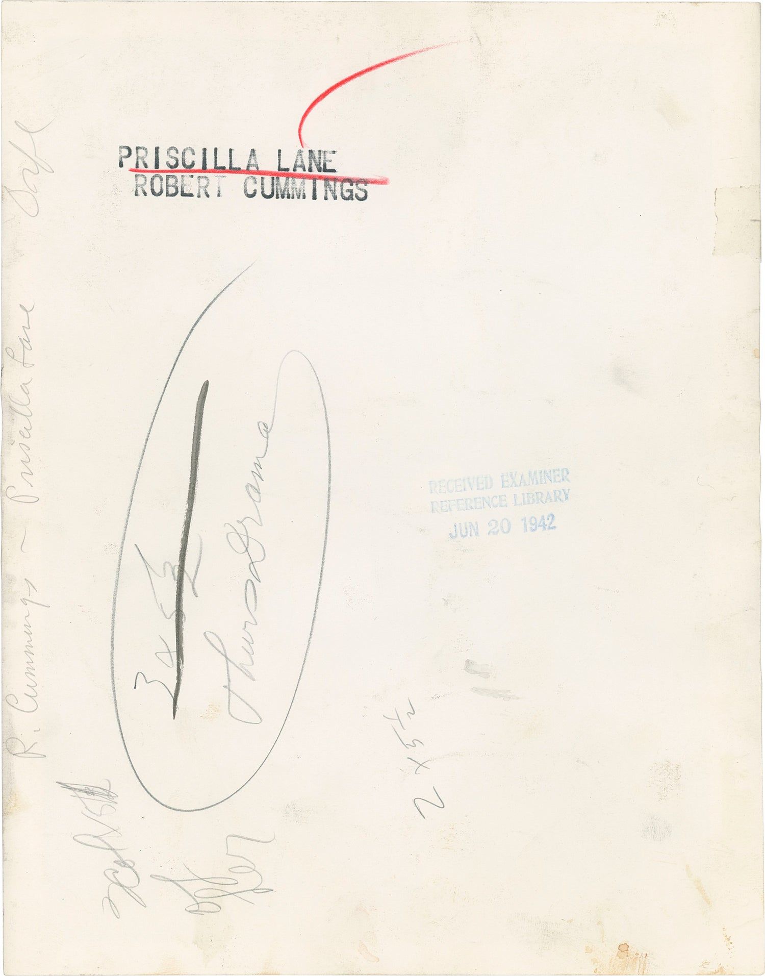 Universal City: Universal Pictures, 1942. Vintage studio still photograph from the 1942 film, showing actors Robert Cummings and Priscilla Lane. Date stamp and provenance stamp on the verso.
