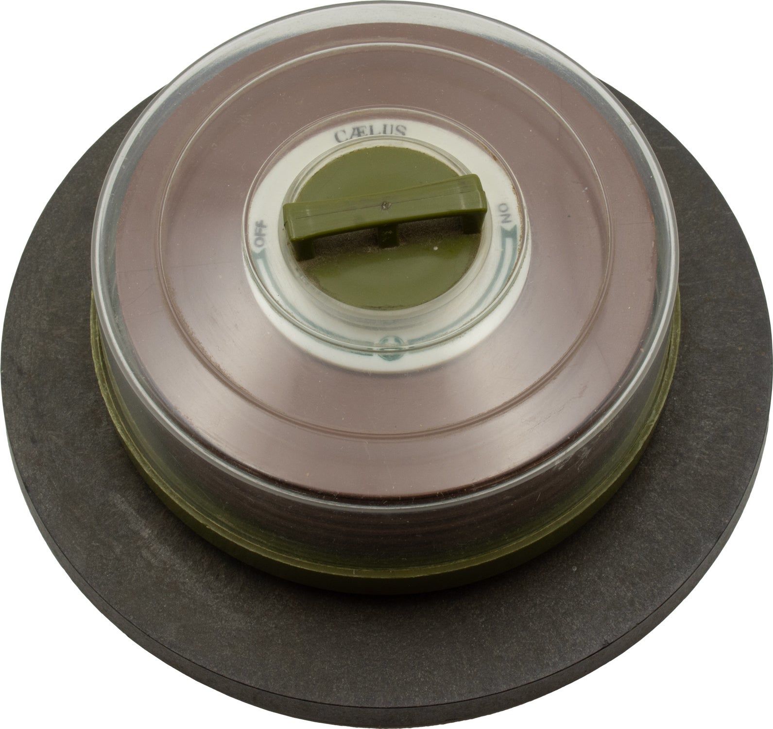 Caelus was a start-up created around 1966, of note initially as an early supplier of "IBM clone" (IBM compatible) disk packs. The disks, also known as platters, were typically supplied with a protective canister featuring a lifting handle, as shown here. The model, a miniature representation of the 14-inch hard disks used by IBM, was likely created for a trade show.