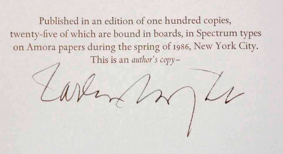 New York: Red Ozier Press, 1983. First edition. Softcover. 39 pages. Printed in an edition of only 100 copies although this copy is designated an "author's copy." A fine copy in wrappers and in a very near fine dust jacket. Signed by Wright on the colophon page. A nicely printed and designed book of poems by Wright that seems fairly uncommon.
