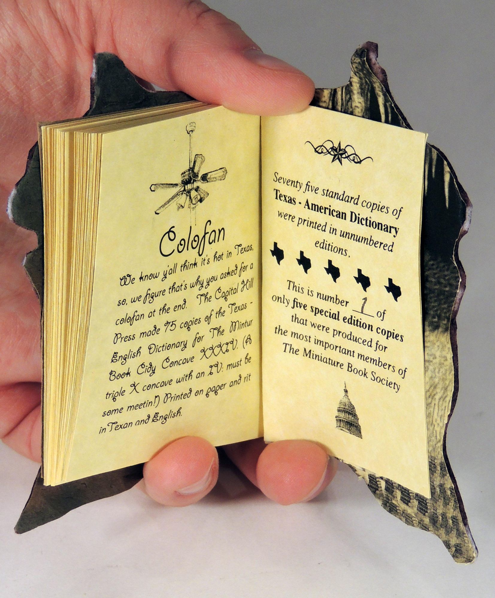 Washington DC: Capital Hill Press, 2016. Hardcover. Fine. Hardcover. 1 of 5 special edition copies produced for the most important members of the Miniature Book Society. There were 75 copies in the standard edition. Printed as a keepsake for the Miniature Book Society. Written, typeset, printed, and bound by Rick Hill. A comical dictionary of Texas slang and diction with black and white illustrations. Bound in full dark brown faux-leather, cut to look like a full cow hide with embossed title to front board and spine. Minor wear to edges. Clean and bright. Size: book itself is 3 x 2.25 inches; however, the irregular bits of the faux-leather extend past the boards making the size a little larger - 4 x 2.75 inches. Unpaginated. MINI/012125.
