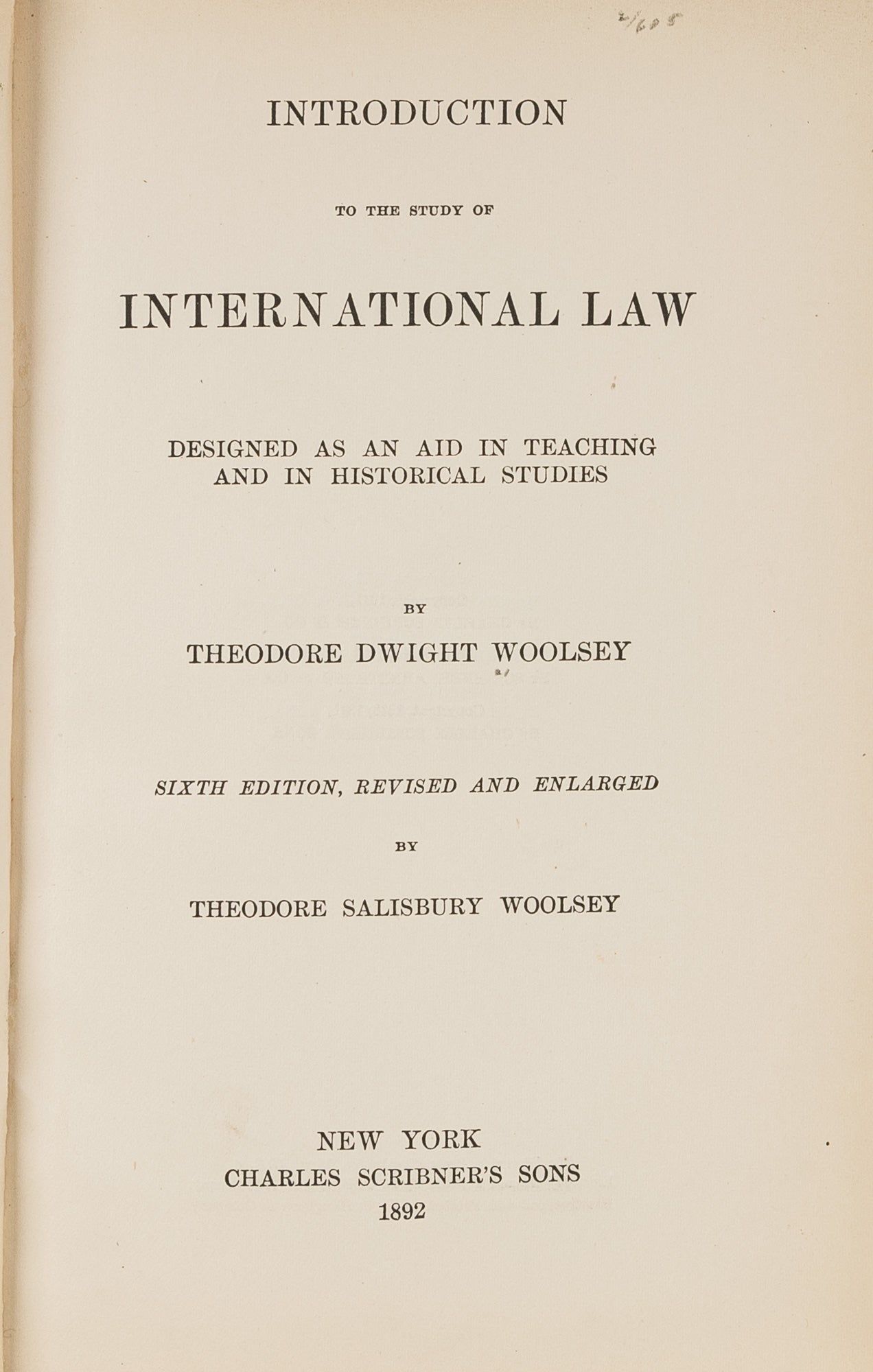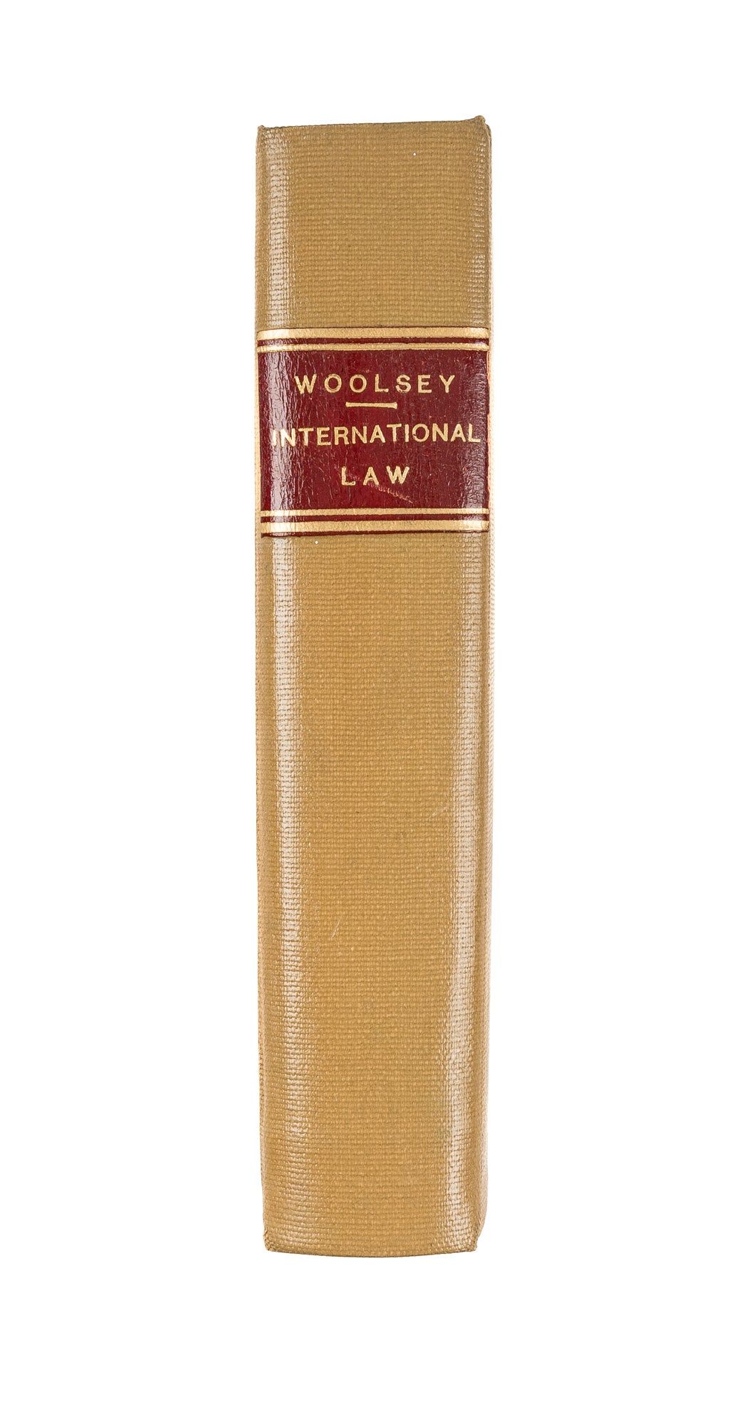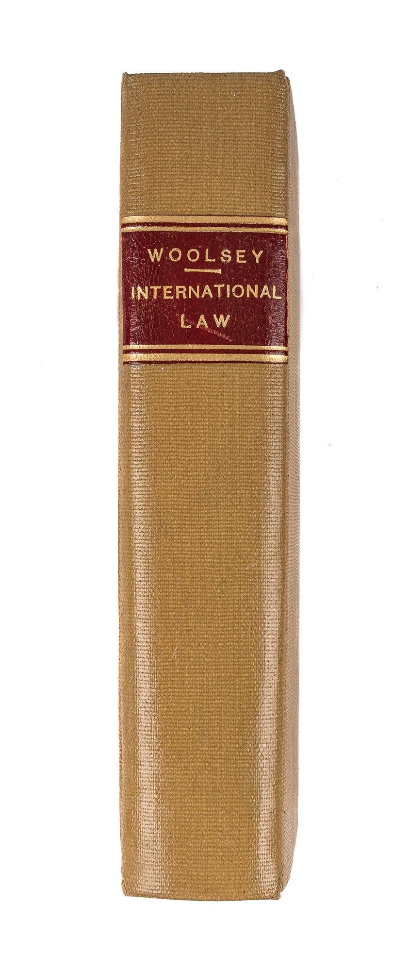 1892. Woolsey, Theodore Dwight, [1801-1889]. Introduction to the Study of International Law. Designed as an Aid in Teaching and in Historical Studies. Sixth edition, revised and enlarged. New York: Charles Scribner's Sons, 1892. xix, 527 pp. Modern tan library buckram with red gilt stamped spine label. Light shelfwear. Ex-library with bookplate of Supreme Court of the United States with discard stamp to front pastedown. Internally clean and bright. A very good copy. $125. * Later issue of the sixth and final edition. Woolsey, a professor at Yale (and later its president), was one of the founders of modern American political science. First published in 1860, this popular and well-regarded introduction to the principles of international law was revised several times to improve the text and address questions about neutral and belligerent rights raised by the American Civil War. "Although trained in the law," Woolsey "approached [this book] from the standpoint of the historian and the moralist. Written clearly, and with great fairmindedness, and penetrated with deep religious spirit, his book...has had a wide popularity and influence. It was several times reprinted in England. It was even translated into Chinese. Being the latest authority during the Civil War, it and its author had great authority in the burning questions of that troubled time" (Marke). Woolsey's Introduction continued to be printed into the 20th century, though it was no longer revised after the first issue of the sixth edition in 1878. "Woolsey, Theodore," International Law II:517 cited in Marke, A Catalogue of the Law Collection of New York University (1953) 585.