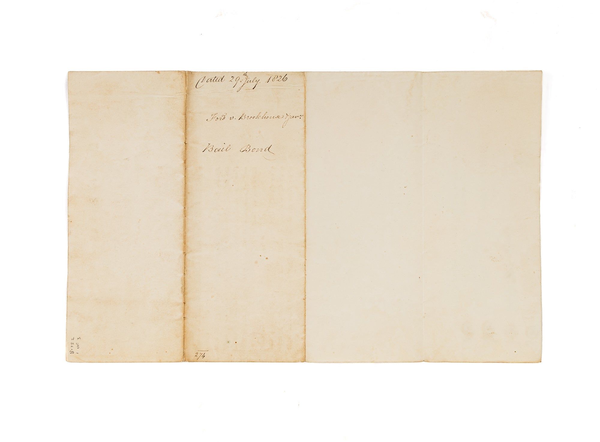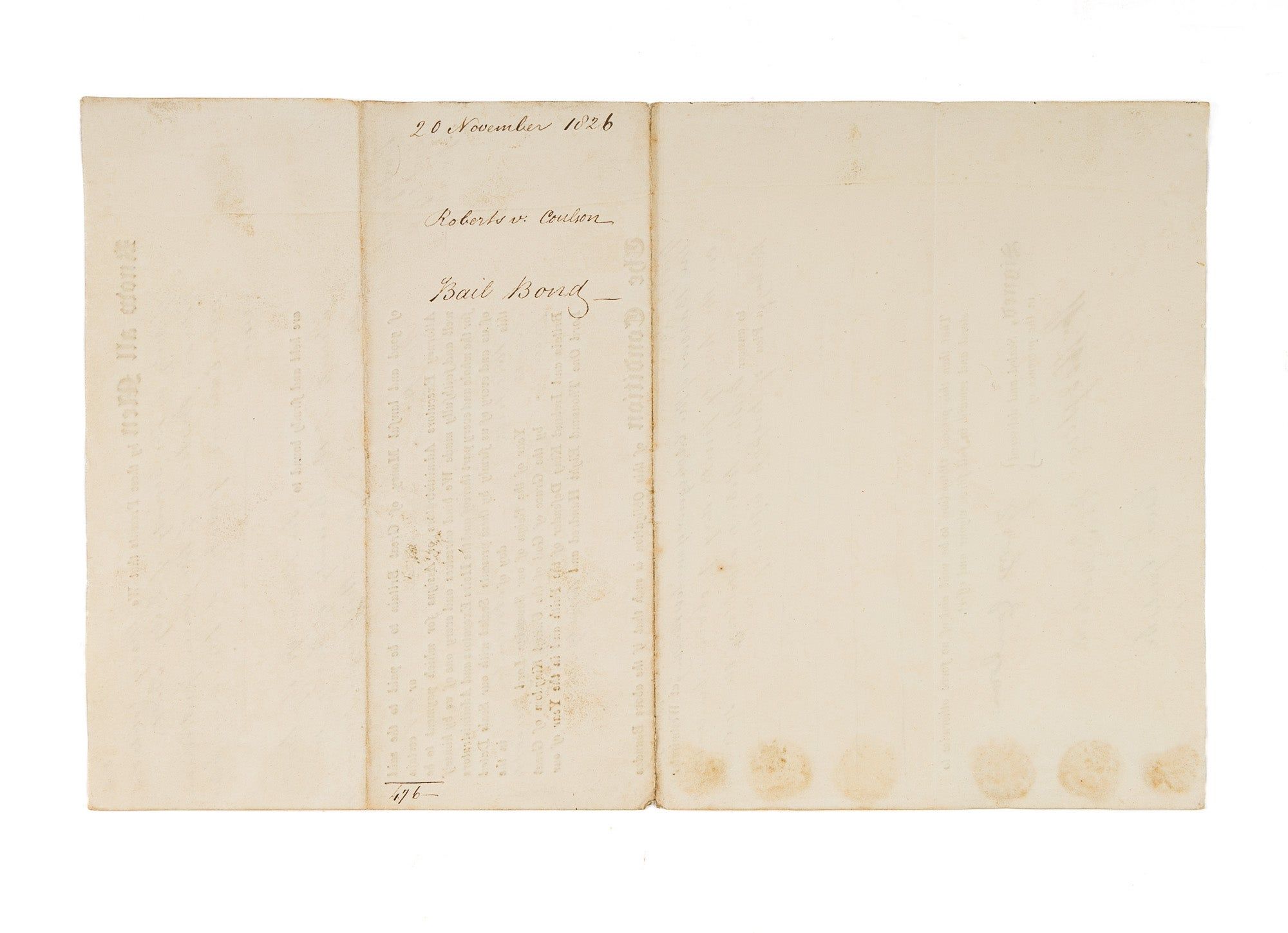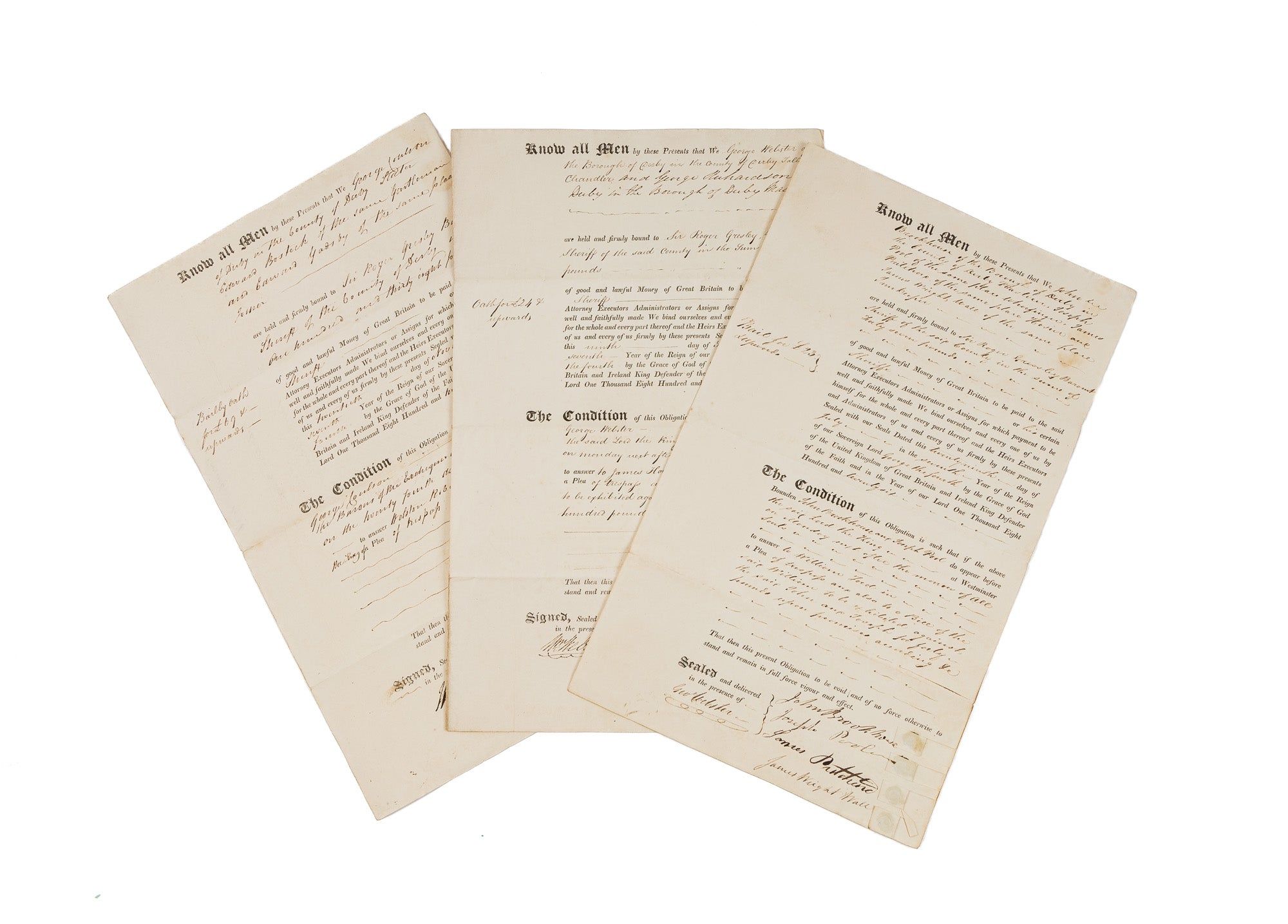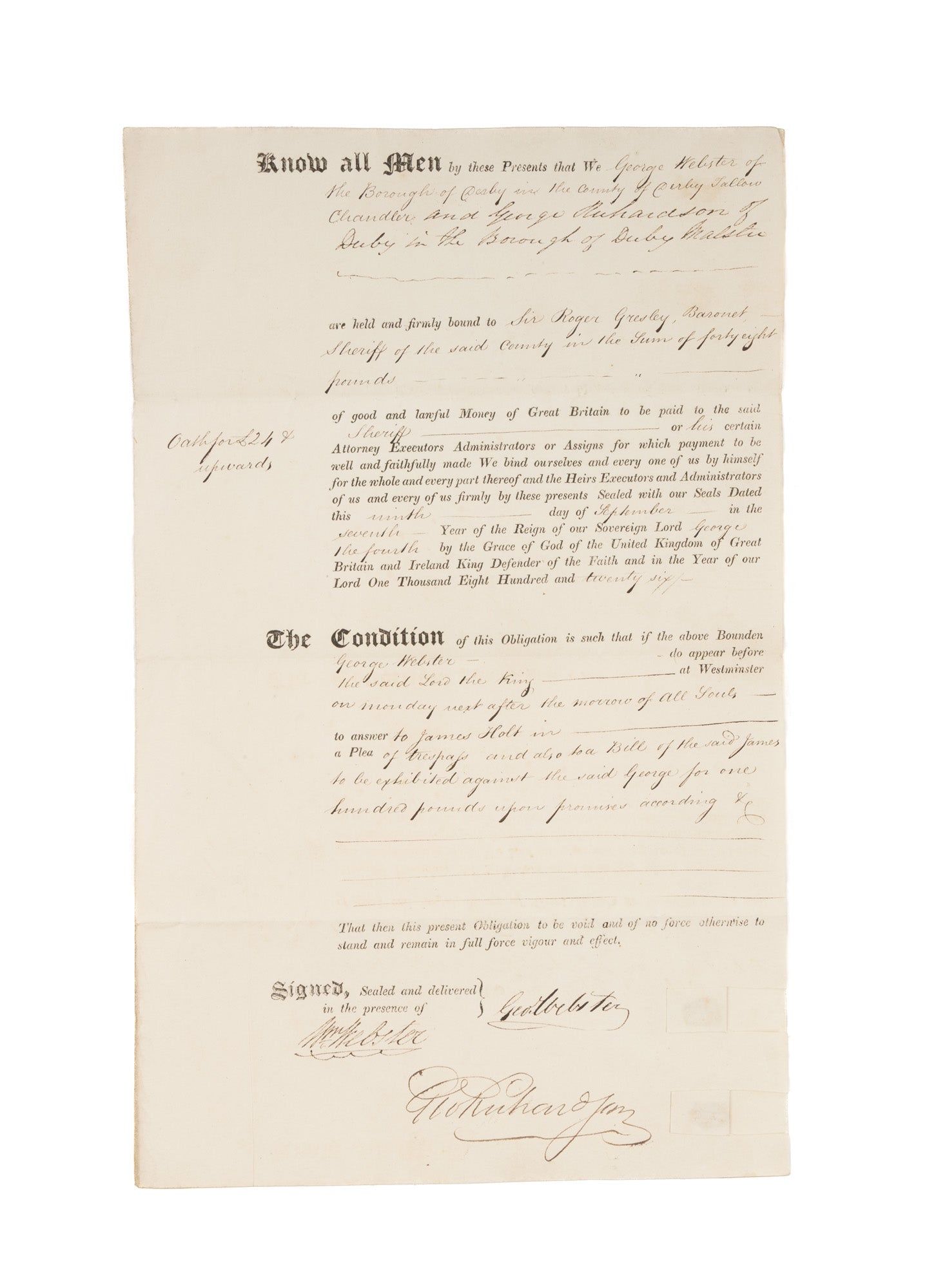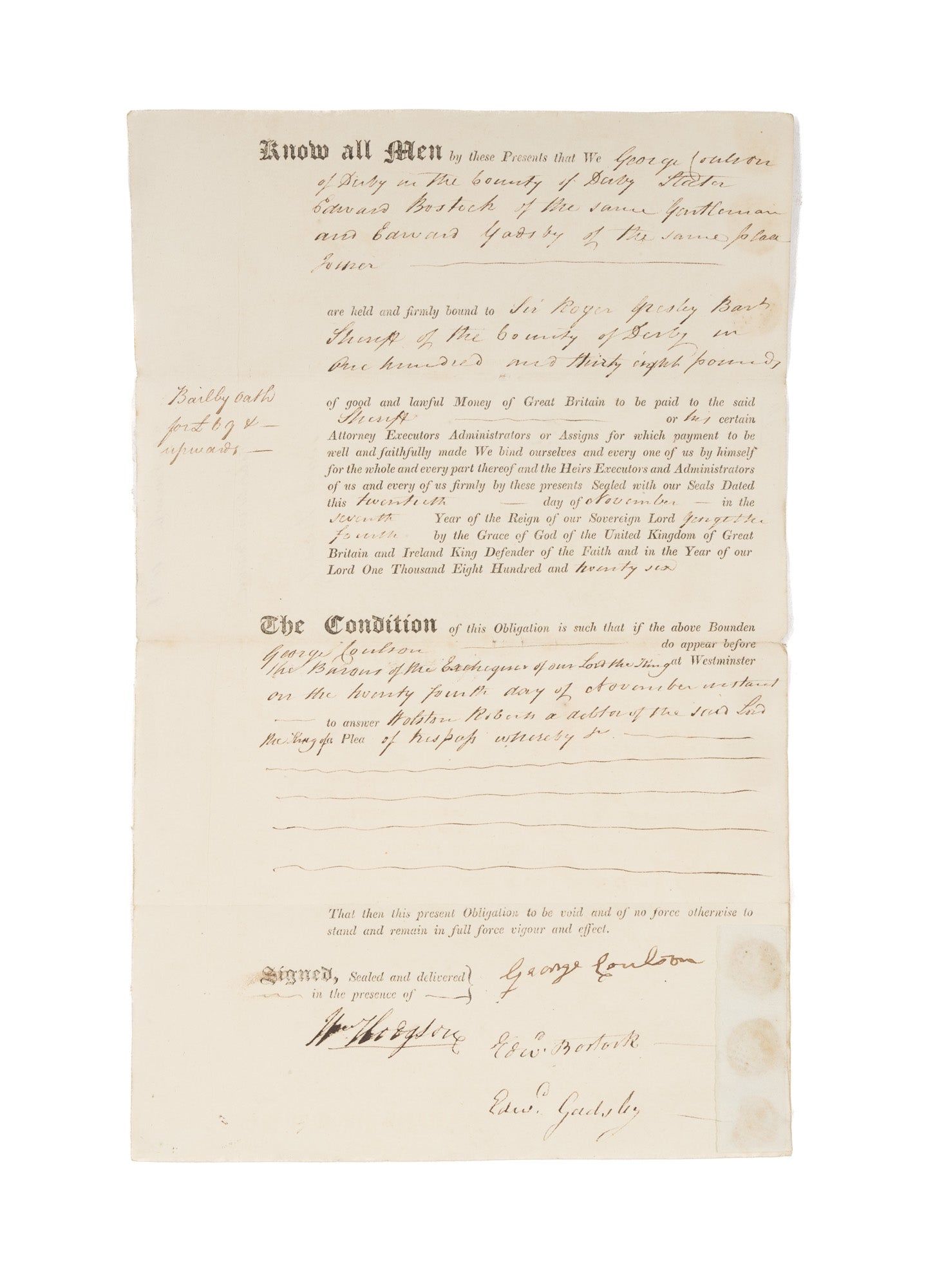 1826. Bail Bonds from the Time of King George IV [Legal Forms]. [Great Britain]. [Group of Three Bail Bonds, Derbyshire, July 29, September 9 and November 20, 1826]. 13" x 8" part-printed documents, two bifolia, one single leaf, docketed on verso of second leaf of bifolia and verso of the single leaf, wax seal next to signatures. Moderate toning, light soiling, horizontal fold lines, negligible light rubbing to edges. Three well-preserved items. $500. * Documents such as these offer a good street-level perspective of the judicial process. Contents: I. George Coulson, Edward Bostock & Edward Gadsby are bound to appear before the Barons of the Exchequer at Westminster to answer a plea of trespass to Wolston Roberts at a bail by oath of ?69; II. John Brookhouse, Joseph Pool, John Pritchard and James Wall are bound to appear at Westminster court to answer a plea of trespass to William Ford at a bail by oath of ?23; III. George Webster and George Richardson are bound to appear at Westminster court to answer a plea of trespass to James Holt at a bail by oath of ?24.