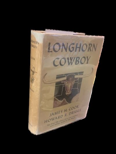 New York: Putnam and Sons, 1942. First Edition. Hardcover. Very Good/Good +. Herbert M. Stoops. 241 pp. Octavo. [20.5 cm] Tan cloth over boards. Title stamped on cover and spine, and author stamped in spine in brown ink. Publisher's brown topstain. Illustrated dust jacket, chipping along all edges. Small loss at head of spine. 6 cm closed tear along rear edge of spine. Some staining on the back board. Longhorn Cowboy details the adventure of Jim Cook as told by him, a direct descendant of the British sailor Captain Cook. He tells stories of setting off to find work ride herds of bulls in the Chisholm trail and guiding the U.S. army in the Geronimo uprisings in this authentic book about the old west.