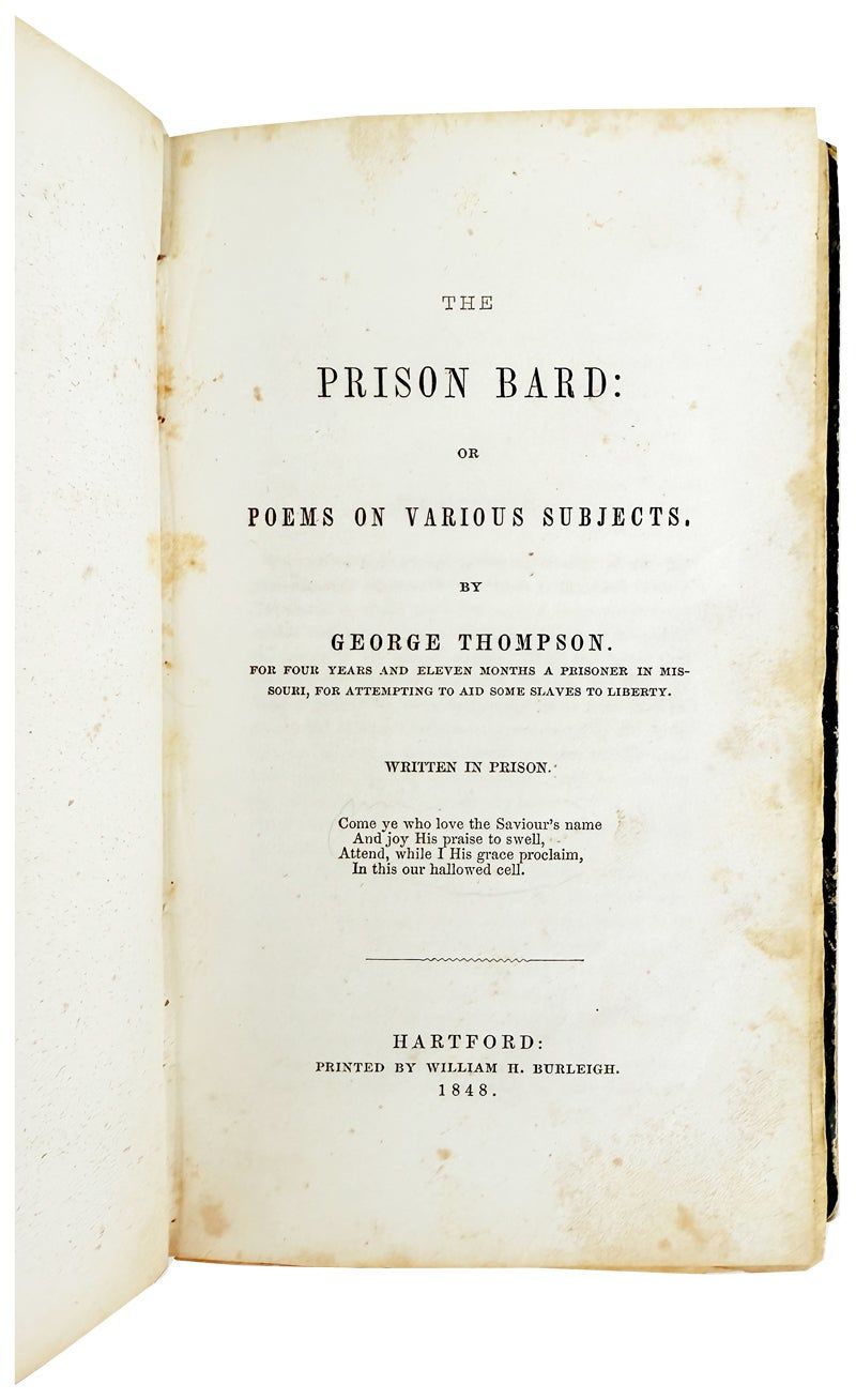 Hartford, [CT]: Printed by William H. Burleigh, 1848. Very Good. Hartford, [CT]: Printed by William H. Burleigh, 1848. First Edition. Octavo. 215pp. Bound in contemporary black leather spine over navy speckled paper-covered boards with "Prison Bard" in gilt to spine; peach endpapers. Boards worn with exposure to edges and general scuffing. Binding sound. Contemporary female ownership inscription to preliminaries; spotting and toning to pages but overall unmarked and legible throughout. A Very Good copy of this collection of verse written by Thompson, who was imprisoned for four years and eleven months for attempting to aid enslaved peoples to freedom.