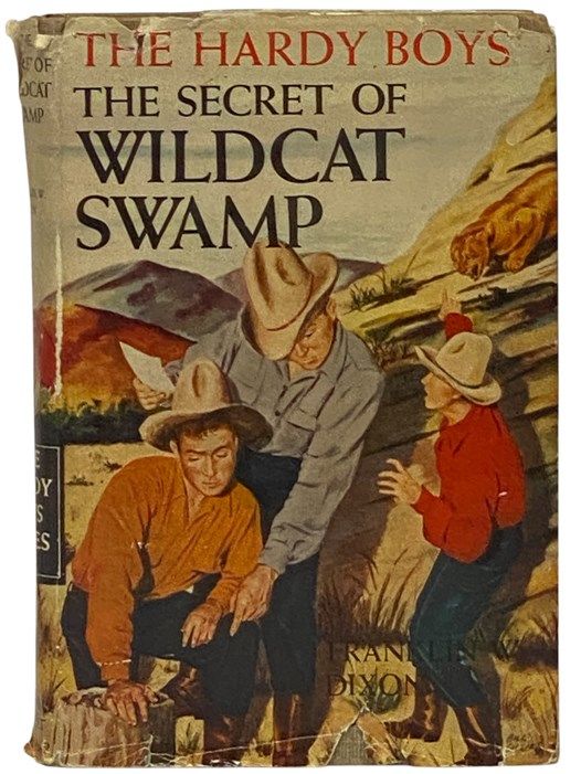 New York: Grosset & Dunlap, 1952. Reprint. Hard Cover. Good/Fair. 7x5x0. Gretta, J. Clemens; Gillies, Bill. Carpentieri 1956B-9. Very good in fair jacket. Jacket edges rubbed with several chips and tears, ink owner stamp on half-title page. 1952 Hard Cover. 214 pp. 8vo. #31 in The Hardy Boys Mystery series. Light brown tweed boards dark brown titles, orange Gretta endpapers, Bill Gillies jacket art. An invitation from Cap Bailey, science teacher at Bayport High, to accompany him out West to Wildcat Swamp on an archaeological expedition triggers off a series of dangerous events for Frank and Joe Hardy. On their way West the boys and Cap have a near-fatal accident in a private plane which has been sabotaged. Though warned to leave the area, Frank, Joe, and Cap doggedly remain until they have caught the cunning ex-convicts they are up against in this swift-paced adventure.