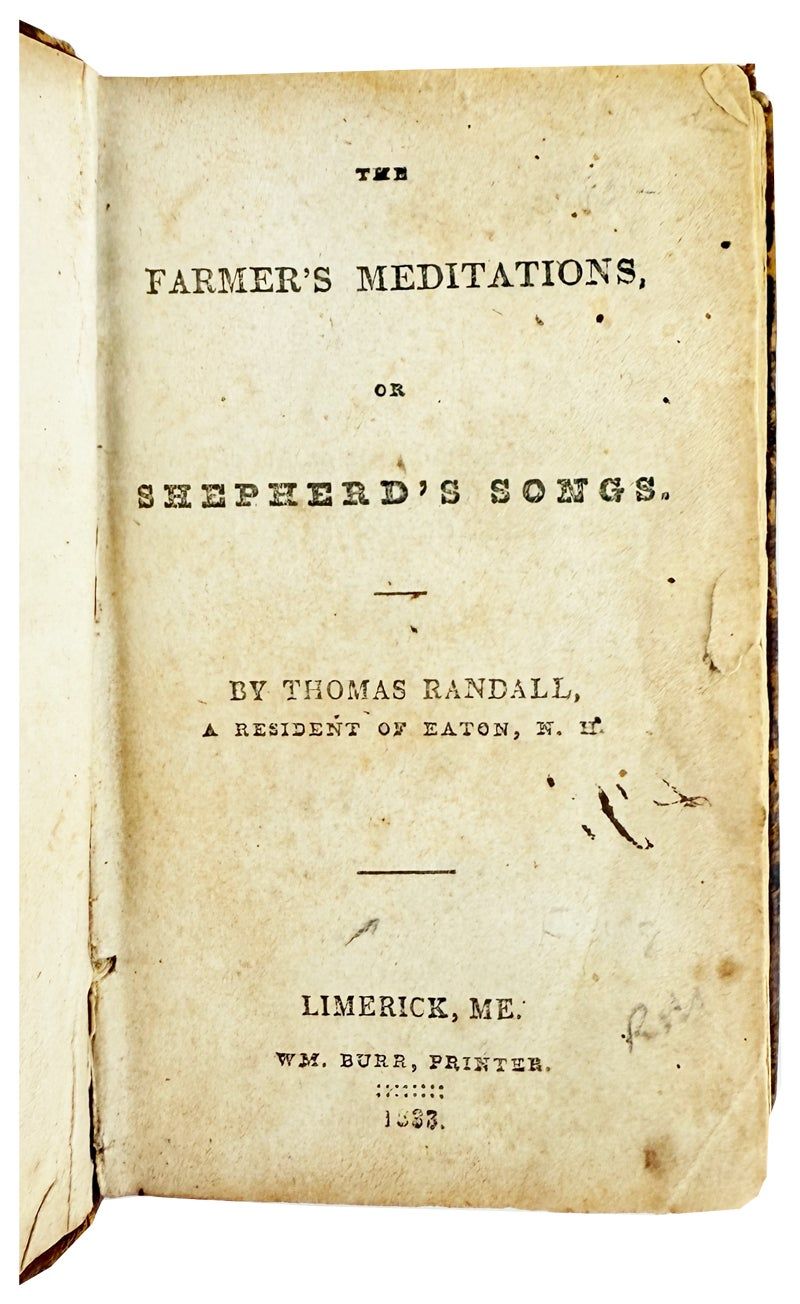 Limerick, ME: Wm. Burr, Printer, 1833. Very Good. Limerick, ME: Wm. Burr, Printer, 1833. First Edition. 16mo. 255pp. Bound in contemporary calf. Front hinge starting but form; mild scuffing. Binding sound. Lacks front free endpaper. Mild spotting and marginal chipping; overall Very Good and sound. At times poetic and sentimental, these poems from the Eaton, New Hampshire farmer also served to relay detailed local news of the day, with such selections as "On the Death of Esther Merrow, daughter of George Merrow" and "On the death of Gilman, Mooney, son of Hercules Mooney, of Eaton, N.H. who died in Haverhill, N.H. By his request his corpse was brought seventy miles and interred in his father's burying place." Randall shows his range in writing "On Madness" and "Late War between Poland and Russia." Uncommon.