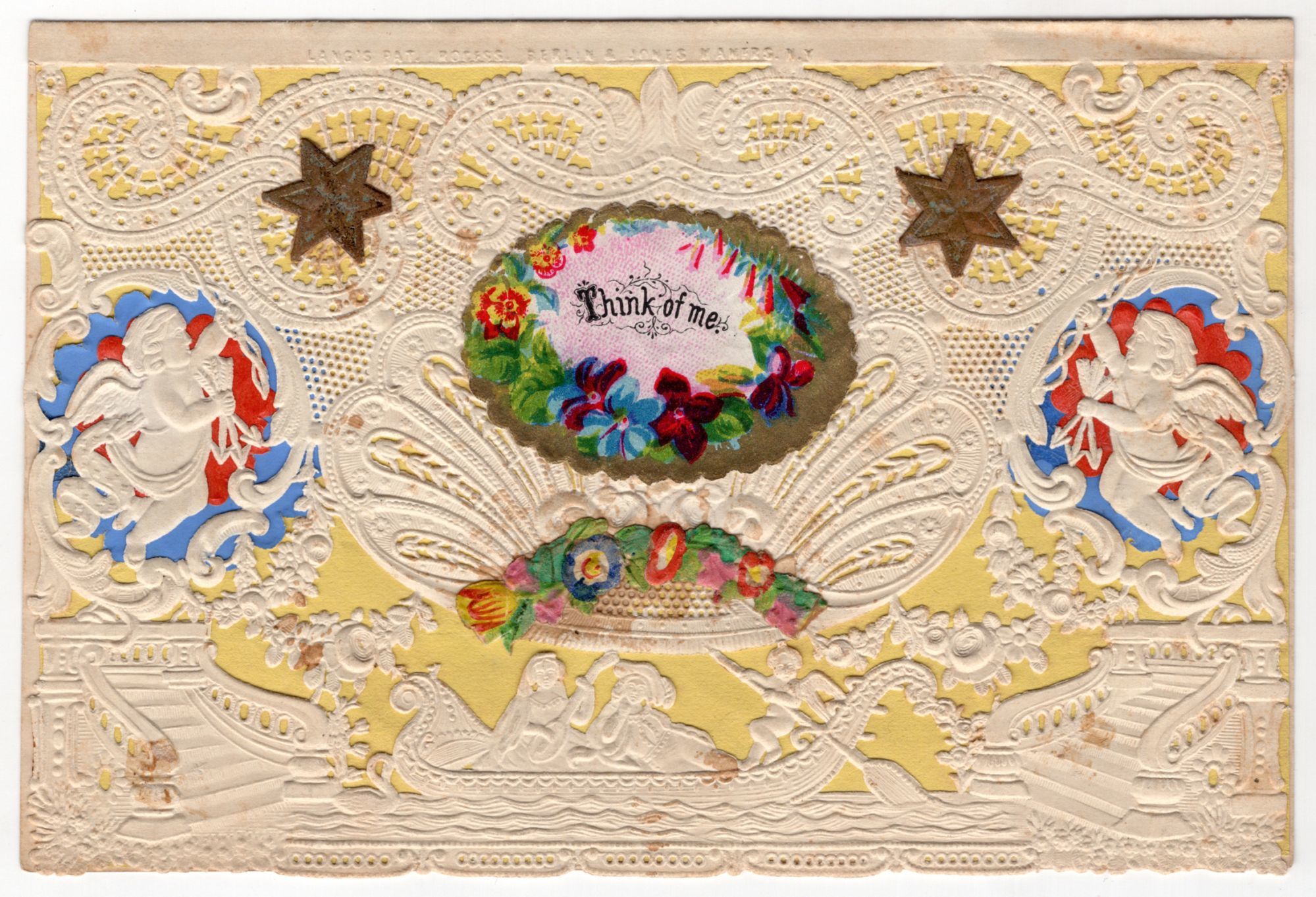 London: [Whitney Co.?], 1860. Very good. Some minor spotting or staining.. An elaborate 8vo valentine in oblong format, comprised of pictorial lace paper, embossed Victorian scrap, and decorated papers beneath to create depth and color. A central chromolithographed scrap reads "Think of Me" surrounded by flora. The pictorial lace paper is elaborate, and depicts musicians floating on a boat being steered by a winged putti, with two more winged putti on either side of a central cartouche. Inside is a brief chromolithographed scrap with two stanza poem, "The Wish". Possibly produced by Whitney Co. Bifolium (5.5" by 3.75").