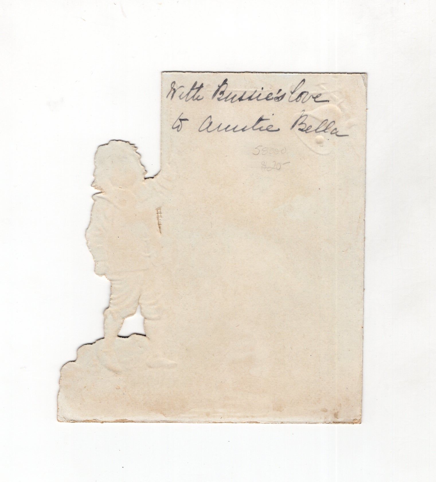 England, 1890. Very good. A little dust soiling.. A die-cut christmas greeting card depicting a little boy ringing a bell, with lines of poetry that read, "This Christmas-time, when all are bright and gay, May your young heart keep gladsome holiday." Early ink inscription reads, "With Bussie's love to Auntie Bella" on verso. Chromolithographed, die-cut, embossed. Measures approx. 4" by 3.5