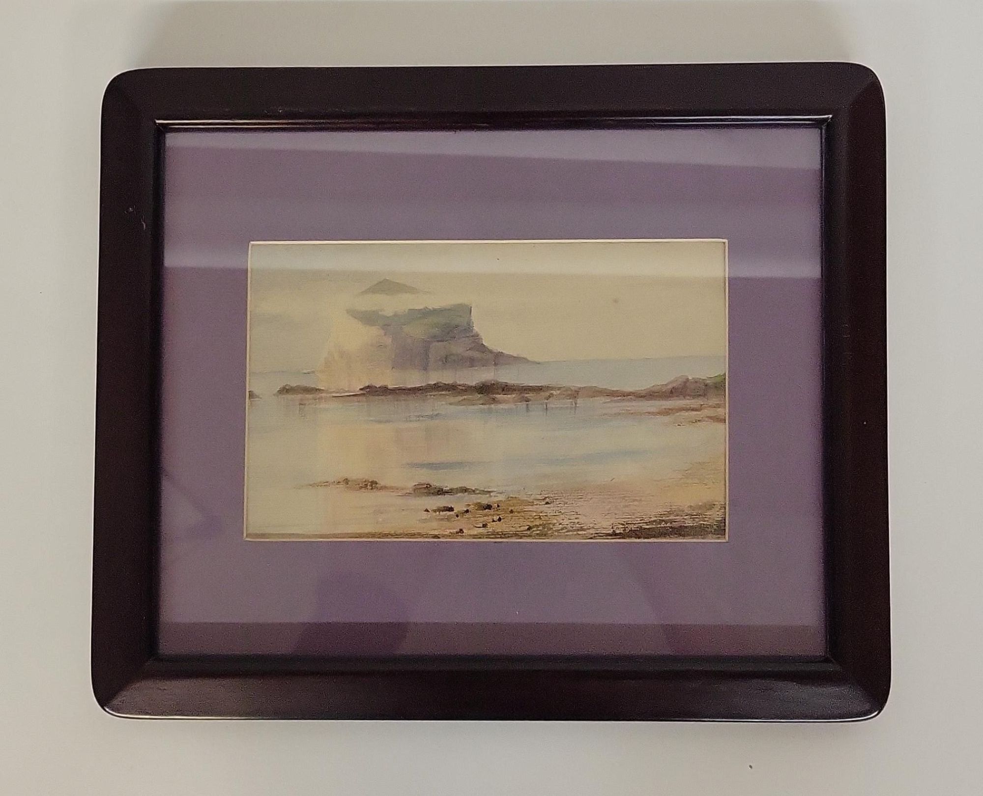 North Berwick, Scotland, 1863. Watercolor on paper. In Very Good Minus condition housed in a Very Good Minus frame. Painting measures w. 9 in. by h. 4.75 in. Frame measures w. 11.25 in. by h. 9.5 in. Moderate scuffing to frame. Paper moderately toned with minor soiling and light foxing, consistent with age. Paper backing on painting is slightly longer than the backing on the frame, sticks out slightly though not visible from the front. Title and date in lower right corner. Item no. P149. EH consignment. Shelved Rockville. 1393065. Arts & Antiques.