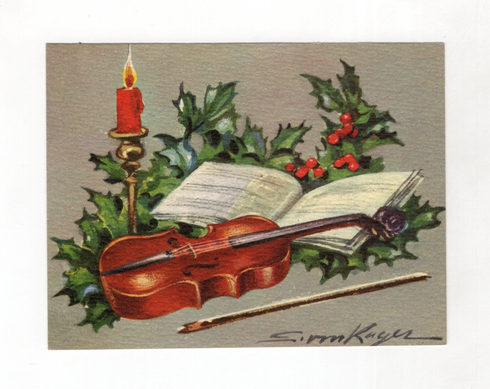 United States, 1950. Very good to near-fine.. Printed Christmas greeting card reproducing a still life of a violin, sheet music, red candle, and open sheet music against a cluster of holly. Measures approx. 4.25" by 3.25". Signature of artist in lower right-hand corner ("Simon Kuyer"?).