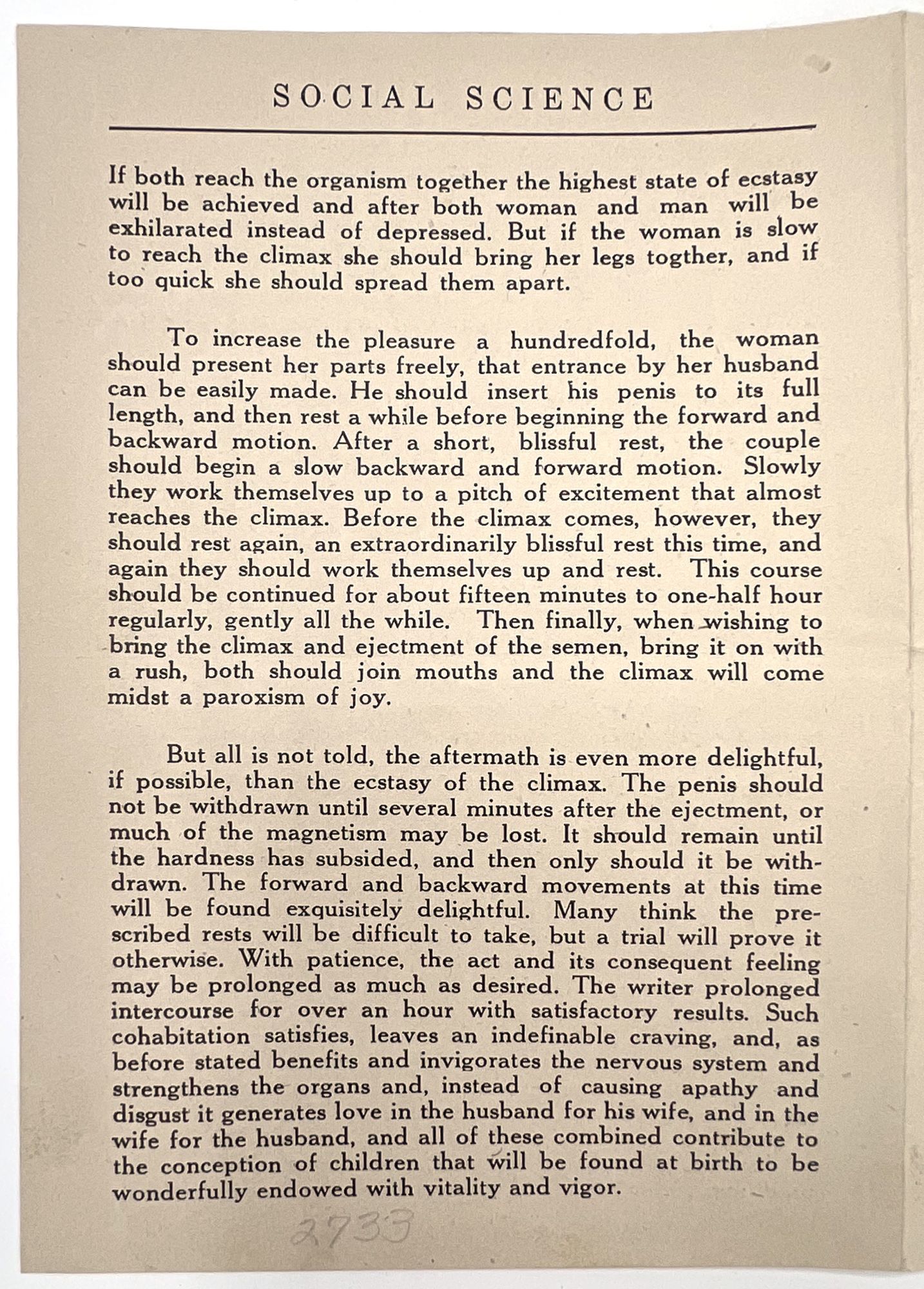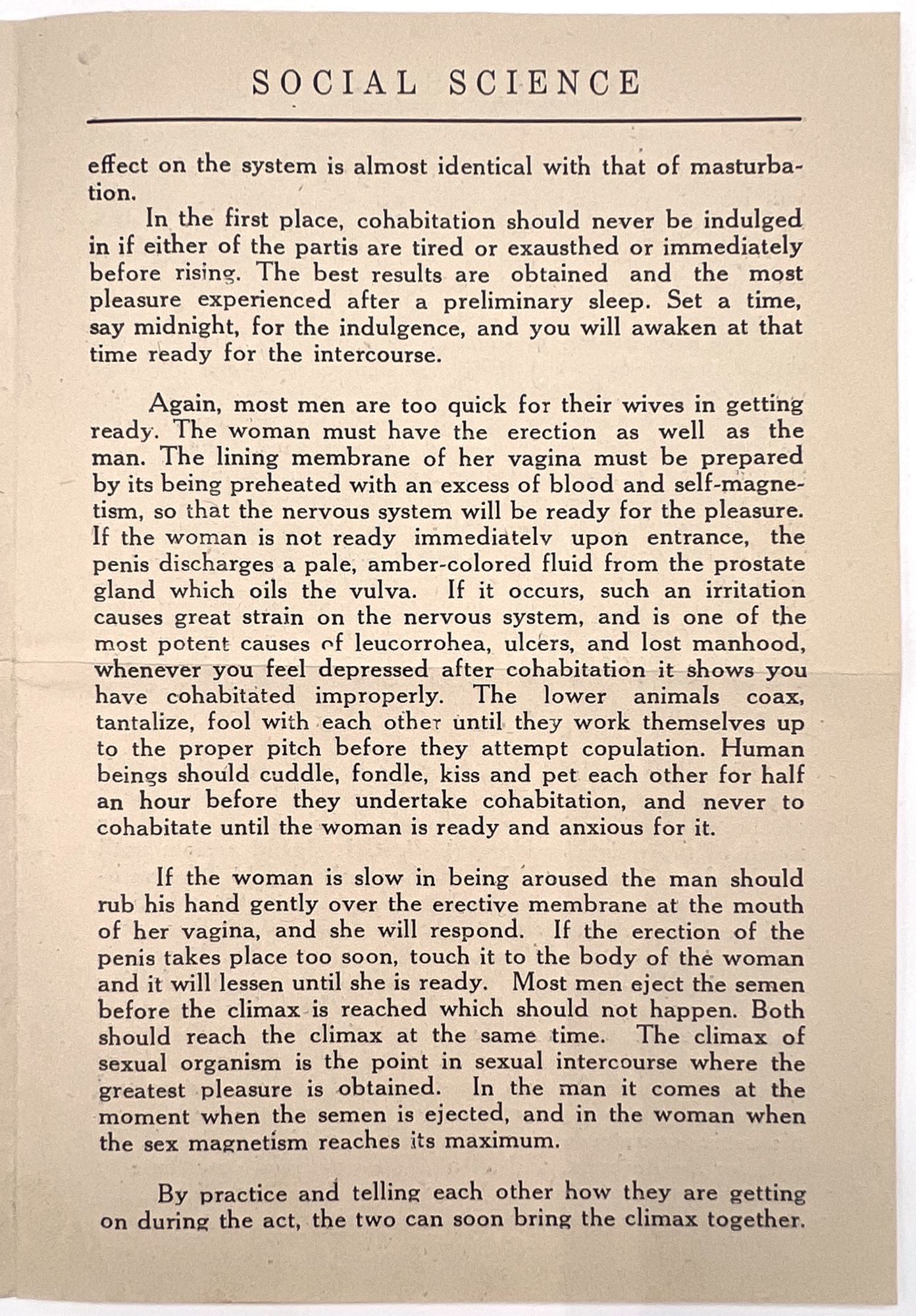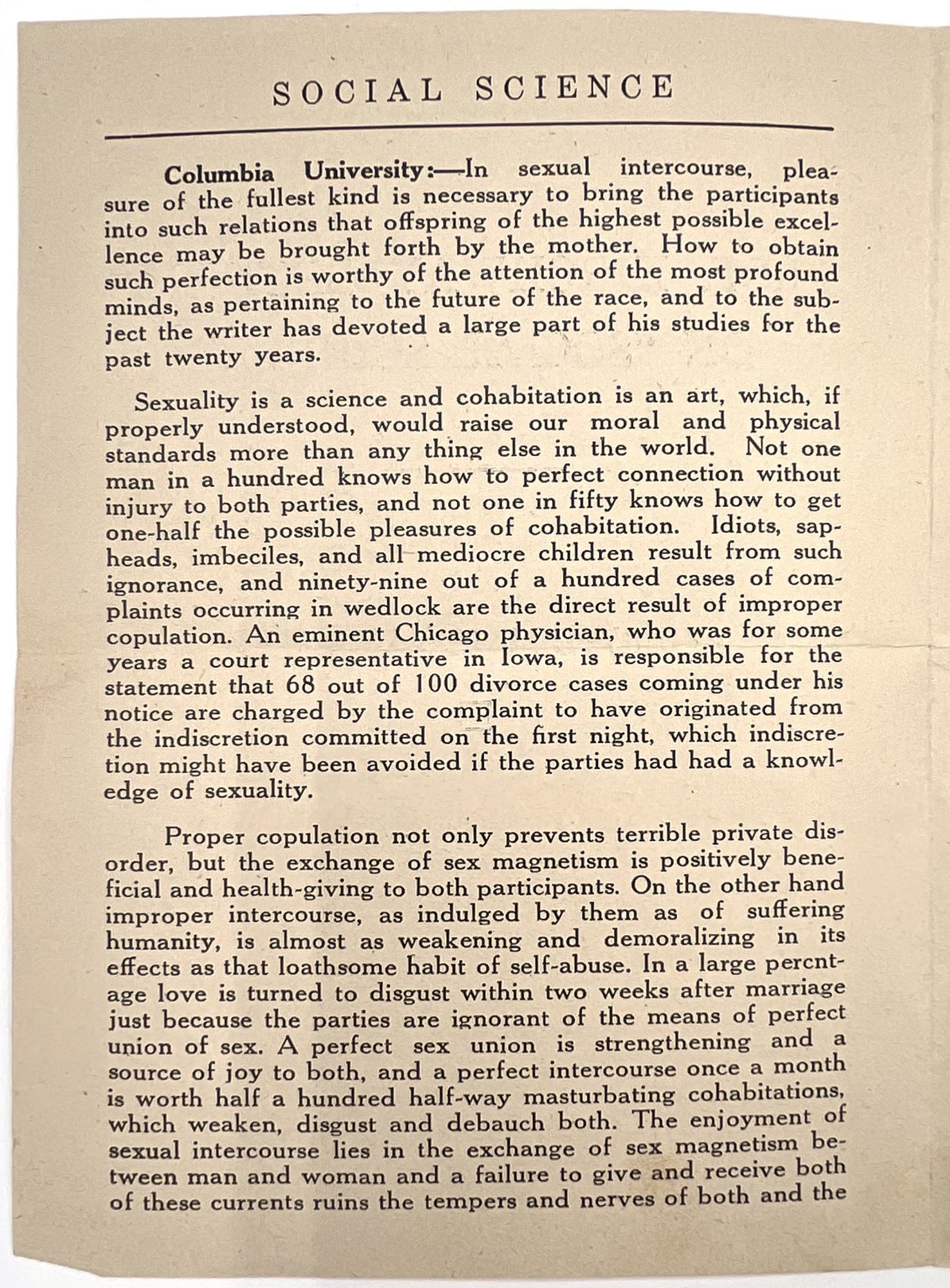 N.pl: N.p., 1930. Very good. Light toning, letter folds, crease to bottom right-hand corner.. A clandestine printed lecture purportedly given by a "Professor Kirchway" of Columbia University, offering a brief but detailed guide to maximizing pleasure during sexual intercourse. Advocates for the importance of "proper copulation" to the longevity and success of a marriage, and emphasizes the importance of pleasure for both parties (rather than just the male). Proceeds to describe the ideal act in great detail, ending with "a paroxysm of joy" for both parties. Concludes with a claim that satisfactory acts will ultimately produce the conception of children that are "wonderfully endowed with vitality and vigor" as a result of the couple's efforts. What is most interesting about this pamphlet is the attributed authorship, which seems to imply Professor George W. Kirchwey (1855-1942), spelled here "Kirchway", but this seems unlikely as he was a legal scholar. What seems more likely is that it was penned by Freda Kirchwey (1893-1976), an active feminist who published on changing social morals and attitudes towards sex in the 1920s. Printed bifolium (7" by 5").