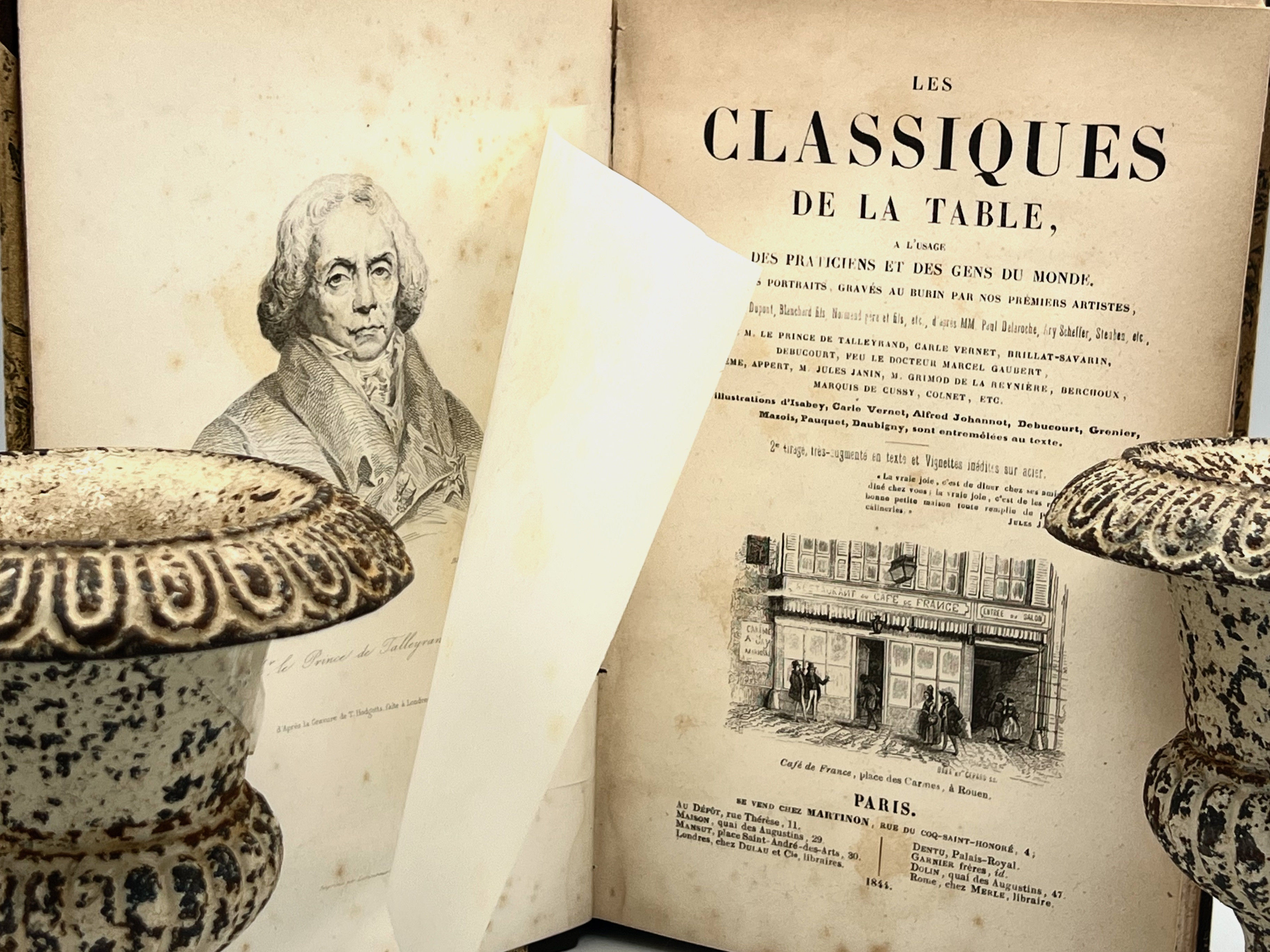 Beautifully illustrated with engraved portraits (with tissue guards). Previous owner's signature on half title page. Subtitle translated: The classics of the table for the use of the practitioners and people of the world, with engraved portraits - De M. Le Prince De Talleyrand, Carle Vernet, Brillat-Savarin, Debucourt, Feu le Docteur Marcel Gaubert, Careme, Appert, M. Jules Janin, M. Grimod de la Reyniere, Berchoux, Marquis de Cussy, Colnet, etc. Lovely portraits combined with narrative. Text in French. Some foxing. From the estate of Dan Samuel, 4th Viscount Samuel (1925-2014), grandson of Herbert Louis Samuel, 1st Viscount Samuel, High Commissioner of Palestine (1920-1925). [CAGLE 190, third edition] [VICAIRE 178]
