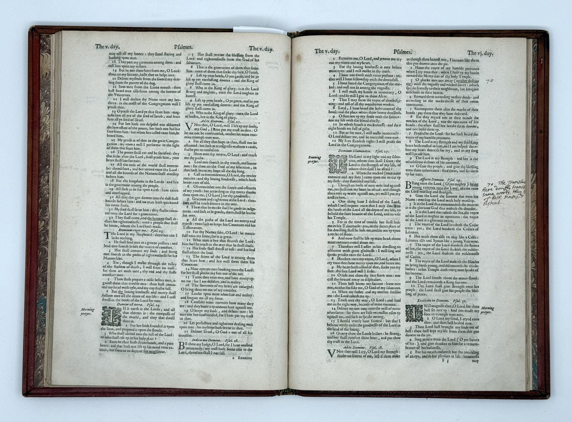 London: Imprinted at London by Bonham Norton, and John Bill, printers to the Kings most Excellent Maiestie, 1629. Title within woodcut border. Calendar printed in red and black. Text in two columns, with ornament sectional headpieces and initials. [100] pp. Signatures: A⁴ B-H⁶ I⁴. 1 vols. 4to. Reddish-brown roan over bevelled boards tooled in blind, with contrasting gilt labels, marbled endpapers, a.e.g., by Riviere. Title leaf remargined at gutter, trimmed a bit close to top, elsewhere shaving to some of the occasional annotations. Title within woodcut border. Calendar printed in red and black. Text in two columns, with ornament sectional headpieces and initials. [100] pp. Signatures: A⁴ B-H⁶ I⁴. 1 vols. 4to. A decorative copy in late nineteenth century binding, with the tite leaf likely supplied from another copy. The state prayers mention both King Charles and Queen Mary, but no children; the royal couple's first heir, the future King Charles II, was born the following year (prayers for Prince Charles appear beginning 1632/3 editions).