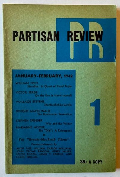 New York: Partisan Review, 1942. Original wraps. Near Fine. A solid, sharp copy of the Jan-Feb 1942 issue of Partisan Review, Vol. IX, No. 1. Clean and VG+ to Near Fine in its light-green wrappers. Contributors to this issue include Wallace Stevens, Dwight MacDonald, Stephen Spender, Marianne Moore, among others.