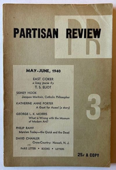 New York: Partisan Review, 1940. Original wraps. Very Good +. A very presentable copy of the May-June 1940 issue (Vol. VII, No. 3). Solid and VG+ in its gray printed wrappers, with just a touch of light spotting at the panels. Contributions, including a "long poem" by T.S. Eliot, Katherine Anne Porter, Philip Rahv, Sidney Hook, etc.