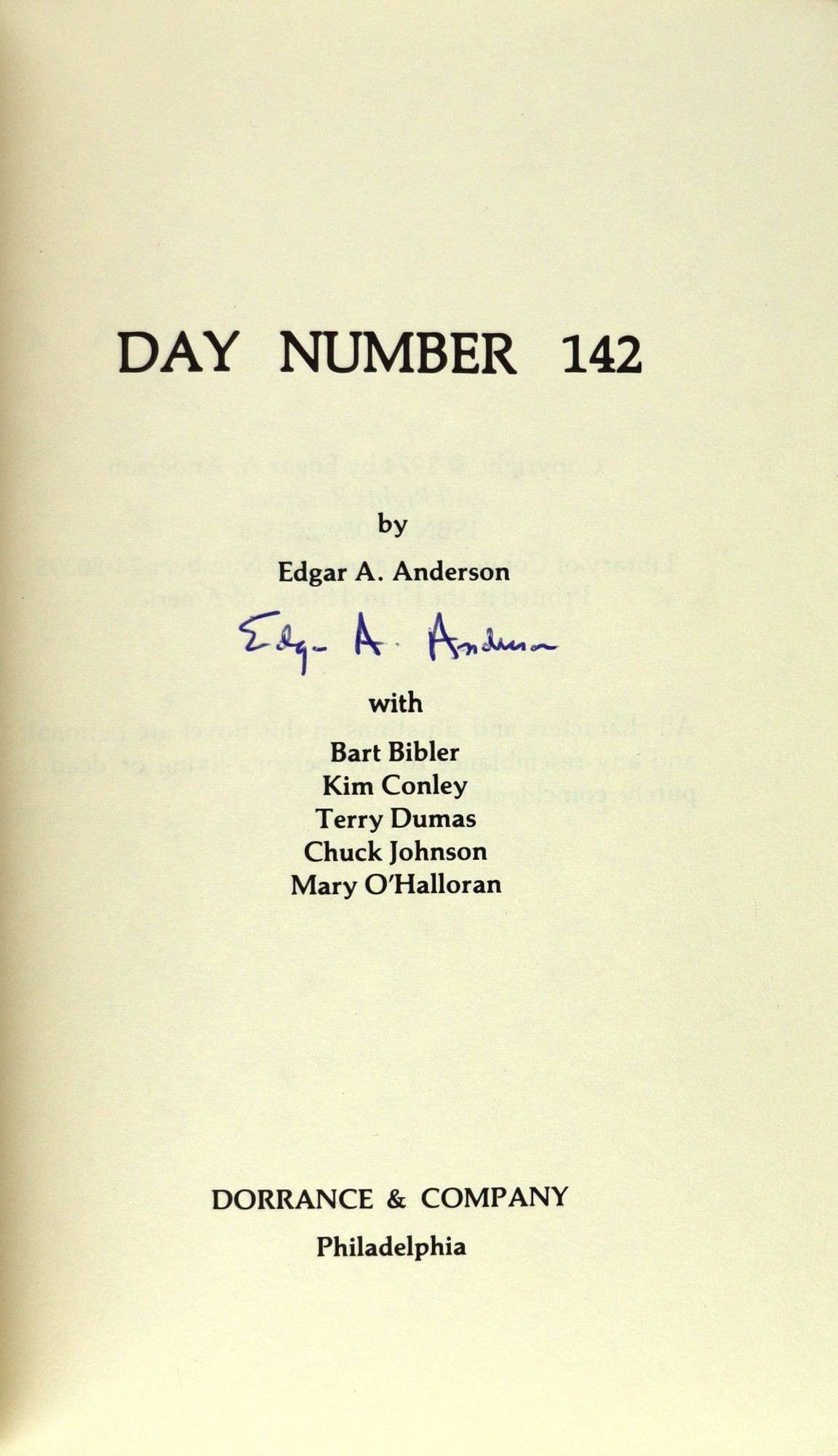 Philadelphia: Dorrance & Company, 1974. Very Good. Philadelphia: Dorrance & Company, [1974]. First Edition. Octavo; publisher's cloth in black dust jacket retaining original price ($4.95); vi,137pp. Moderate wear to jacket margins including tiny chip at top margin of upper panel, corners nudged, inscribed and signed "Ted" (the author?) to front free endpaper. Additionally signed Edgar A. Anderson on title page in the same blue ballpoint pen. A Very Good, sound copy. Promotional flyer laid in.