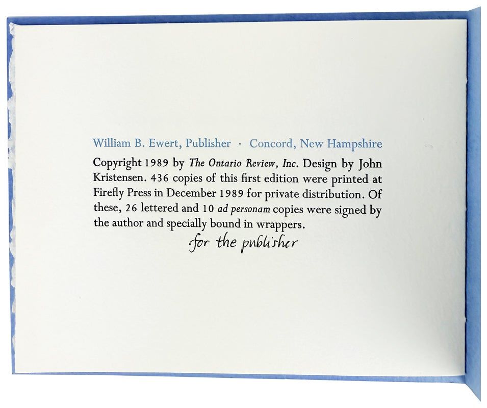 Concord, NH: William B. Ewert, Publisher / Firefly Press, 1989. Near Fine. Concord, NH: William B. Ewert, Publisher / Firefly Press, 1989. Limited Edition of 436 copies, this being one of 10 "ad personam" copies signed by Oates and specially bound in wrappers; this copy designated as "for the publisher." Single sheet folded and bound in printed wraps. Touch of rubbing to edges. Binding sound and pages unmarked; Near Fine.