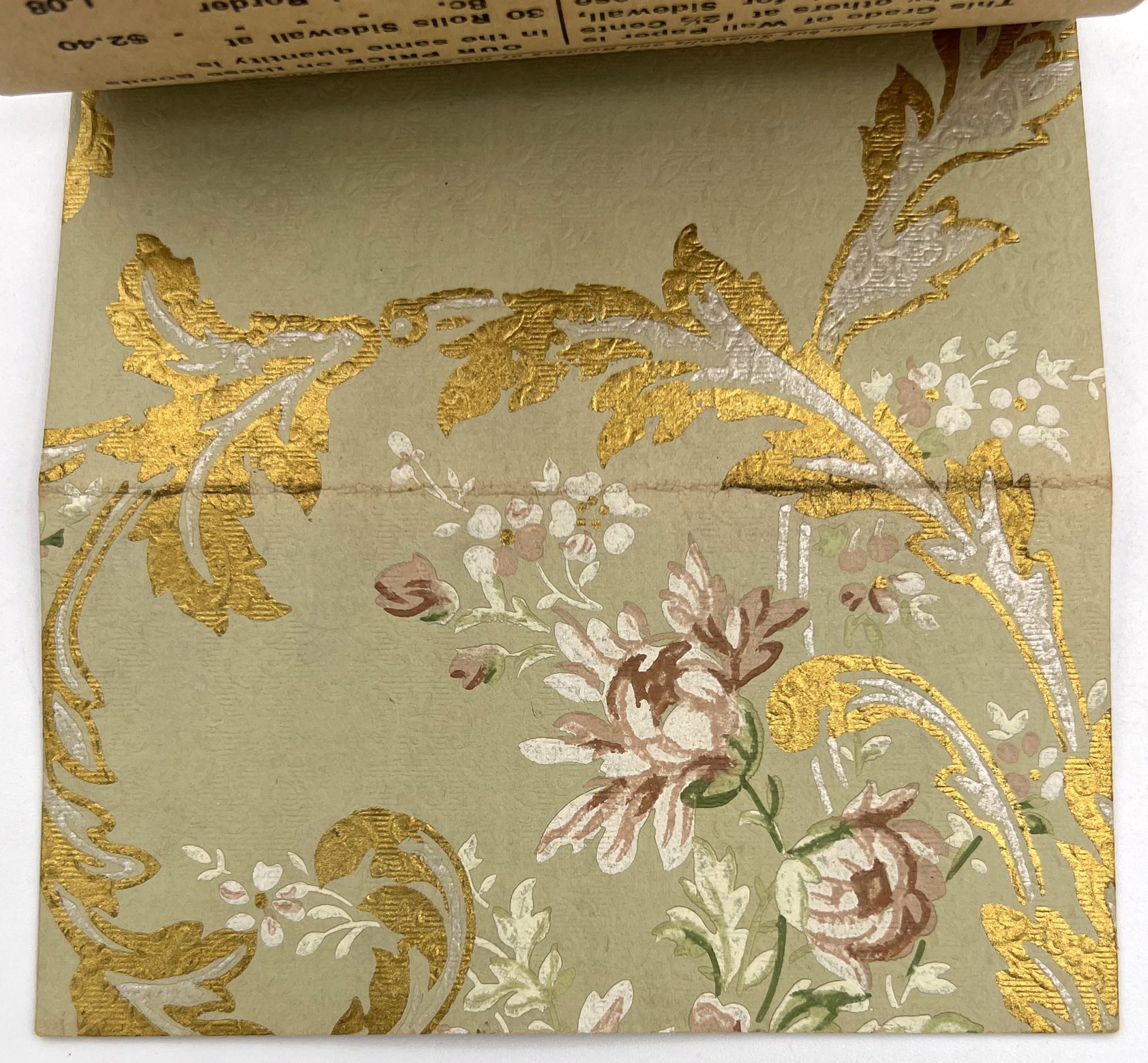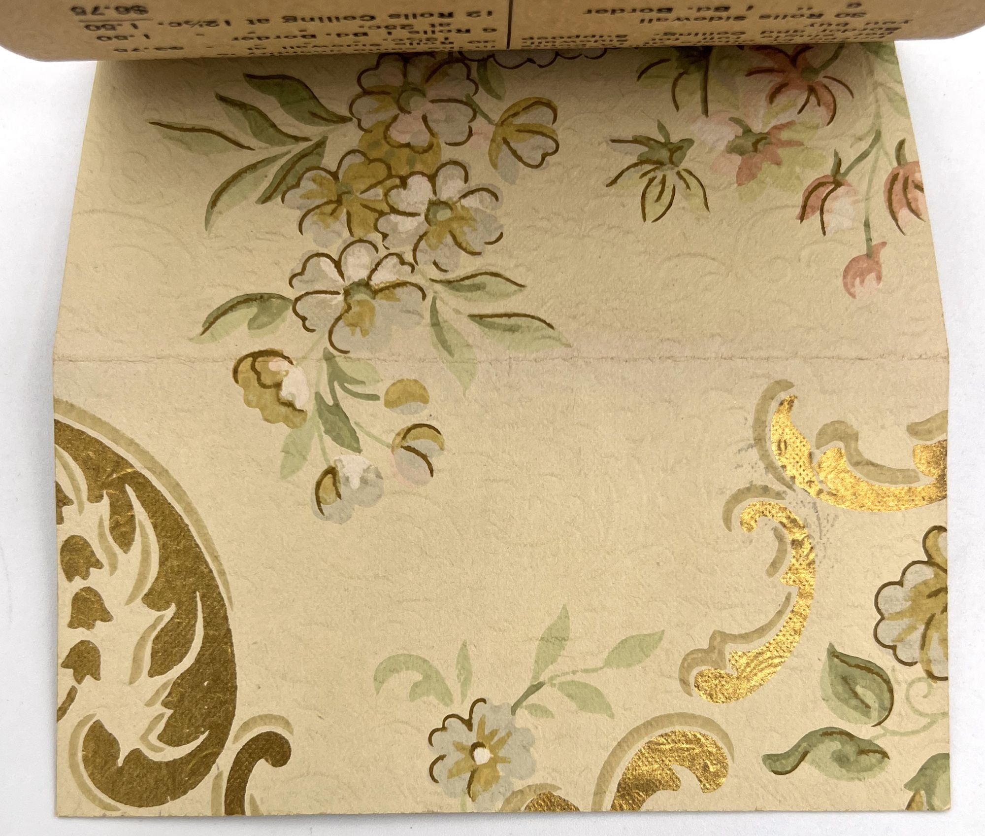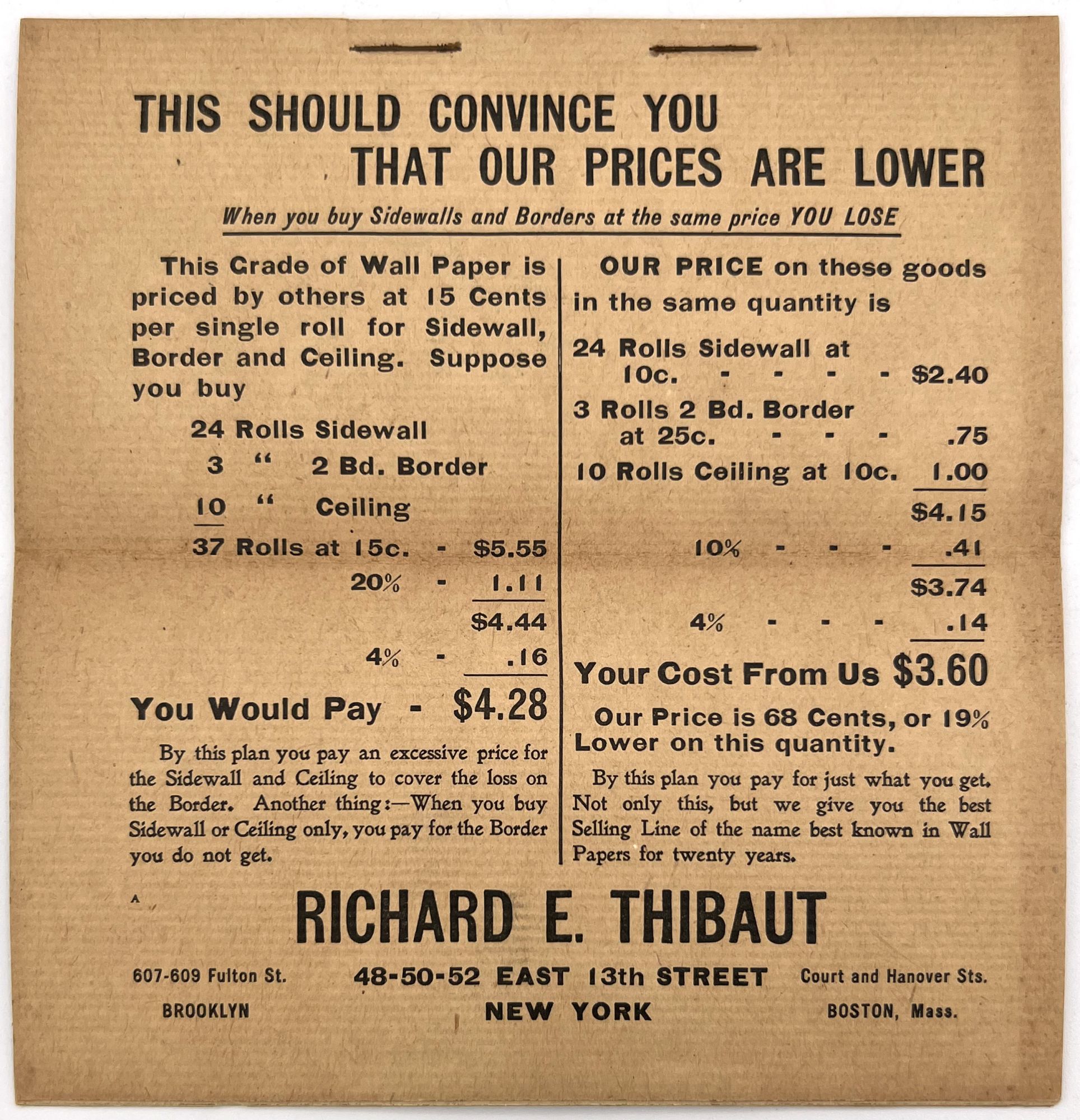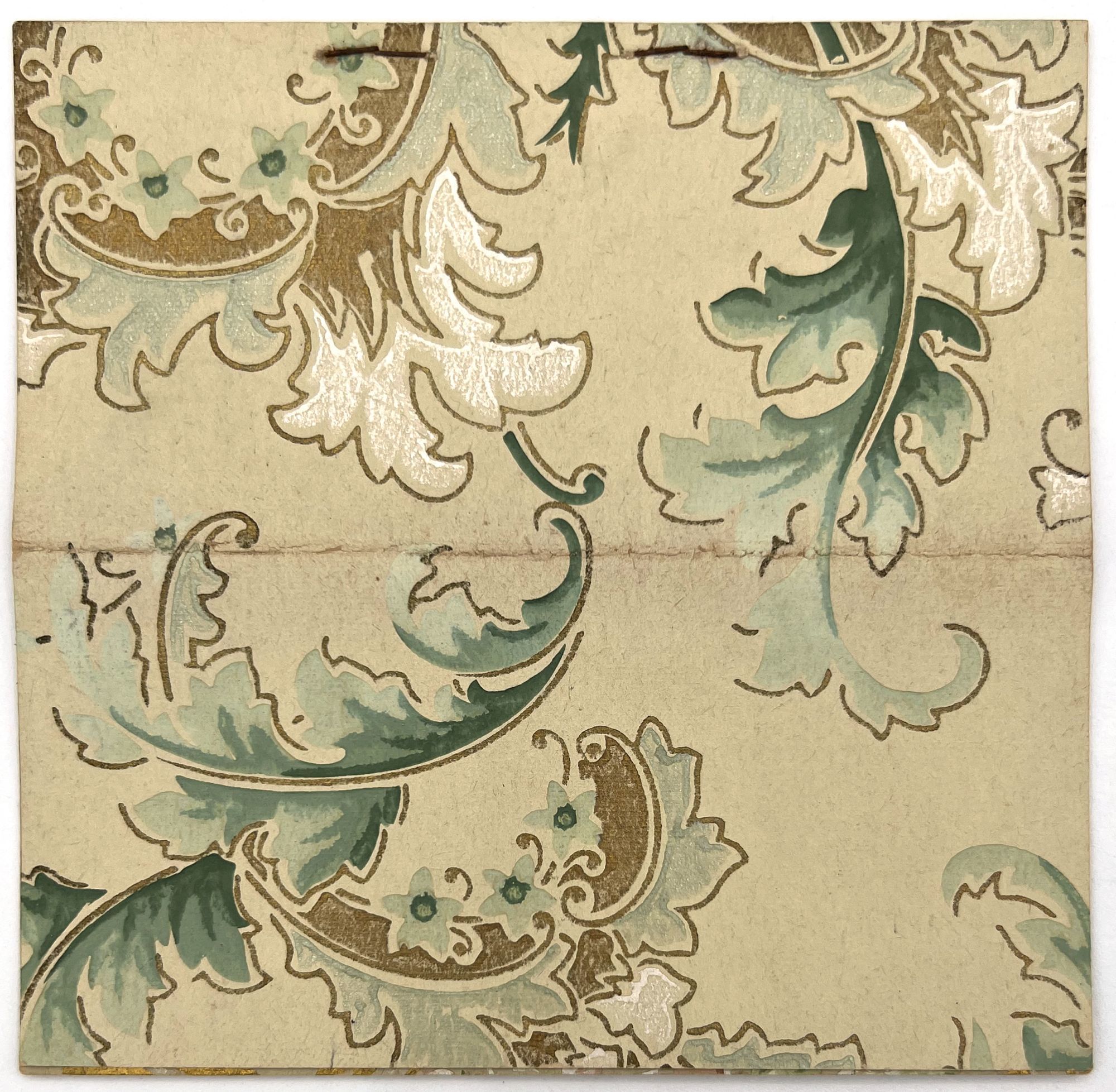Sellersville, Pennsylvania, 1890. Very good. Toning,. Four (4) items collected by a house and sign painter named Henry H. Cope of Sellersville, Pennsylvania. Includes two illustrated advertising covers, stapled samples of block-printed wallpaper, and Cope's own printed business card. The items appear to have been sent to Cope promoting their products for him to use on the job; the companies include Richard E. Thibaut (wallpaper manufacturer), Berry Brothers (varnish manufacturer), and John Lucas & Co. (manufacturer of varnishes, brushes, paints and glass). The smallest item (business card) measures approx. 2.25" by 4" and the largest (the wallpaper samples) measures approx. 6" by 6" and includes four leaves.