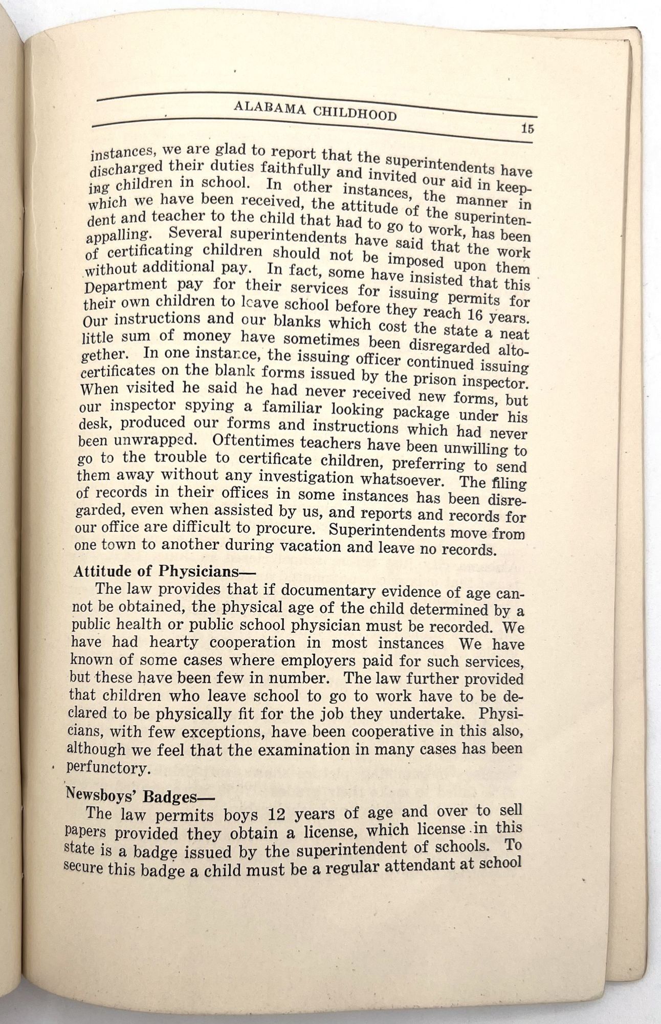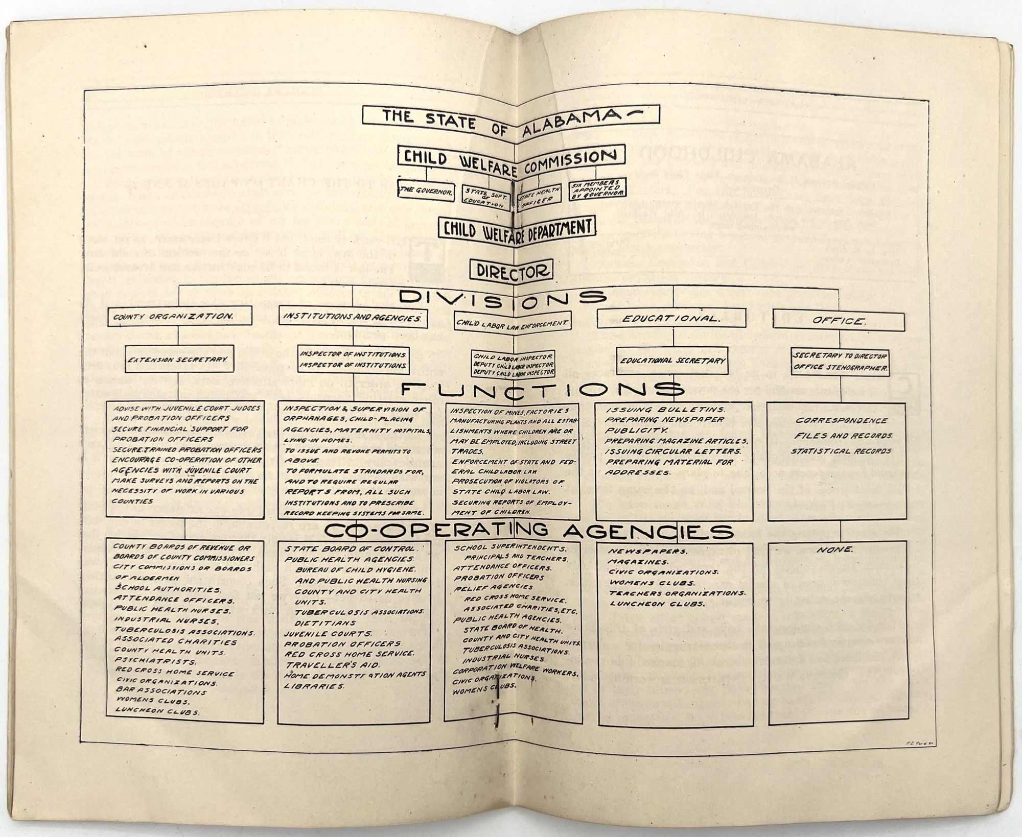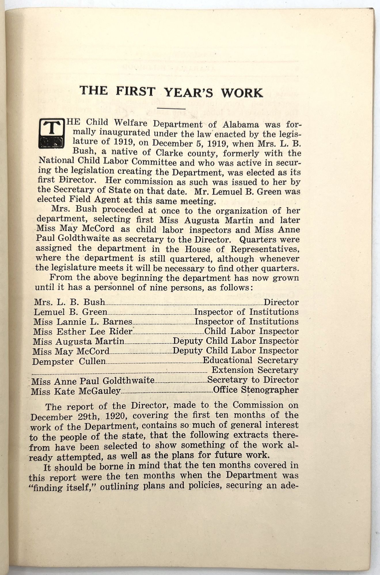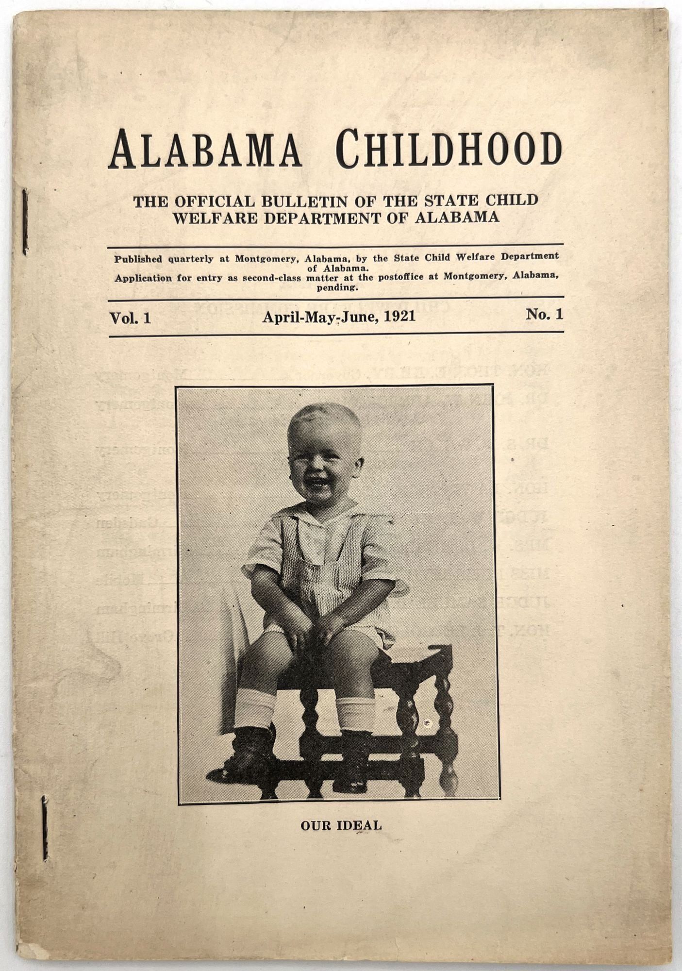 Montgomery, Alabama: Child Welfare Department of Alabama, 1921. Very good. Dust soiling.. Volume I, No. 1 of "Alabama Childhood", the "official bulletin of the State Child Welfare Department of Alabama". The first issue of a new series published in 1921 to highlight the importance of child welfare, and to report on the activities of Alabama's state child welfare agency. Formed in 1919, the Child Welfare Department of Alabama aimed to improve the lives of the state's children by battling poverty and child labor. This issue includes reports on work by the department in its first years, demographics and statistics (including some divided into "White" and "Colored" categories), and plans to improve healthcare for families and children. Also includes a chart showing the department's division, functions, and related agencies. Provides important insight into child welfare in Alabama in the 1920s. Single vol. (9" by 6"), pp. 63, [1], illus., stapled in original illus. wrps with photo of smiling toddler captioned "Our Ideal