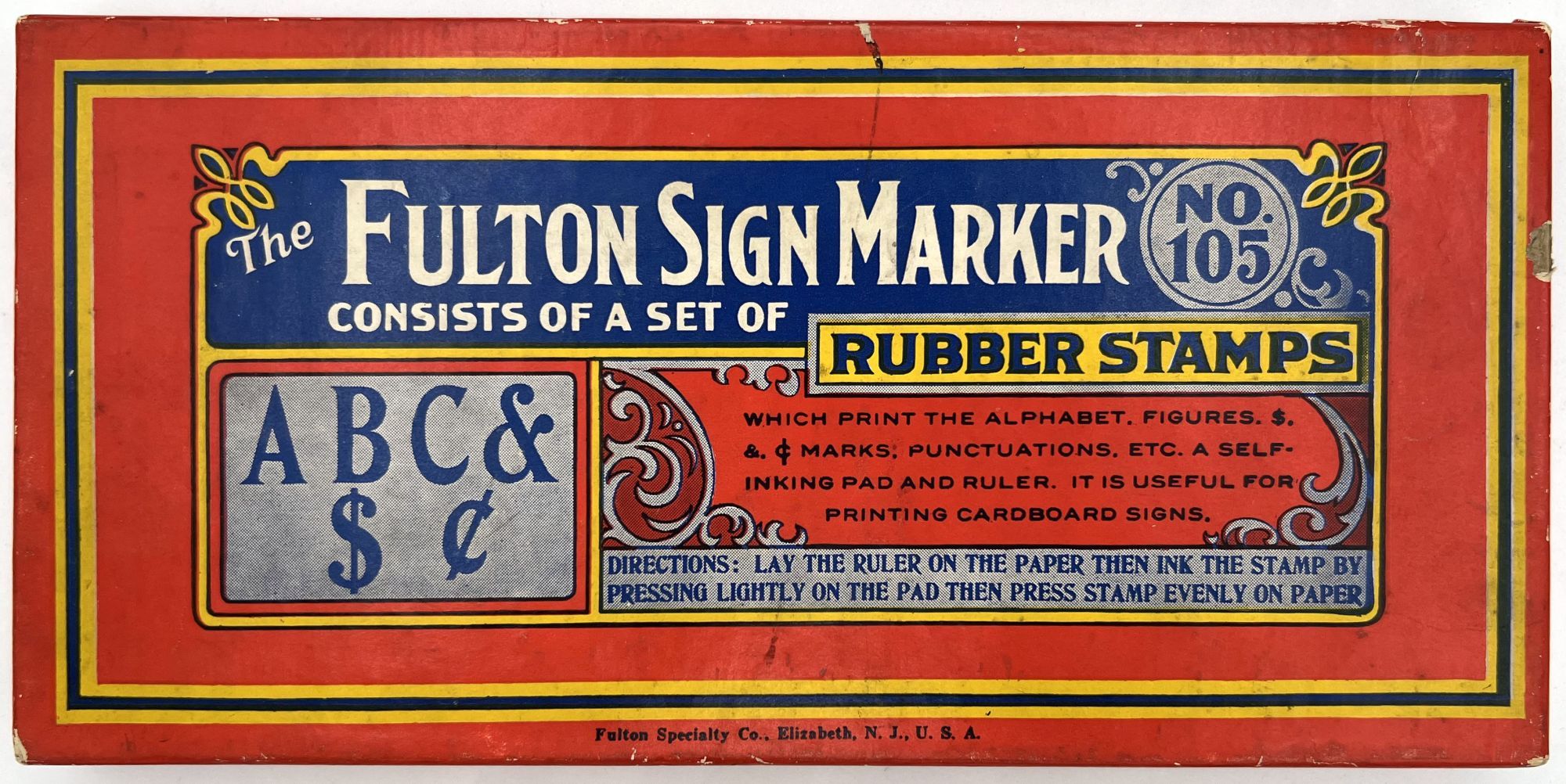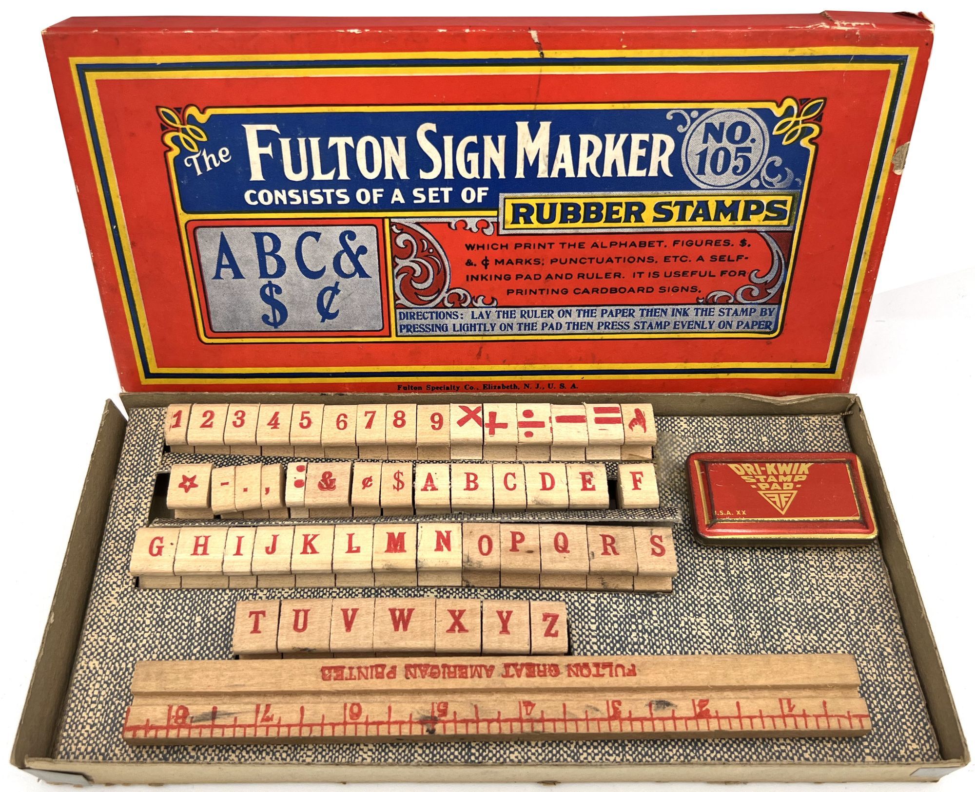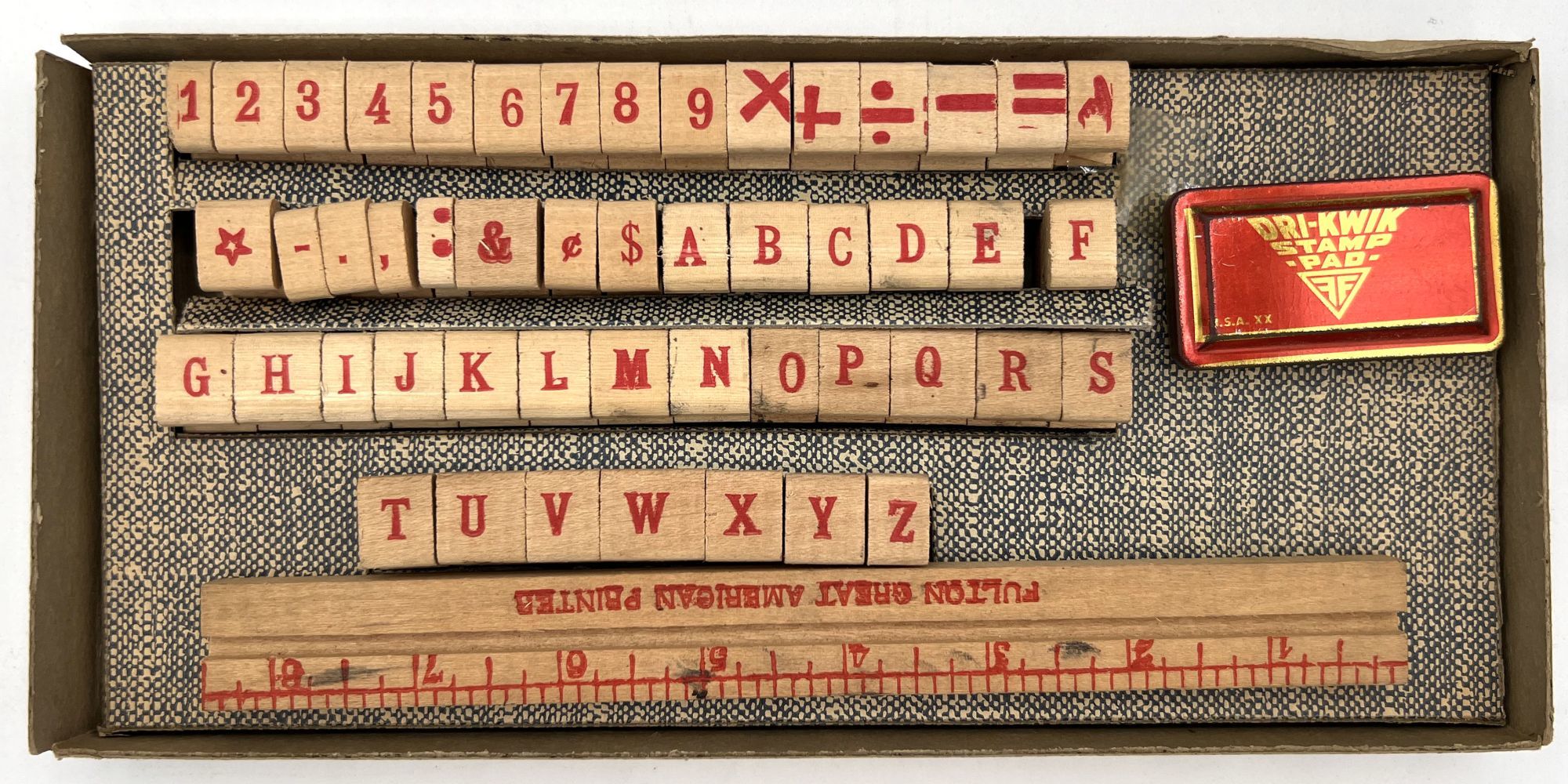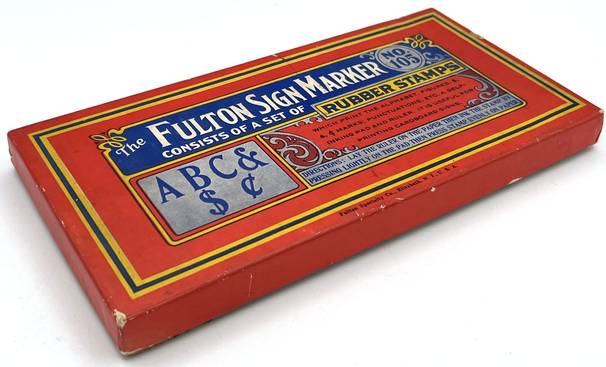 Elizabeth, New Jersey: Fulton Specialty Co, 1920. Very good. Some wear and minor dust soiling, tears to box and cardboard insert. Incomplete; lacking at least 1 stamp.. A set of ink stamps produced by Fulton, here in the original packaging. This set includes forty-nine (49) ink s tamps made of wood and rubber. Letters, numbers, punctuation, and miscellaneous characters are present, including a manicule and a star. Set also includes one small wooden ruler and a metal "Dri-Kwik" ink stamp pad.